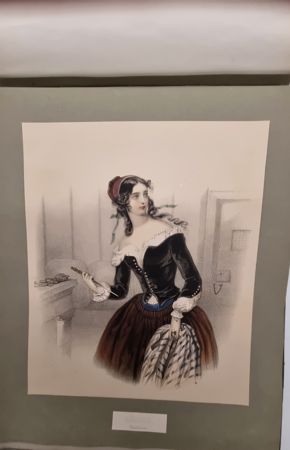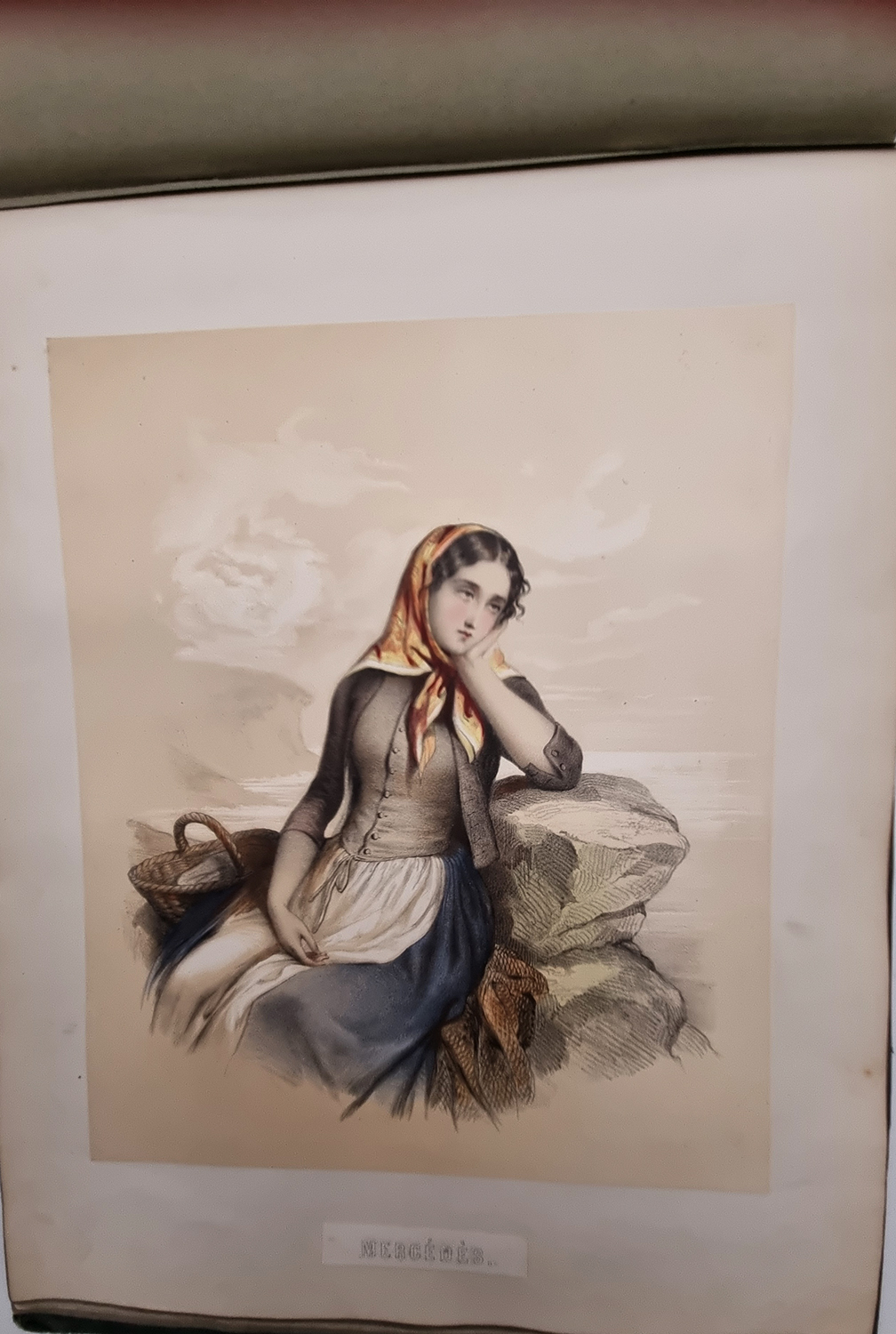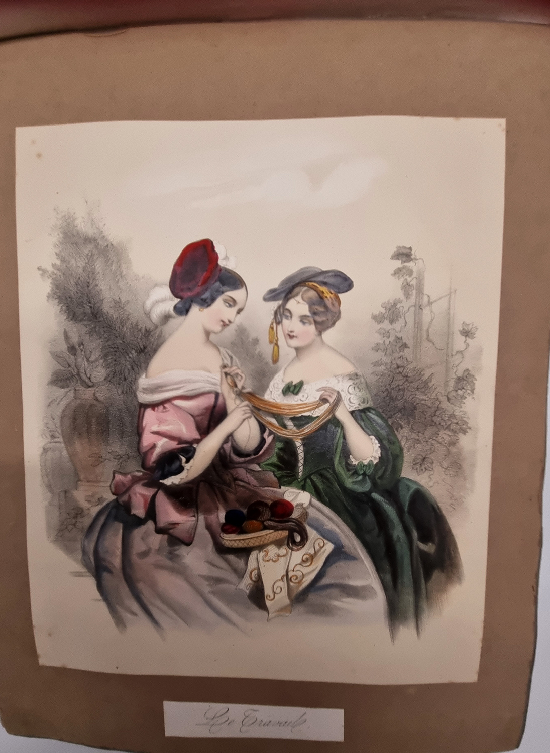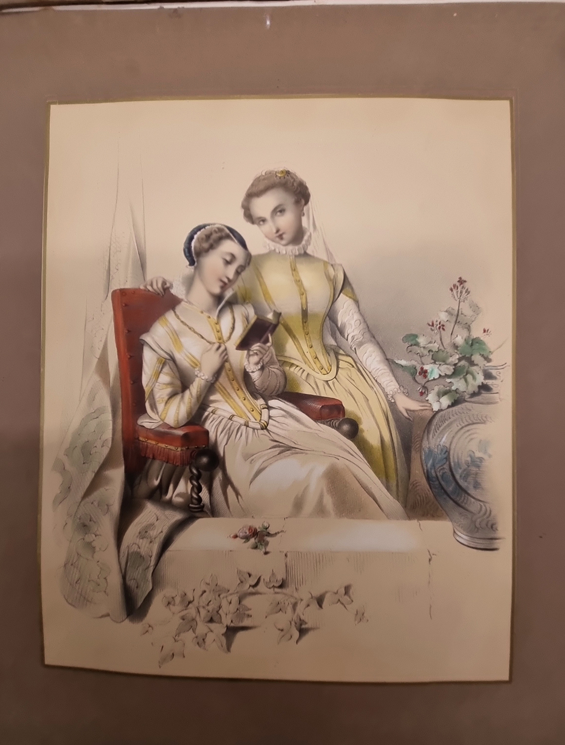 Frauen – Sammelalbum mit 60 großen und 4 kleinen Lithographien mit Frauendarstellungen, teils handcoloriert, teils farblithographiert, einige Chromolithographien. Ca. 1850er Jahre. Querformat, ca. 26 x 34 cm. Leineneinband mit Gold- und Blindprägung, mit Goldschnitt. U.a. mit 7 Lithographien von Auguste Bovier (ca. 1827-1881): Le Voile, La Musique, Le Perroquet, L’Ecrin, La Sultane, Les Poissons d’Or, Le Récit, Le Miroir; Lithographien von Joseph Bettanier (1817-1877): Cécily; Juive d’Alger en promenade; Sultane du Maroc – en promenade; Weitere Abbildungen u.a. bezeichnet als: Fatme – Persanne; Ines – Espagnol; Vasiliki Albanaise; Scheherezade (Turque); Daja – L’Indienne; Yanki – Chinoise; Le Travail; Le Gouter; La Toilette; Le Lever; La Chasse; La Presentation Louis XIV; La Rosiere Louis XV; Noblesse; Le Bain; Femme de Constantine – costume de Féte, Femme d’Alger – dans sou interieur; L’eau; Le feu; La terre; L’automne; Le printemps; L’Afrique; L’Amerique; L’Asie; Le matin; Le soir; Maichande de Ruban; M. de Joujoux; Parfumeuse, Patissiére; Haydée; Mercédés; Mme. de Villefort; Valentine; La comtesse Mac Grégor; J’aime – I love; Elle aimera – she will love; Aimante – loving; J’ai aimé – I have loved; Elle aimait – she did love; Die vier kleinen Lithographien (ca. 13 cm) zeigen Berthe, Hildegunde, Odette, Marguerite; Die Lithographien teils oval, teils rechteckig, Höhe meist ca. 25 cm, fest auf etwas dickerem Papier montiert, die Bildtitel teils unten mit anmontiert (jedoch ohne Künstlerangaben). Ein Blatt mit Fehlstelle im Trägerpapier, ein Blatt mit Einriss (jedoch ohne Beeinträchtigung der Abbildungen). Feine und sehr reizvolle seltene Lithographien mit Frauendarstellungen.