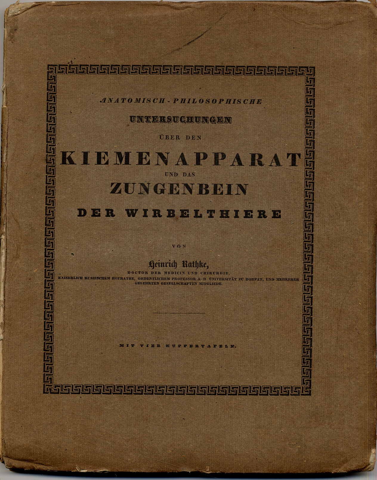 Rathke, Heinrich: Anatomisch-philosophische Untersuchungen über den Kiemenapparat und das Zungenbein der Wirbelthiere. Riga und Dorpat, Eduard Frantzen’s Buchhandlung, 1832. Ca. 30 x 23,5 cm VI S., 133 Seiten. Mit 4 Kupferstichtafeln. Orig.-Pappband. Rücken ohne Überzugspapier, Fadenbindung sichtbar. Besitzvermerk auf Titelblatt. Breitrandiges, unbeschnittenes Exemplar. Seitenränder gebräunt. Rathke (1793-1860, Embryologe). „R.s Forschungen zählen zu den herausragenden Arbeiten der vergleichenden Entwicklungsgeschichte. (Volker Hess in NDB 21, S. 180 ff).