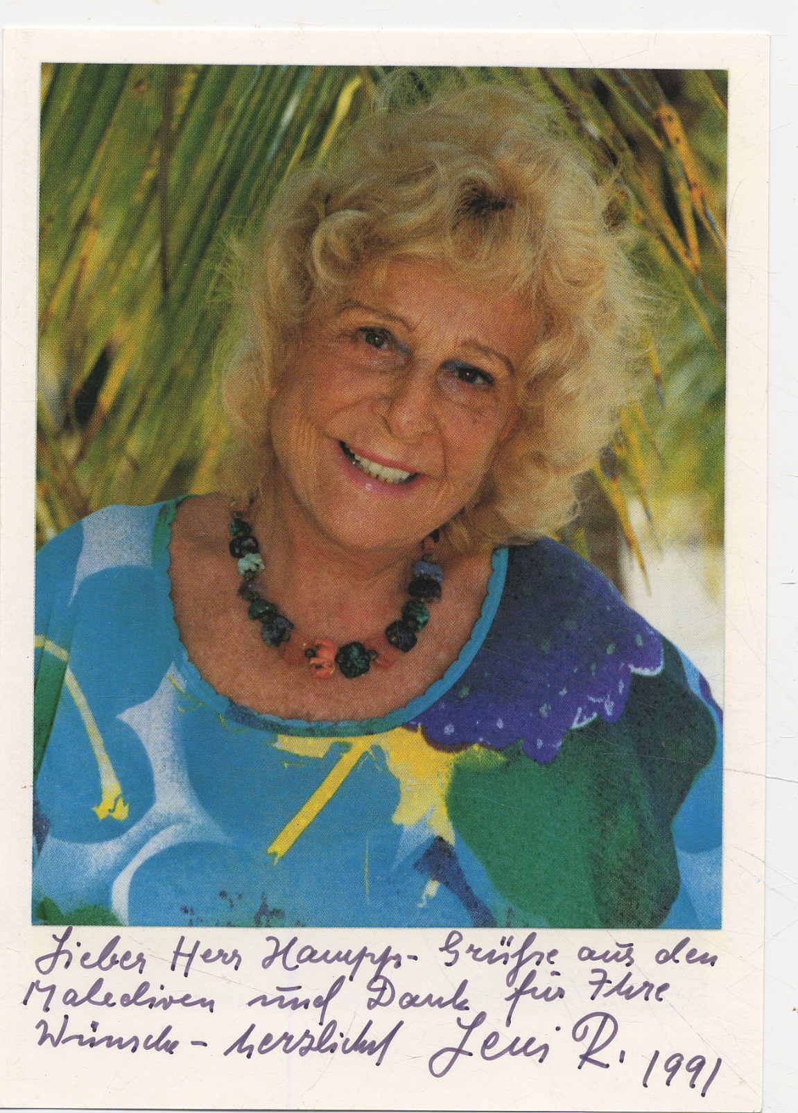 Riefenstahl, Leni (Helene Bertha Amalie „Leni“ Riefenstahl, 1902-2003, Filmregisseurin, Fotografin) Porträt mit eigenhändiger Widmung mit Unterschrift von Leni Riefenstahl, datiert 1991. Ca. 15 x 10,5 cm. Farbporträt Riefenstahls (rückseits mit Werbung für ihr Buch „Wunder unter Wasser“. „… Grüße aus den Malediven und Dank für Ihre Wünsche …“.