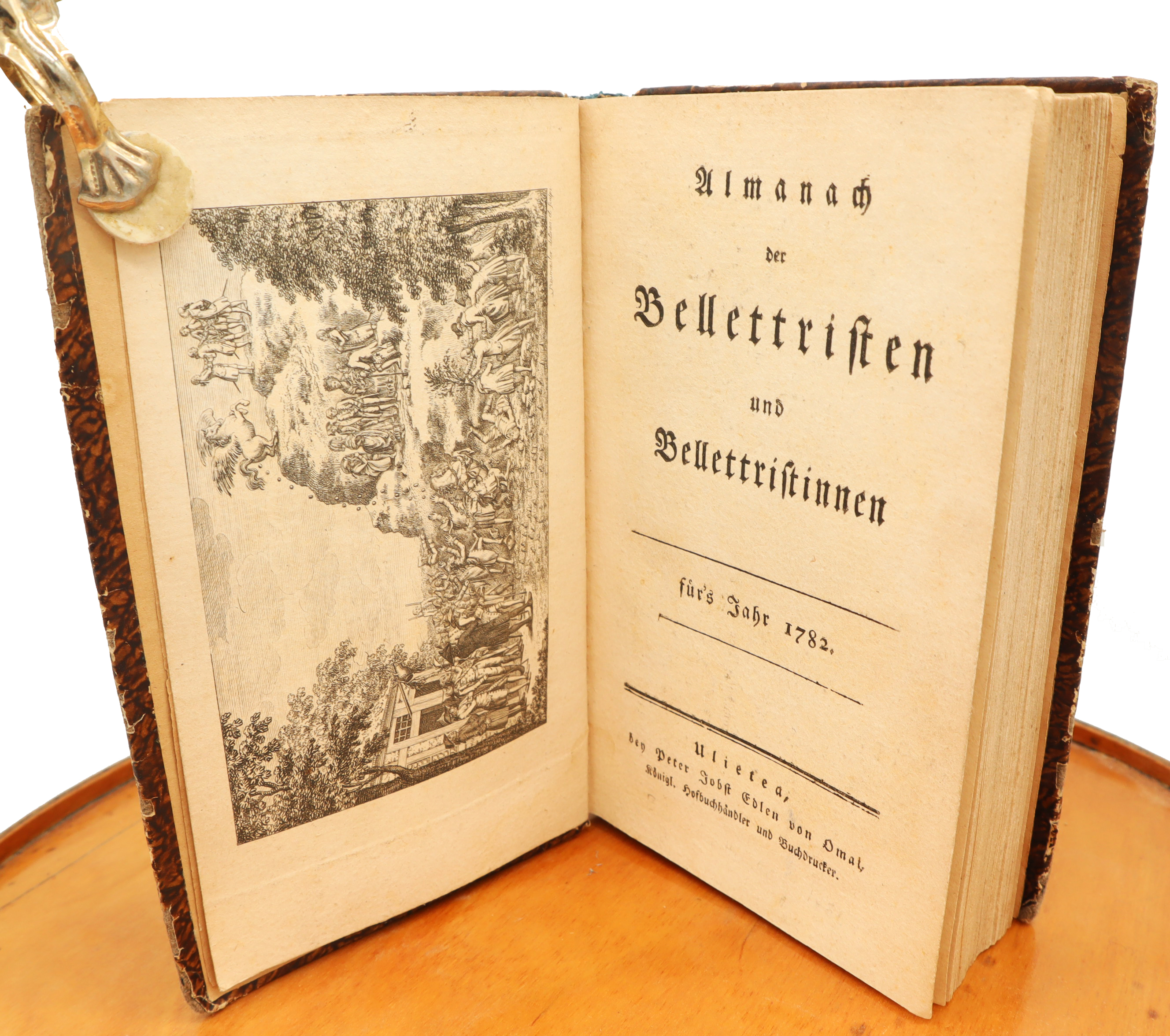 [Erbstein, K[arl] F[riedrich] W[ilhelm] und Fr[iedrich] Schulz, Hrsg.): Almanach der Bellettristen und Bellettristinnen für’s Jahr 1782. Ulietea (Berlin), Peter Jobst Edlen von Omai (Himburg), [1781]. Ca. 16,5 x 10,5 cm. (36) S., 224 Seiten. Mit gestochenem Frontispiz. Pappband der Zeit mit geprägtem Rückenschild. Köhring 9. Mit Exlibris. Kleine Besitzeintragungen auf Vorsatz (dieser am Falz leicht gelockert), sonst gutes Exemplar. Lanckoronska/Rümann 202: „Der literarische Bruder des Bahrdtschen Ketzer-Almanachs ist der von … herausgegebene Almanach der Bellettristen … In der Vorrede wird die Nachahmung zugegeben, aber betont, daß es besser sei, eine Schwangere versehe sich an einem hübschen, runden, rotbäckichten, muntren Jungen, als an einem krummen und lahmen, und daß eine gute Nachahmung auch Wert habe. … Die Berichte sind oft trocken, zuweilen anmaßend … Bemerkenswert sind nur die dem Kalendarium mitgegebenen Witterungsanzeigen. Da heißt es zu … Bürger „erschütternder Sturm, dann sanftes, liebliches Lüftchen“, zu Herder „Hals- und Beinbrüche“, zu Wieland „sanfte Stille, einwiegendes Frühlingsleben auf Zaubergefilden“. Das Rosmaeslersche Titelkupfer zeigt den Parnaß, auf dessen Gipfel vier Posen angelangt sind, während Pegasus sich bäumt und Äpfel niedergehen läßt, die von der Menge der deutschen Dichter begierig aufgefangen werden.“