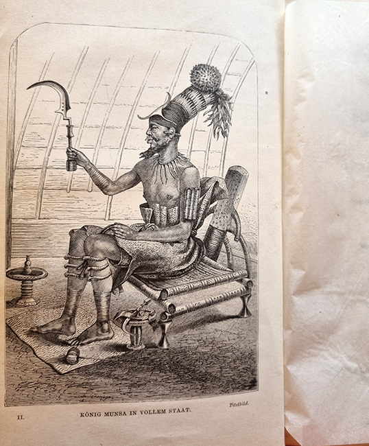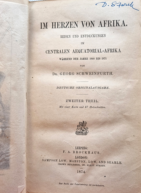 Schweinfurth, Georg: Im Herzen von Afrika. Reisen und Entdeckungen im Centralen Aequatorial-Afrika während der Jahre 1868 bis 1871. Deutsche Originalausgabe. 2 Bände. Leipzig und London, F.A. Brockhaus und Sampson Low, arwston, Low, and Searle, 1874. Ca. 22 x 13,5 cm. XIII S., 599 S., (3) Seiten, mit einer mehrfach gefalteten Karte, einer Farbendrucktafel und 77 Holzschnitten (teils auf Tafeln); XII S., (2) S., 561 Seiten, mit einer Karte und 47 Holzschnitten (teils auf Tafeln). Halbledereinbände der Zeit mit Rückengoldprägung. Erste Ausgabe. Embacher 265; Henze V, 113. Rücken etwas beschabt. Mit Geschenkvermerk auf Vorsatz, Namenszug (bzw. teilradiertem N.) auf Titelblatt. Seiten papierbedingt leicht gebräunt. Jedoch gutes Exemplar. „Klassischen Ruhm erwarb sich Sch. (1836-1925, Afrika-Forscher) durch seine in den Jahren 1868-71 ausgeführte Reise durch das weite Flußnetzgebiet des Bahr el-Ghasal, des linksseitigen größten Tributärs des Weißen Nil. … Sch. blieb es vorbehalten, die Grundlagen der wissenschaftlichen Kenntnis des Bahr el-Ghasal-Gebietes zu schaffen.“ (Henze).
