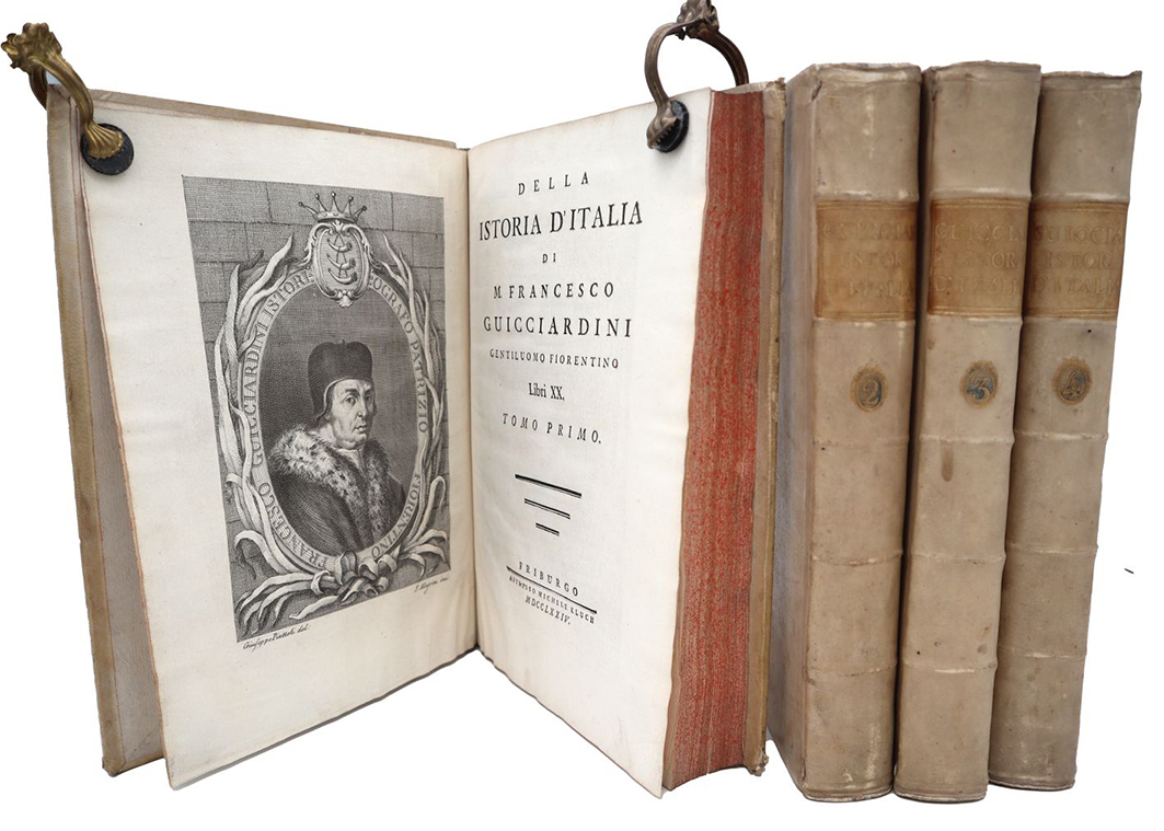 Guicciardini, Francesco: Della istoria d’Italia. Libri XX. 4 Bände. Friburgo (Freiburg), Michele Kluch, 1774-1776. Ca. 28 x 20,5 cm. 493 Seiten, mit einem Kupferstich-Frontispiz (Porträt); 487 Seiten; 474 Seiten; 418 S., LVIII Seiten; Pergamentbände der Zeit mit goldgeprägtem Rückenschild. Das umfangreiche geschichtliche Hauptwerk Gucciardinis (143-1540; italienischer Politiker und Historiker) beschreibt die Zeit 1492 bis in die 30er Jahre des 16. Jahrhunderts. Die erste vollständige Ausgabe erschien 1567 in Venedig. „G. schrieb die erste Geschichte des gesamten Italien, eingebettet in den größeren Zusammenhang des europäischen Staatengefüges, und zeigte damit die gleichzeitige und wechselseitige Abhängigkeit politischer Vorgänge überall auf dem europäischen Kontinent auf. … Seine geschickte, scharfsinnige und vorgeblich freimütige Verteidigung seiner politischen und militärischen Tätigkeit ist den Selbstrechtfertigungen abgedankter Politiker und Generäle aller Zeiten ebenbürtig.“ (Carter/Muir 85). Mit Exlibris. Vorsätze etwas fleckig. Gutes Exemplar in italienischer Sprache.