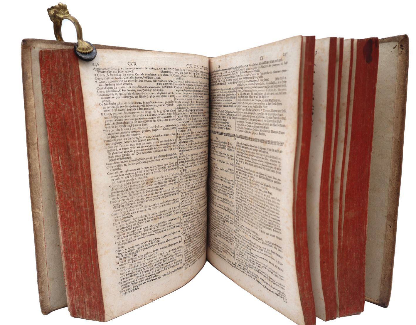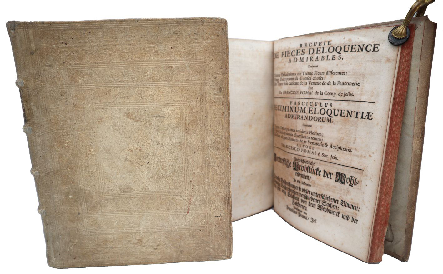 Pomai, Francois: Le grand dictionaire royal. I. Francois-Latin-Allemand; II. Latin-Allemand-Francois; III. Allemand-Francois-Latin. Edition septieme. Cologne & Francfort (Köln und Frankfurt), Servatius Noethen, 1740 Ca. 24,5 x 19,5 cm. (16) S., 984 (recte 980) Seiten, mit Kupferstich-Frontispiz; (2) S., 344 Seiten; (2) S., 355 Seiten; 64 Seiten. Geprägte Ledereinbände der Zeit mit Rückenschild. Der letzte Teil des Werkes behandelt u.a. die Falknerei: „Unterschiedliche Vortreffliche Probstücke der Wohlredenheit / In sich haltende I. Dreyssig Beschreibungen so vieler unterschiedener Blumen; II. Zwantzig Beschreibungen verschiedener Sachen; III. Ein sehr artig Büchlein von dem Weydwerck und der Falcknerey. Im ersten Band springt die Seitennummerierung 560 auf eine Spaltennummerierung 561, dann von Spalte 568 wieder auf Seitennummerierung 569. Seiten teils gebräunt bzw. etwas stockfleckig. Schön gebunden.