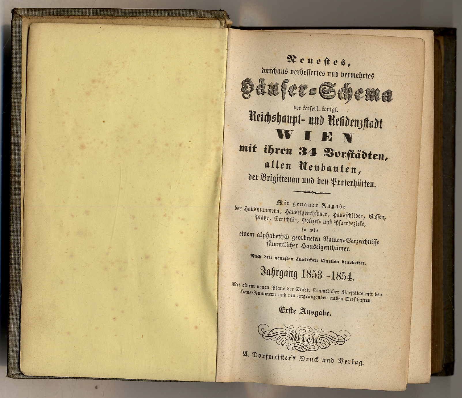 Wien – Neuestes, durchaus verbessertes und vermehrtes Häuser-Schema der kaiserl. königl. Reichshaupt- und Residenzstadt Wien mit ihren 34 Vorsätdten, allen Neubauten, der Brigittenau und den Praterhütten. Mit genauer Angabe der Hausnummern, Hauseigenthümer, Hausschilder, Gassen, Plätze, Gerichts-, Polizei- und Pfarrbezirke so wie einem alphabetisch eordneten Namen-Verzeichnisse sämmtlicher Hauseigenthümer. Nach den neuesten amtlichen Quellen bearbeitet. Jahrgang 1853-1854. Erste Ausgabe. Wien, A. Dorfmeister’s Druck und Verlag, 1853. Ca. 17 x 10 cm. XXIV S., 598 S., (2) Seiten. Leineneinband der Zeit mit reicher Rückengoldprägung. Wie so oft, fehlt auch hier leider der Plan. Rücken mit kleinem Einriss, Einband und Vorsätze etwas fleckig.