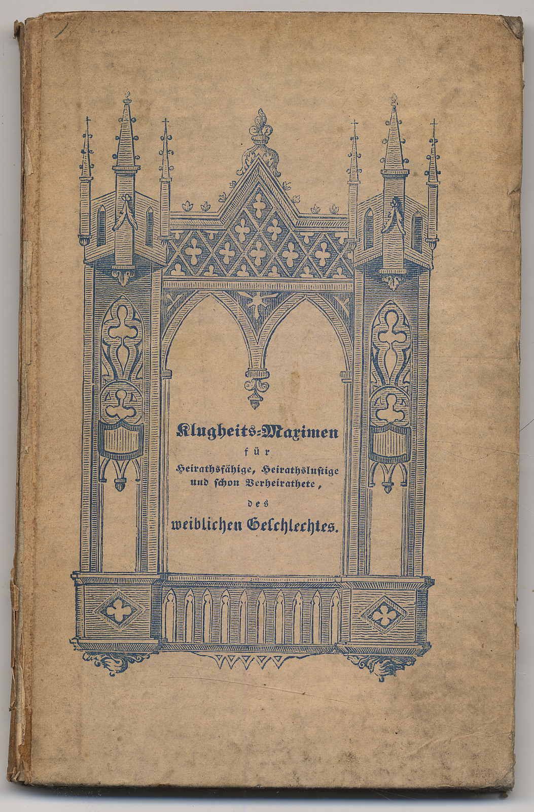 Karl, Johann: Klugheits-Maximen für Heirathsfähige, Heirathslustige und schon Verheirathete des weiblichen Geschlechtes. Wien, Leopold Grund, 1840. Ca. 18,5 12 cm. IV S., (2) S., 130 Seiten. Illustrierter Orig.-Pappband. Rücken und Kanten stark bestoßen. Einband fleckig. Enthält u.a.: Häusliches Glück; Betrachtungen vor der Wahl eines Gatten; Geistige Eigenschaften; Kluge Mäßigung in den ehelichen Freuden; Die Gattin erkenne den Gatten als Herrn im Hause, dem sie Gehorsam schuldig ist; Mittel, wie das in seinen Grundfesten etwas erschütterte, schon locker gewordene, und zu wanken drohende Glück der Ehe neuerdings mehr und mehr befestigt, und die schon gänzlich verloren gegangene Ruhe und Eintracht im häuslichen Leben wieder erlangt werden könne.