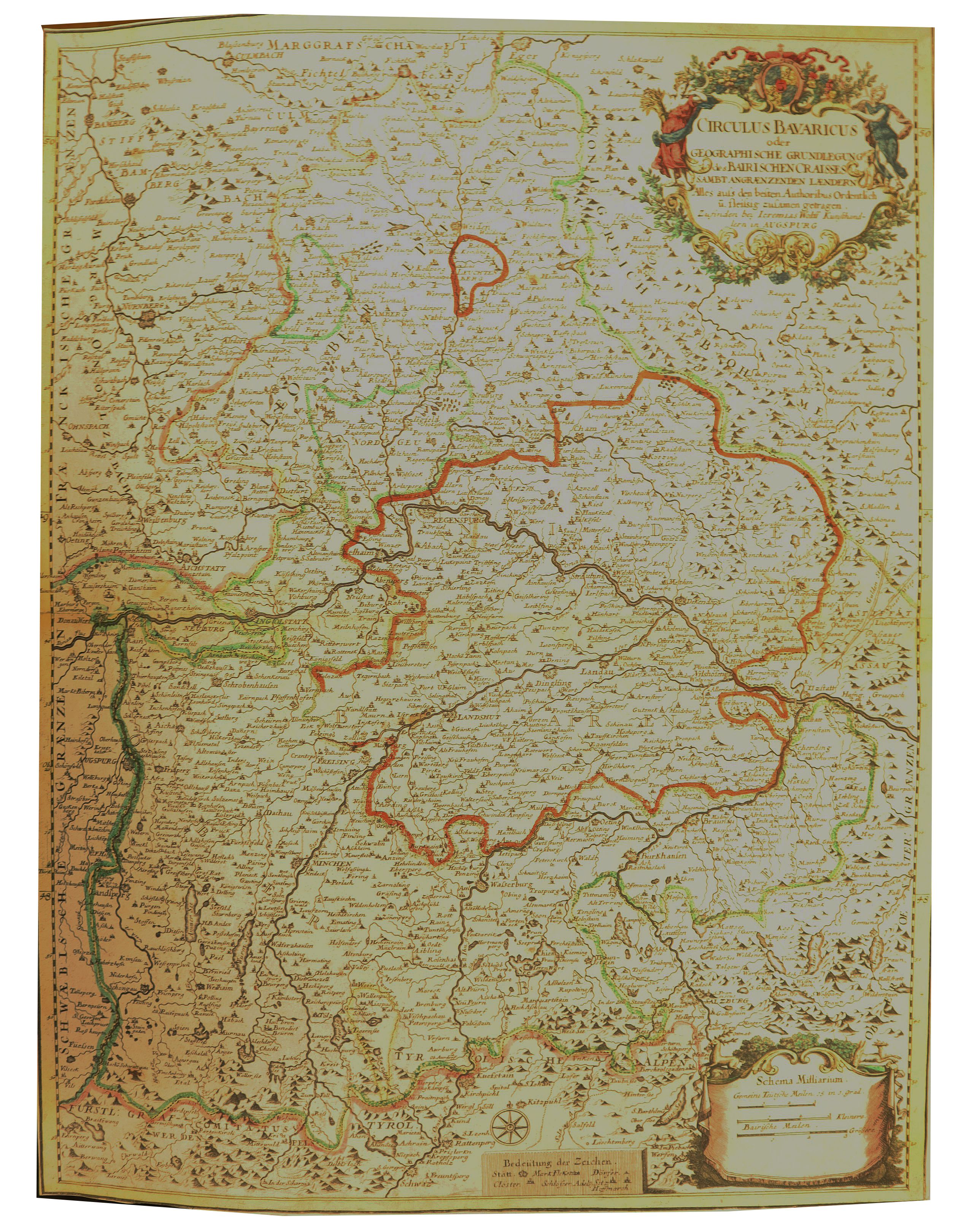 Wolff – Circulus Bavaricus oder geographische Grundlegung des bairischen Craises sambt angryenzenden Laendern. Alles aus den besten Authoribus Ordentlich u. fleissig zusamen getragen. Augspurg (Augsburg), Jeremias Wolff, um 1710. ca. 58 x 44 cm. Grenzcolorierte Kupferstich-Karte auf festem Papier. Mit altem Grenzcolorit. Mittig gefaltet. Erste Ausgabe dieser Karte, bei Jeremias Wolff (1663-1724). Oben rechts mit Titelkartusche, rechts unten Zeichenerklärung und Meilenanzeiger. Sehr dekorative Karte im kräftigen Colorit.