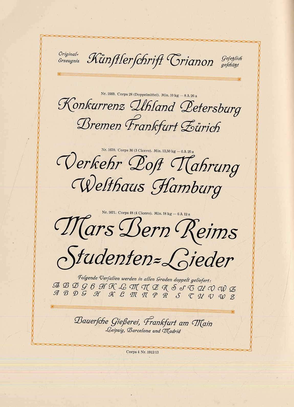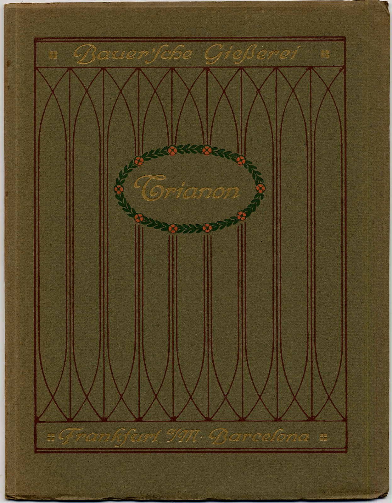 Wieynk, Heinrich: „Trianon“ Schriften und Schmuck nach Zeichnungen von Heinrich Wieynk. Bauersche Gießerei. Frankfurt am Main, ca. 1913. Ca. 29,5 x 23 cm. (32) Seiten mit teils farbigen Beispielen. Farbig illustrierter Orig.-Karton. Hinterdeckel gelocht und mit Knick, sonst sehr gutes Exemplar. Beigefügt der gedruckte Hinweis, dass die „in dieser Probe genannten Grundpreise“ ungültig sind.