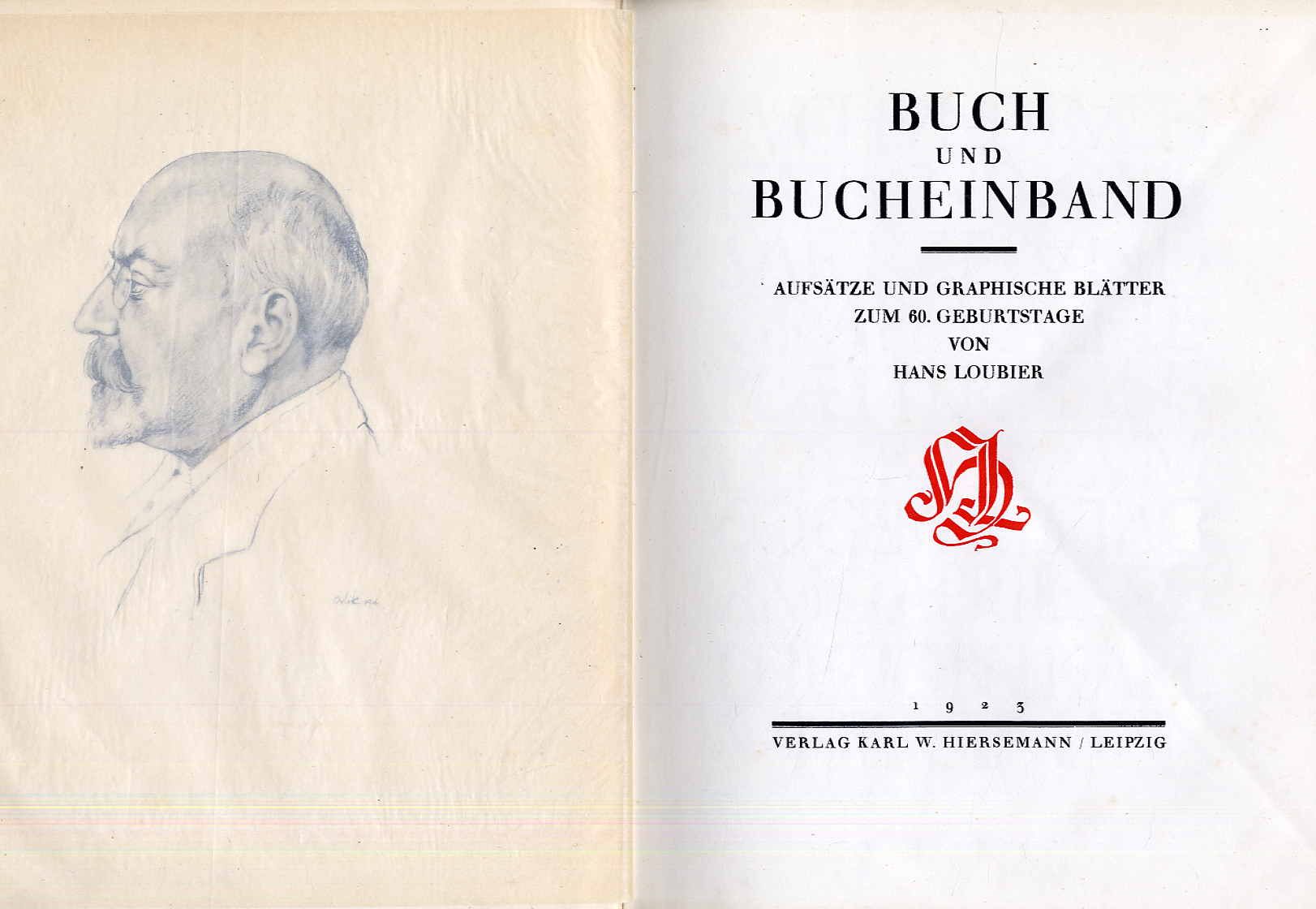 Loubier, Hans: Buch und Bucheinband. Aufsätze und graphische Blätter zum 60. Geburtstage. Leipzig, Karl W. Hiersemann, 1923. Ca. 31,5 x 24,5 cm. XII S., (16) S., 212 S., (2) Seiten. Mit 8 graphischen Blättern und zahlreichen Illustrationen, teils auf Tafeln (darunter 3 farbige). Orig.-Halbpergamentband. Einbanddeckel zum Rand hin stärker berieben. Einige Seiten am Rand leicht fleckig. Mit einer Strichätzung von Emil Rudolf Weiß, einer Original-Radierung von Marcus Behmer, einer Original-Radierung von Heinrich Wolff „Schwestern“, Strichätzung von Fritz Hellmut-Ehmcke, Original-Holzschnitt von Emil Rudolf Weiß.
