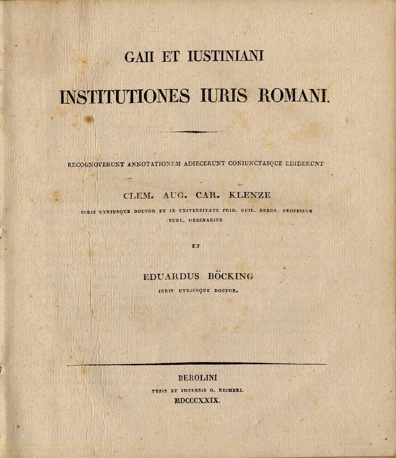 Klenze, Clem[ens] Aug[ust] Car[l] und Eduard Böcking: Gaii et iustiniani institutiones iuris Romani. Recognoverunt annotationem adiecerunt coniunctasque ediderunt. Berlin, Reimer, 1829. Ca. 24 x 20,5 cm. XV S., 292 S., (2) Seiten. Pappband der Zeit. Einbandkanten etwas bestoßen. Seiten teils etwas braunfleckig. Text in Latein.