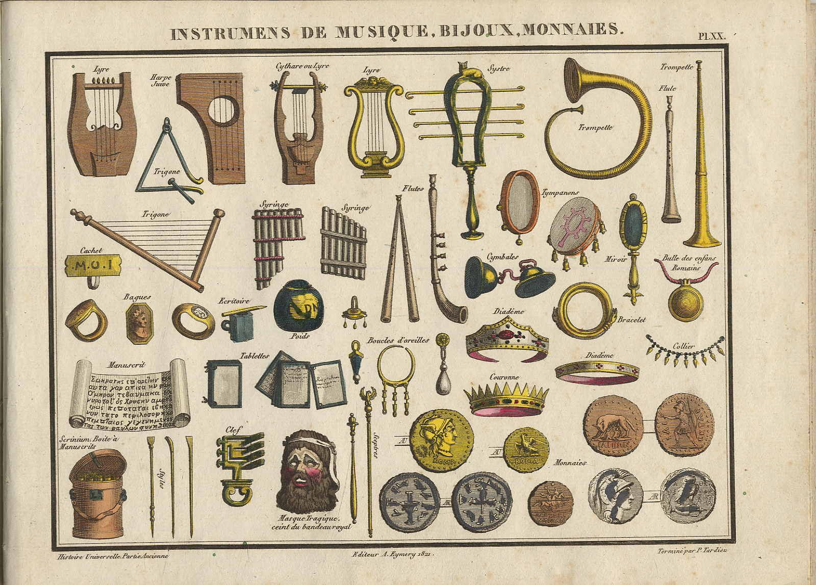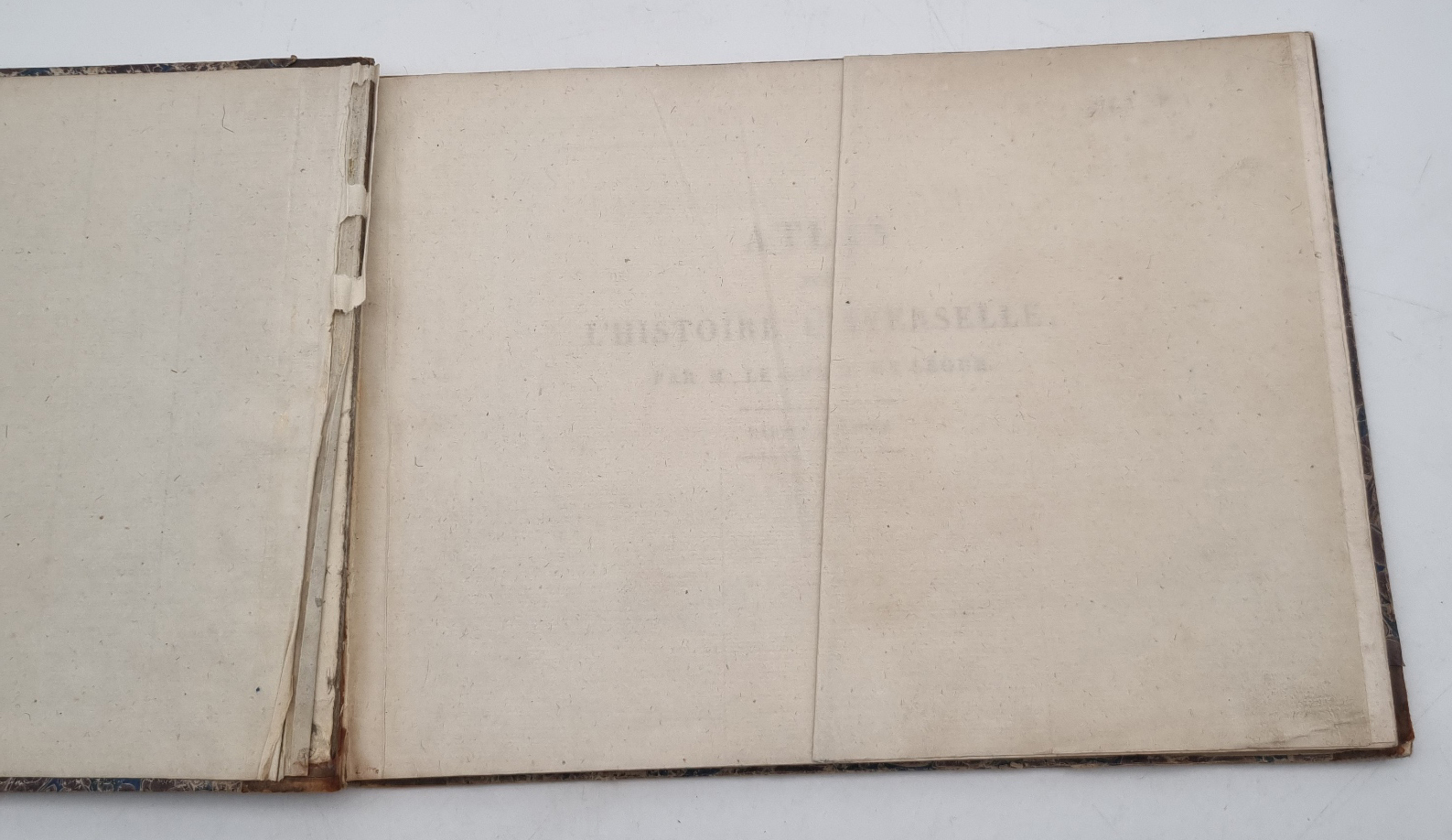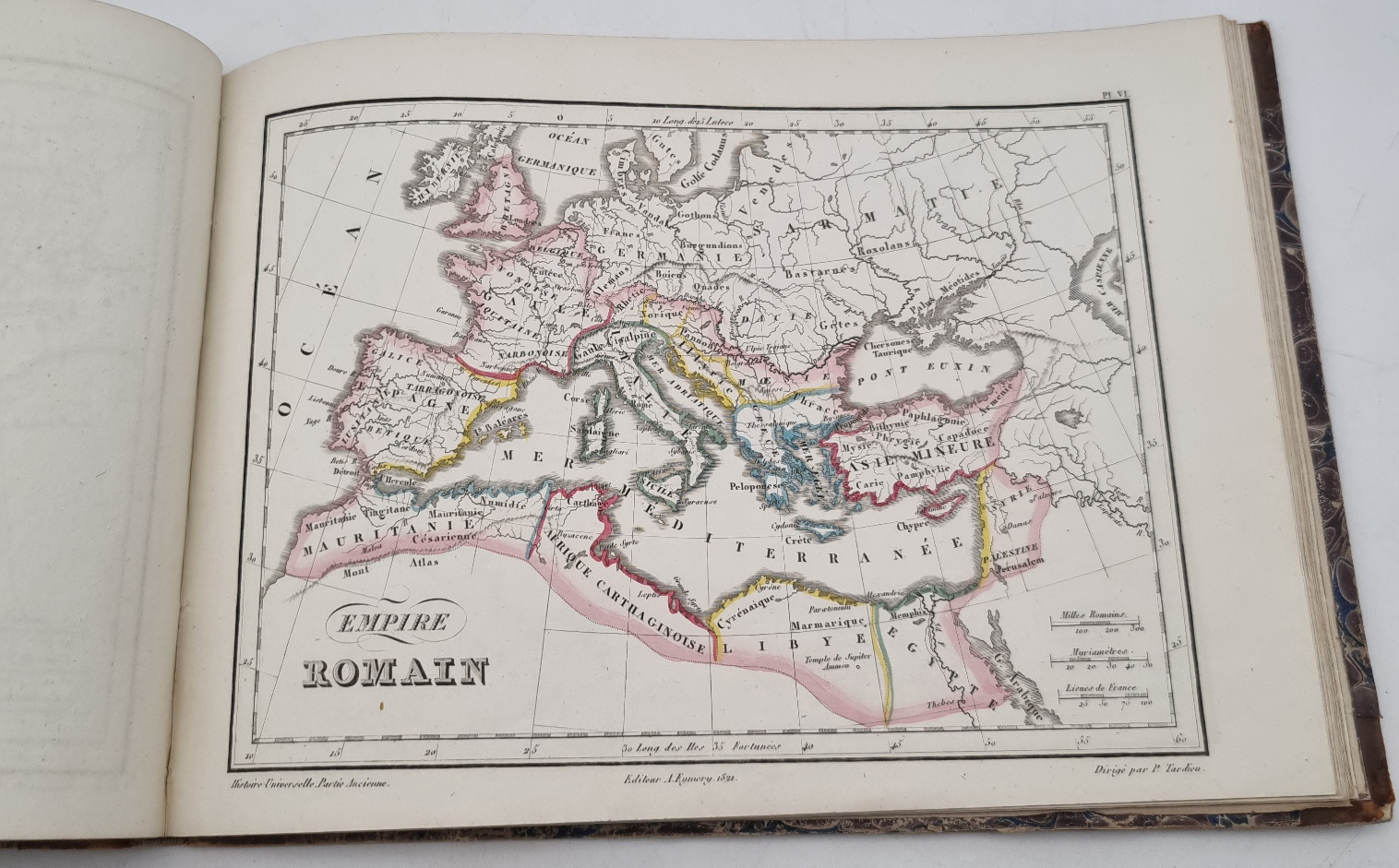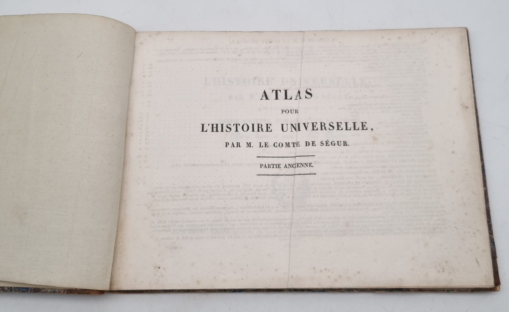 Ségur, [Louis-Philippe de]: Atlas pour l’histoire universelle. Partie Ancienne, Romaine et du Bas-Empire. Dirigé, dessiné et gravé par P[ierre A.F.] Tardieu. Avec le texte explicatif. Paris, Alexis Emery, 1822. Querformat, ca. 19 x 26,5 cm. 23 Seiten Text, 20 handcolorierte Kupferstichtafeln von Pierre A. F. Tardieu. Halblederband der Zeit. Einband berieben und bestoßen. Das Vorsatzblatt am Falz teils gelöst. Weißes Blatt und Vortitel mit Knick. Textseiten stockfleckig, die Tafeln sauber und schön und in kräftigen Farben coloriert. Die Tafeln zeigen Karten, Iconographie, Tracht/Kostüme, Bauwerke, Monumente, Statuen, Waffen, Fahrzeuge, Möbel, Musikinstrumente.