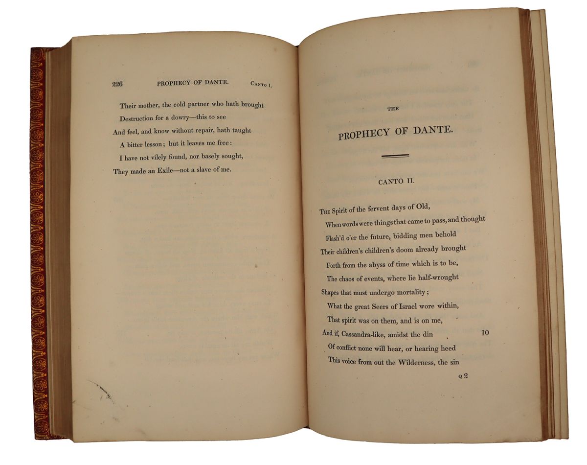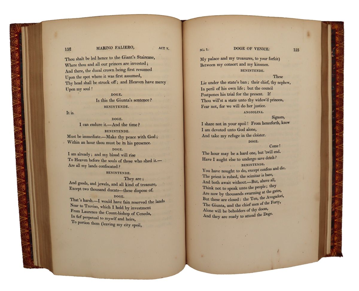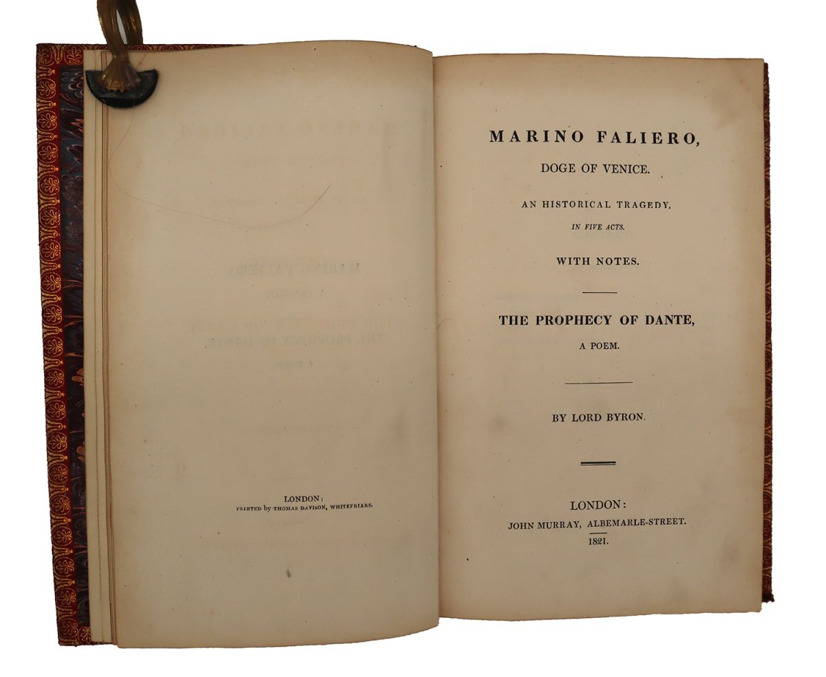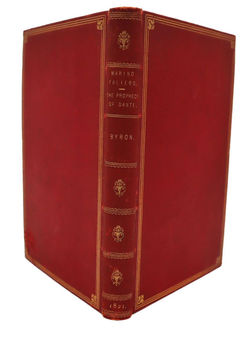 Byron, [George Gordon]: Marino Faliero. Doge of Venice. An historical tragedy in five acts. With notes. The prophecy of Dante. A Poem. London, John Murray, 1821. Ca. 21 x 13,5 cm. (8 weiße Seiten), XXI S., 261 S., (1) Seite, (1 weiße Seite), 1 Seite „Poems …“, (8 weiße Seiten). Roter Saffianledereinband mit Rückengoldprägung, Deckelfileten und Innenkantenvergoldung. Goldschnitt. Erste Ausgabe der 1. Fassung (siehe Merkmale bei Wise S. 29/30). Rücken minimal bestoßen. Mit handschriftlicher Widmung (datiert 1903) auf einem der weißen, vorgebundenen Blättern. Seiten teils etwa stockfleckig (einige Seiten auch stärker), einige Seiten mit leichtem Eckknick. In englischer Sprache. Dekorativer Einband.