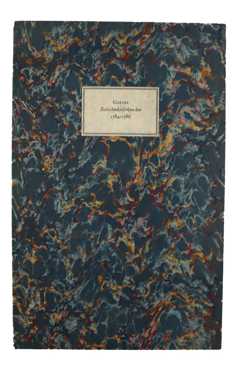 Goethe, [Johann Wolfgang v.]: Abhandlung vom Zwischenkieferknochen 1784/186. München, Moos-Verlag, 1968. Ca. 42,5 x 27 cm. 37 S., (3) Seiten. Mit Illustrationen von Imre Kocsis. Orig.-Pappband. Ex. 169/350, von Wilkes handschriftlich signiert. Zweiter Pressendruck zur Geschichte der Naturwissenschaften des Heinz Moos Verlages, München. Gesetzt aus der Garamont der Schriftgießerei Deberny & Peignot, Paris auf handgeschöpftem englischen Büttenpapier gedruckt. Das Initial zeichnete Herbert Post. Buchgestaltung Walter Wilkes. Der Text wird hier nach Goethes Erstveröffentlichung in den Morphologischen Heften (1820) abgedruckt, ergänzt durch den Vergleich mit der Originalfassung der Abhandlung, wie sie in der Prachthandschrift aus 1784 im Goethe- und Schiller-Archiv in Weimar erhalten ist. Die Schädel us den Tafeln der Prachthandschrift hat Imre Kocsis nach Originalschädeln neu gezeichnet.