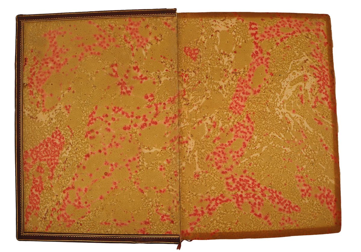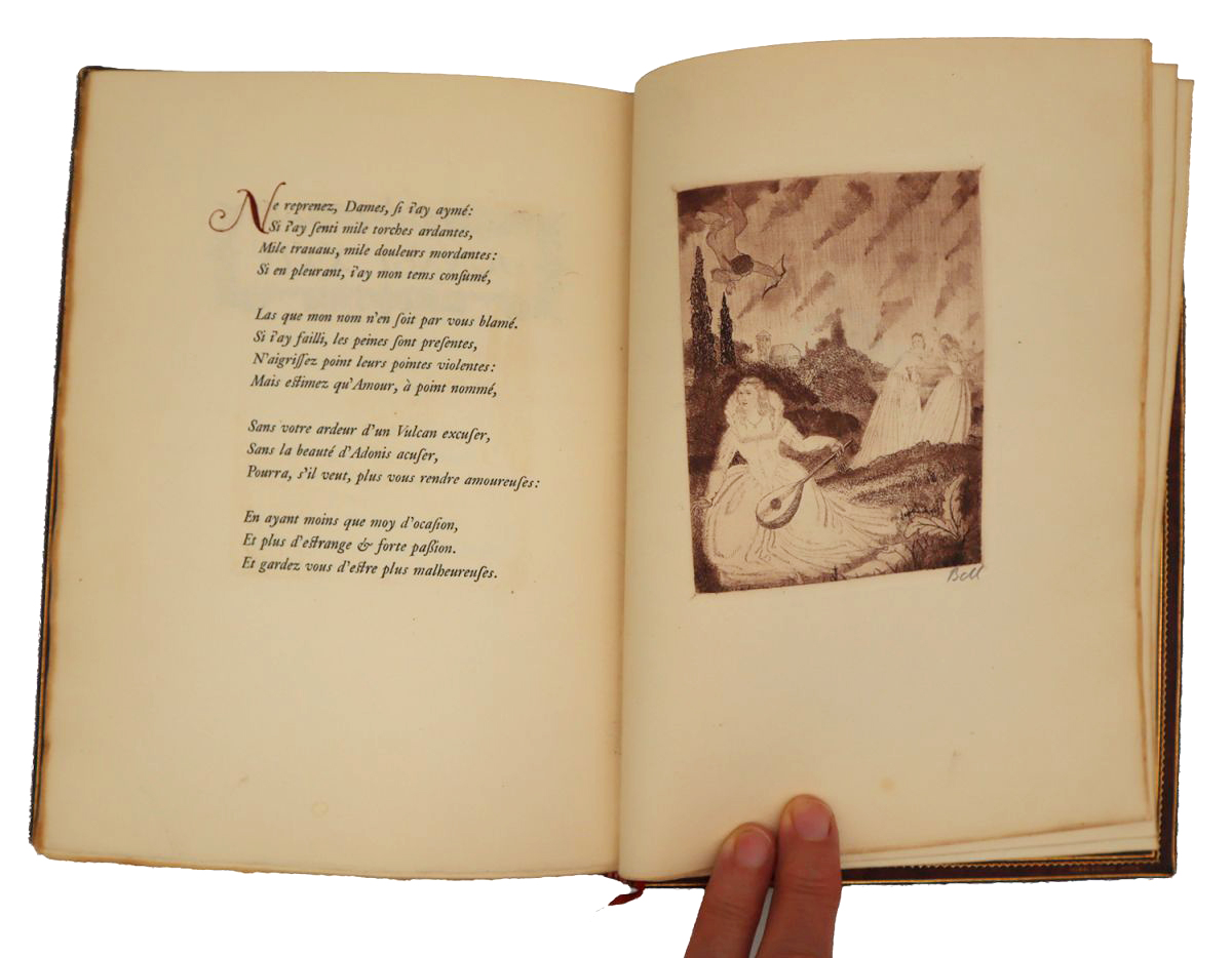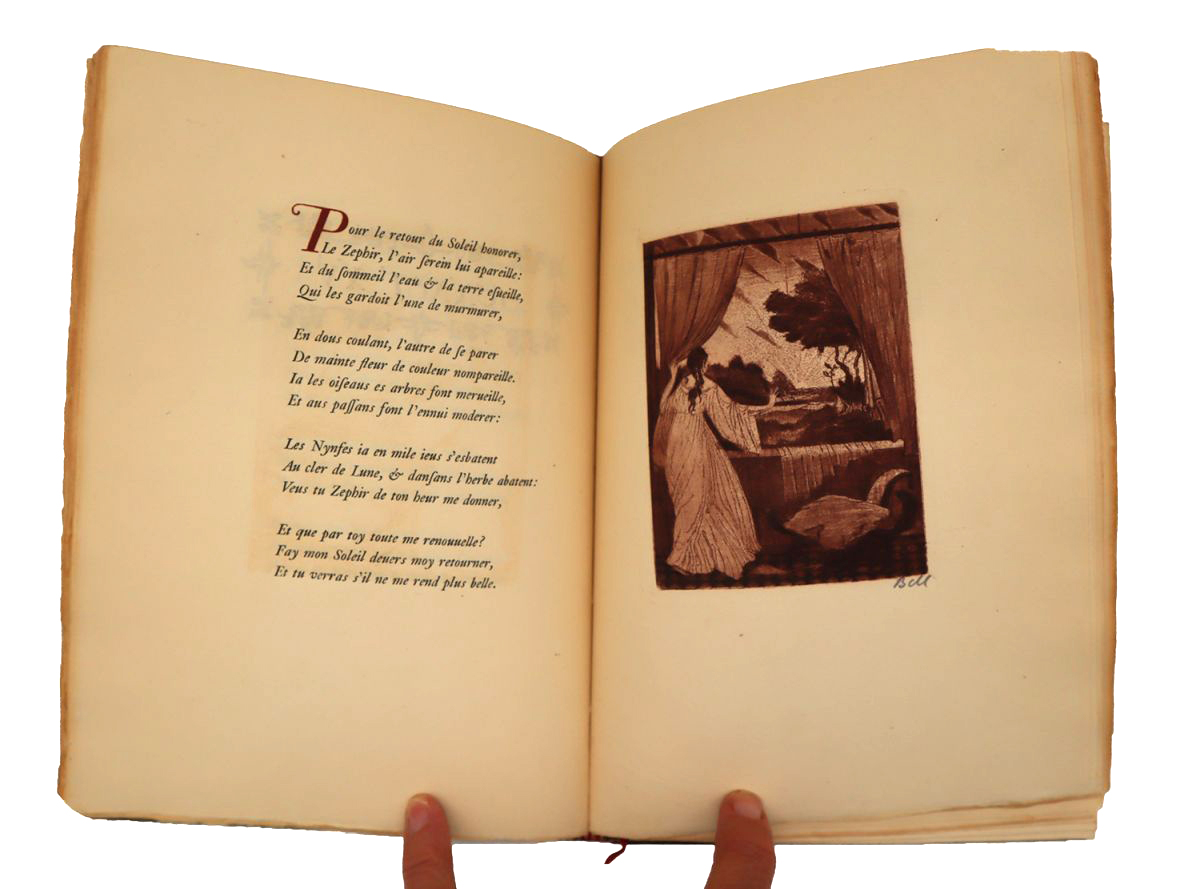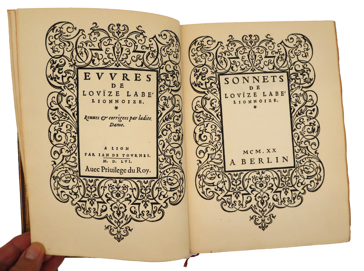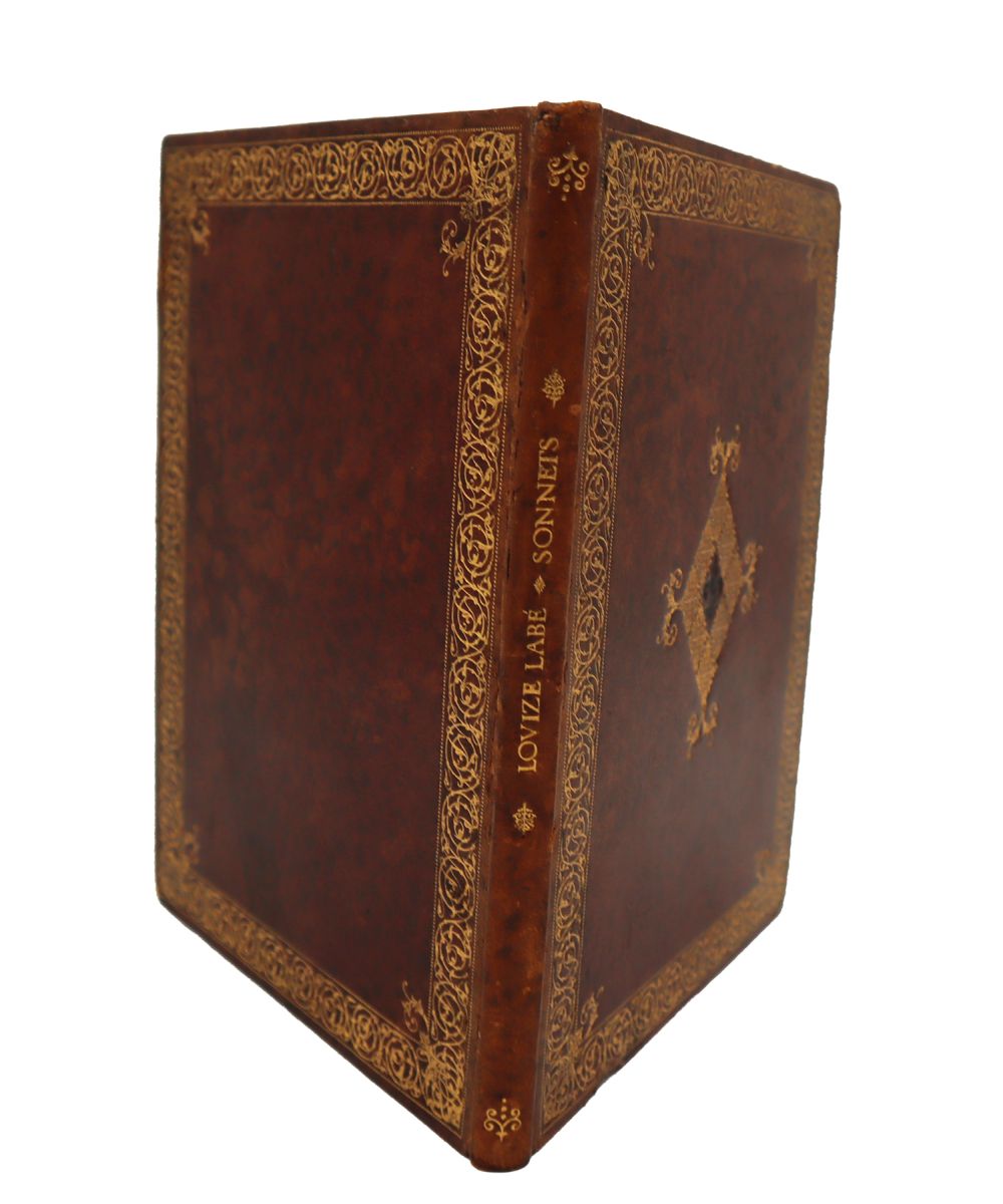 Labé, Louise: Sonnets de Lovize Labé Lionnoize. Berlin, Euphorion, 1920. Ca. 22,5 x 16 cm. (6) weiße S., (66) S., (8) weiße Seiten. Mit 6 ganzseitigen signierten Originalradierungen und 24 Zwischentitel-Illustrationen in Rötel von Bob Bell. Original-Ganzledereinband mit reicher Deckelvergoldung und Innenkantenvergoldung. Kopfgoldschnitt. Einband signiert „Euphorion Einband“. Exemplar Nr. 14/100 der Vorzugsausgabe. Farbige Vorsätze, am Rand etwas gebräunt. Französischer Text nach der Ausgabe Lyon 1556. Doppel-Titelrahmen nach Renaissance-Vorbild, Zwischentitel-Dekorationen nach alten Vorbildern. Die sechs Radierungen sind signiert und die Ausgabe ist dekorativ in Leder gebunden. Gutex Exemplar. Beigefügt:} Die vierundzwanzig Sonette der Louize Labé, übertragen von Rainer Maria Rilke, München 1952, französisch-deutsche Parallelausgabe.