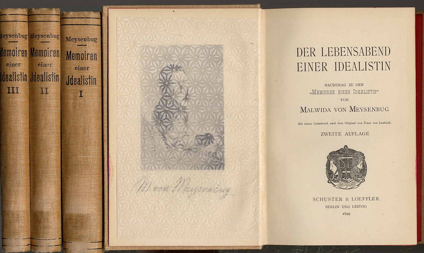 Meysenbug, Malwida von: Memoiren einer Idealistin (3 Bände) sowie Nachtragsband: Der Lebensabend einer Idealistin. 4. und 2. Auflage. 3 Bände und Nachtragsband. Berlin und Leipzig, Schuster und Loeffler, 1899 Ca. 18,5 x 12,5 cm. XXIV S., 399 S.; (8) S., 322 S.; 298 S., (2) S., (10) S., 475 Seiten, mit einem Titelporträt. Orig.-Leinenbände. Gutes Exemplar. Meysenburg (1816-1903, Schriftstellerin), erlebte 1848 in Frankfurt die Revolution und setzte sich später für die Rechte der Frauen ein. Während ihres Exils in London und Paris verkehrte sie in bedeutenden künstlerischen und politischen Kreisen und gründete 1853 in London den „Club deutscher Arbeiter“. Nach ihrer Rückkehr nach Deutschland wurde sie enge Vertraute von Wagner und Nietzsche, und in Rom fand sie schließlich ihre zweite Heimat. „… geben eine lebendige Vorstellung vom Vormärz in Deutschland und dem Leben der Emigranten in England. 1898 fügte M. dieser … in drei Bänden erschienenen – Darstellung als „Nachtrag“ einen Band mit dem Titel „Der Lebensabend einer Idealistin“ an, der die Zeit bis 1898 umfaßt und im Austausch mit ihrem exklusiven Freundeskreis in Italien gewonnene philosophische Betrachtungen und Reflexionen wiedergibt.“ (Hiltrud Häntzschel in NDB 17, 407 ff).