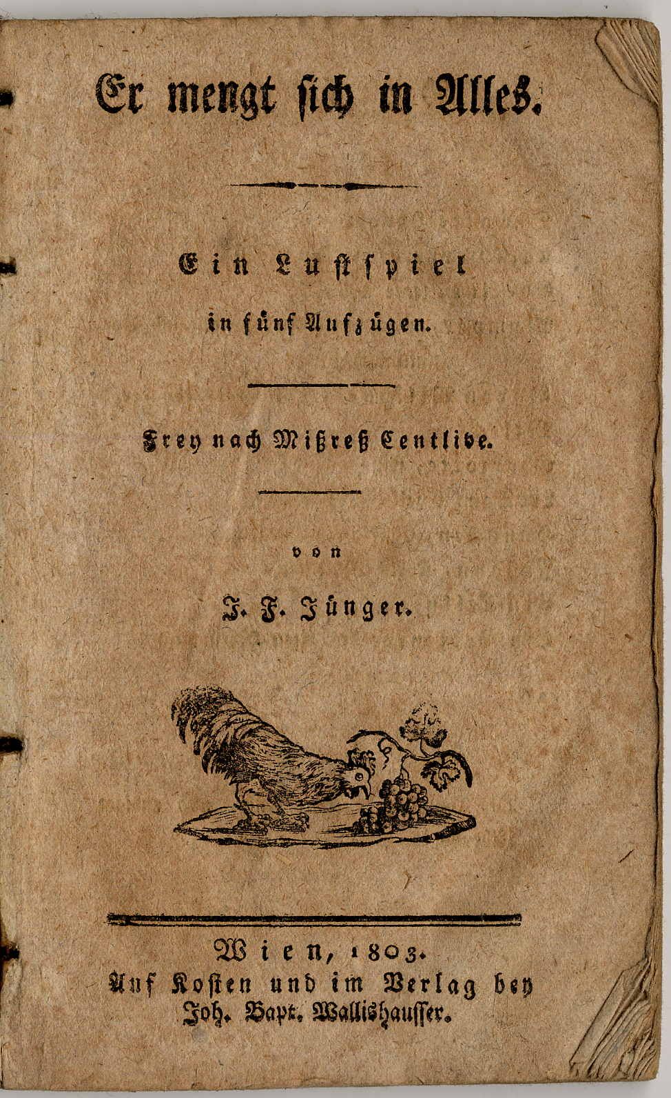 Jünger, J[ohann[ F[riedrich]: Er mengt sich in Alles. Ein Lustspiel in fünf Aufzügen. Frey nach Mistreß Centlive. Wien, Joh. Bapt. Wallishausser, 1803. Ca. 18,5 x 10 cm. 94 S., (2) Seiten. Illustrierter Originalbroschur mit Doppelalder (zweifarbiger Schablonendruck). Rücken und Kanten bestoßen. Seiten gebräunt und teils stockfleckig und an den Ecken mit Knicken.