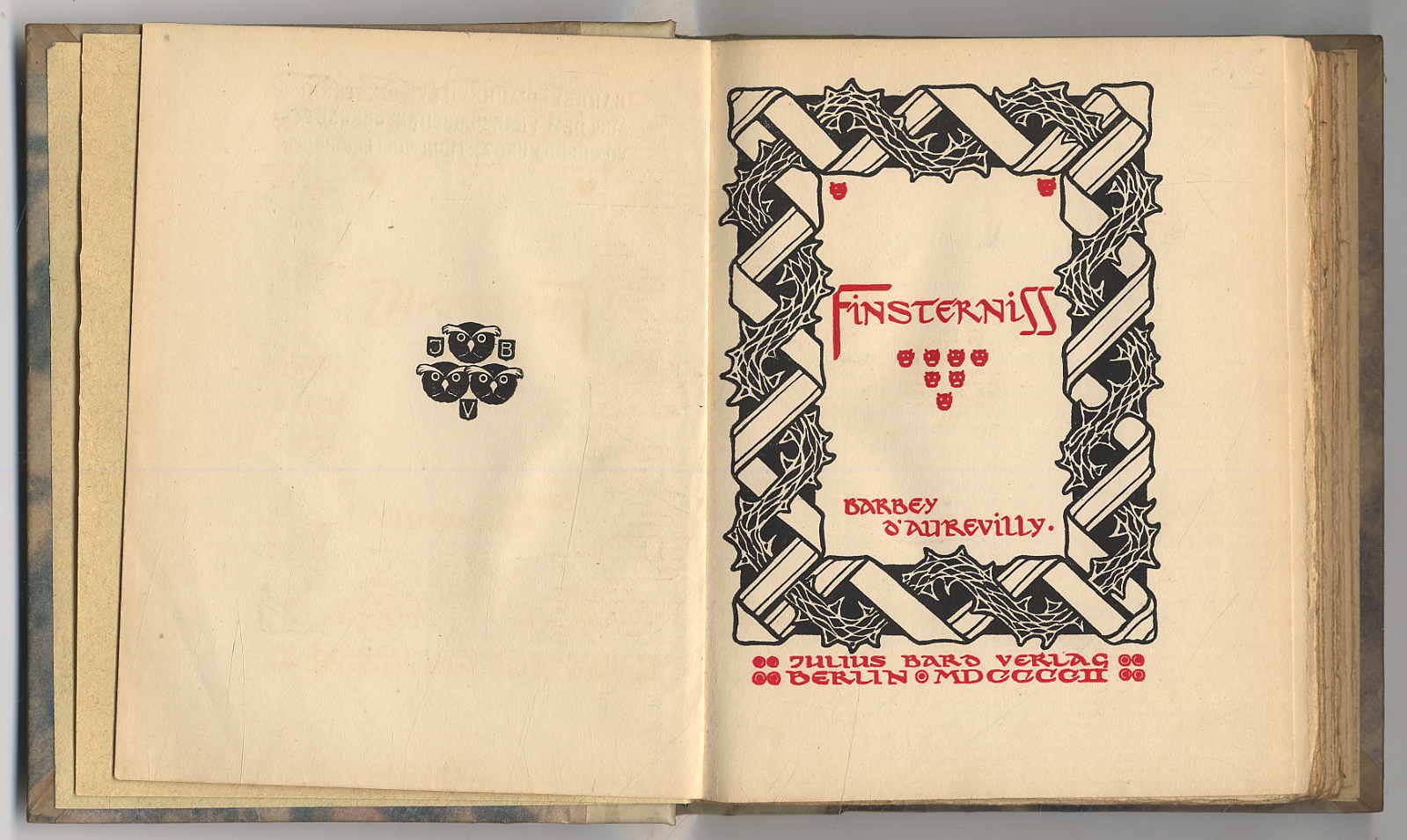 Barbey D’Aurevilly, [Jules Amédée]: Finsterniss. Übertragen und hrsgg. von Hedda u. Arthur Möller-Bruck. Berlin, Julius Bard, 1902. Ca. 16,5 x 14 cm. (4) S., 210 S., (2) Seiten. Buchschmuck von Georg Tippel. Halbpergamentband. Vorsätze erneuert. Auf Papier von Berthold Siegismund, die Nachbildungen der Zeichnungen in Zinkätzung hergestellt in der chemographischen Anstalt von Fischer u. Dr. Bröckelmann in Berlin. Mit reizendem Buchschmuck in rot und schwarz.