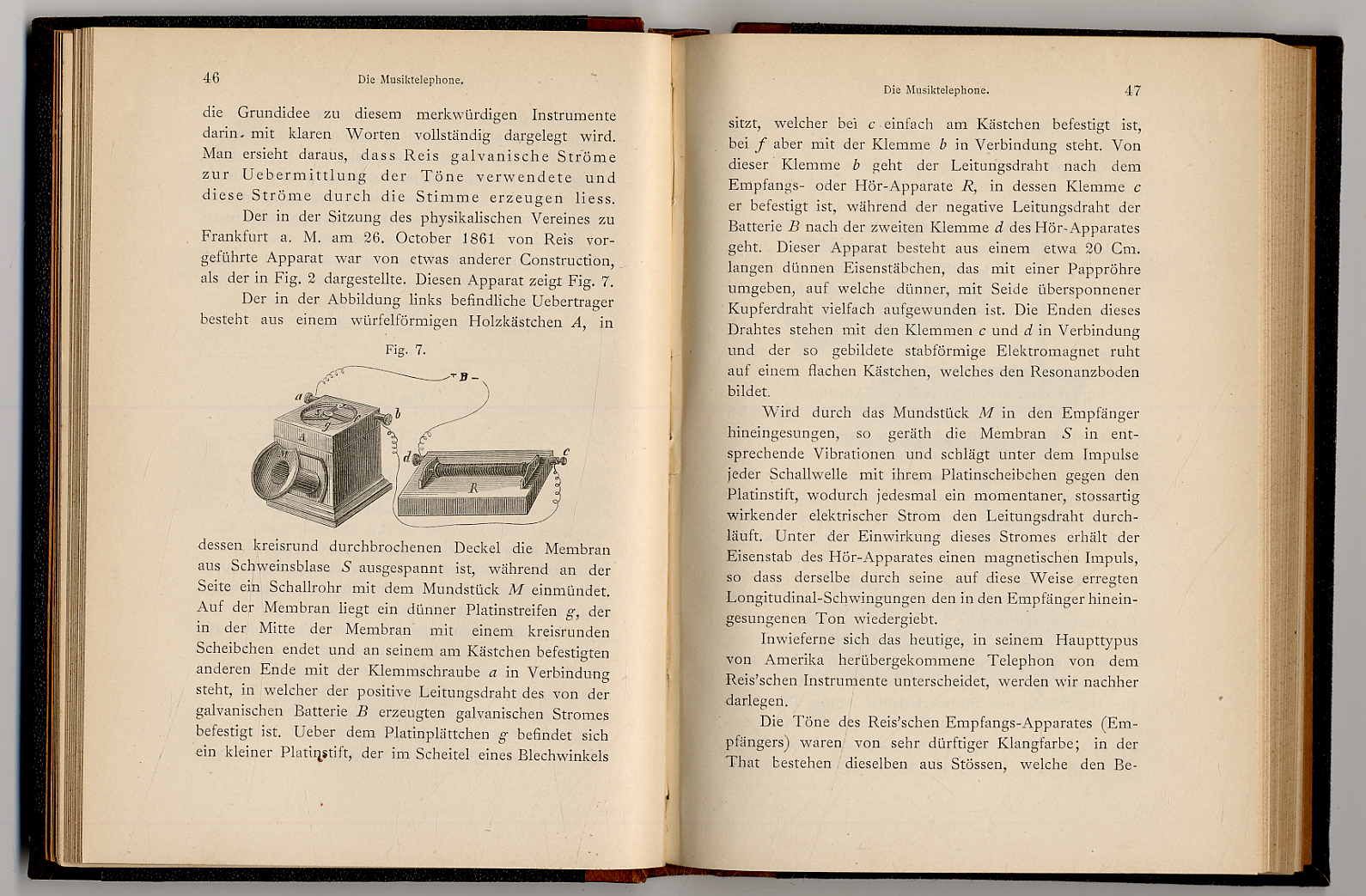 Schwartze, Theodor (Bearb.): Telephon Mikrophon und Radiophon. Mit besonderer Rücksicht auf ihre Anwendung in der Praxis. Wien u.a., A. Hartleben’s Verlag, 1883. Ca. 18,5 x 13,5 cm. XVI S., 232 Seiten. Mit 119 Abbildungen. Halblederband der Zeit. Aus der Reihe: Elektro-technische Bibliothek, VI. Band. Rücken mit kleineren Fehlstellen. Vorsatz etwas gelockert und mit Exlibris-Stempel.