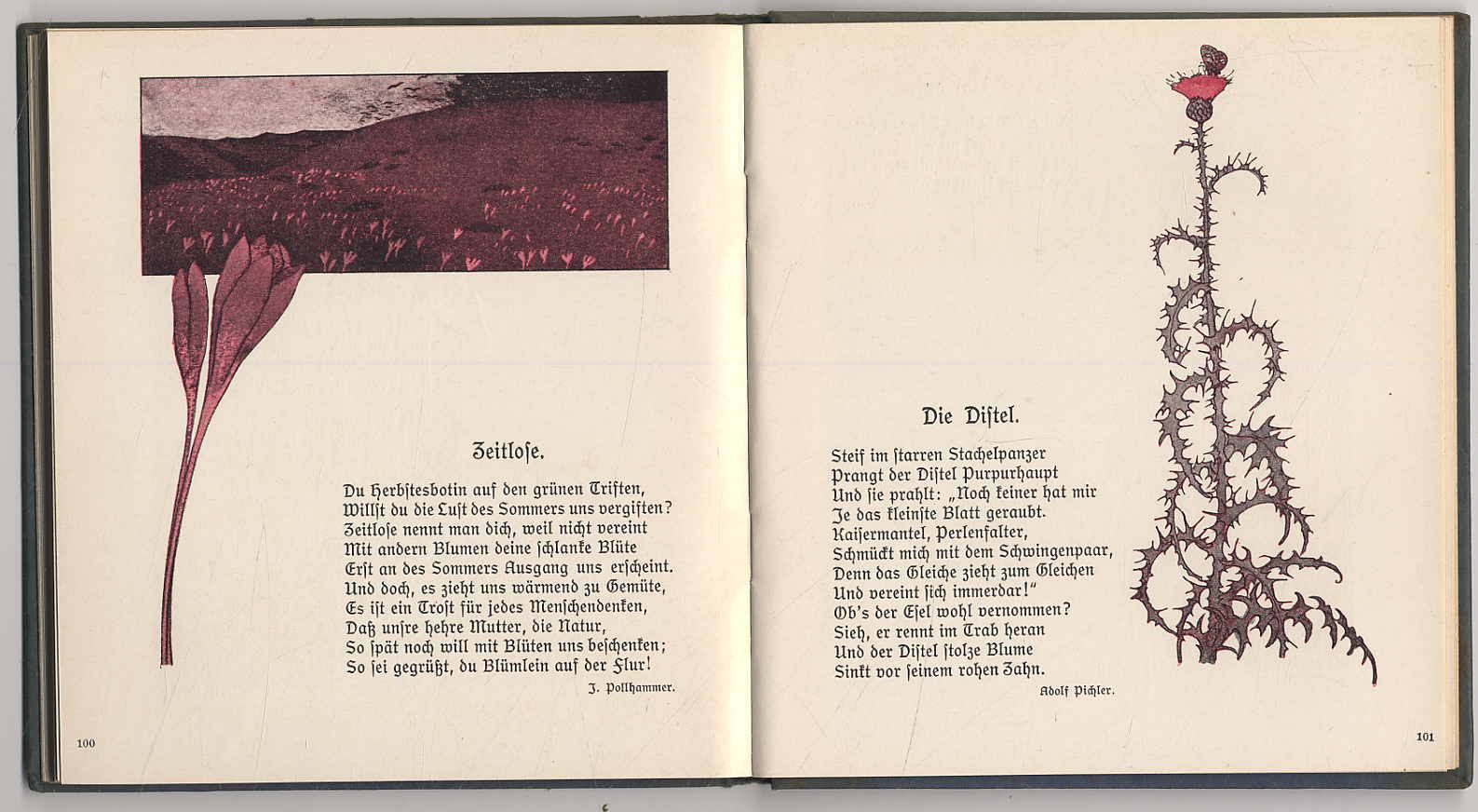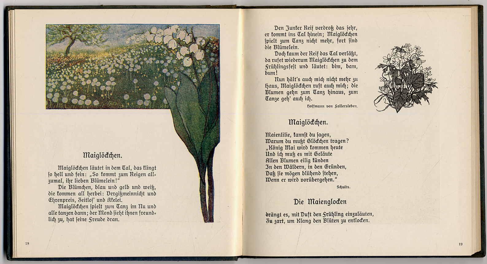 Die Blume im Lied. Texte ausgewählt von Hans Fraungruber. [3. Auflage]. Wien, Leipzig, New York, Deutscher Verlag für Jugend und Volk, 1923. Ca. 15 x 14 cm. 117 S., (3) Seiten. Mit teils farbigen, Illustrationen von Rudolf Sieck. Illustrierter blauer Orig.-Pappband. Aus der Reihe: Gerlach’s Jugendbücherei, Band 16. Heller „Die bunte Welt“ 59R A (C): „Typographisch interessant und abwechslungsreich erschient auch das phantasievolle Spiel mit freistehenden und gerahmten Bildern, aus denen dann jeweils ein Bildelement den Rahmen sprengt.“ Vorsätze etwas gebräunt, sonst gutes Exemplar mit den stimmungsvollen Landschaftsdarstellungen von Rudolf Sieck (1877-1957).