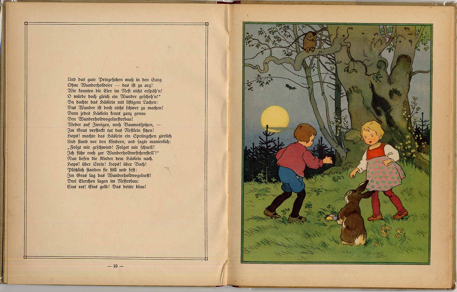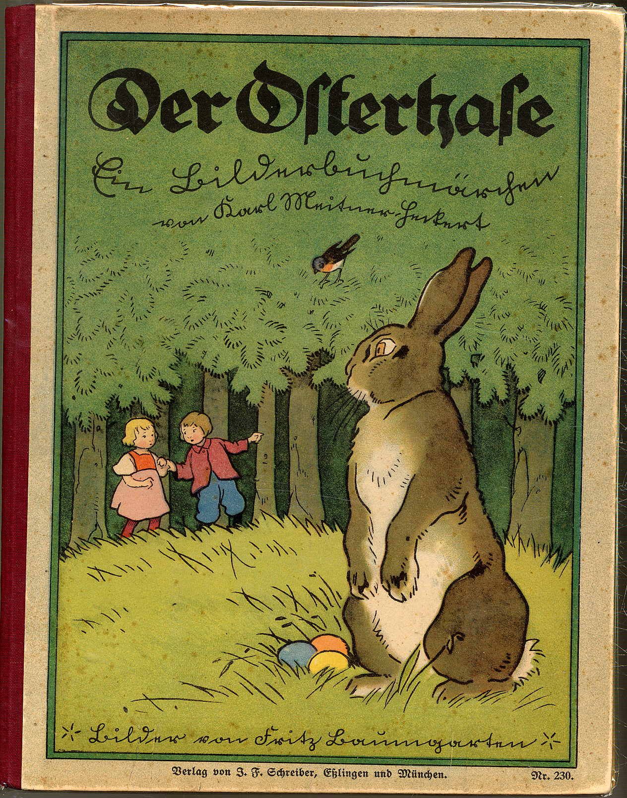 Meitner-Heckert, Karl: Der Osterhase. Ein Bilderbuchmärchen. Eßlingen und München, J. F. Schreiber, [1926]. Ca. 27 x 20,5 cm. 16 Seiten. Mit Textillustrationen und 6 farbigen Tafeln mit Bildern von Fritz Baumgarten. Farbig illustr. Orig.-Halbleinenband. Blaume 077. Erste Auflage. Ein „Zaubersmann″wurde zur kranken Prinzessin in ein Schloss gerufen: „Gleich fing der alte Zaubersmann – Mit seinem Hokuspokus an, – Sprach Pilluka-Palluka-Zaubersprüche – Und mischte seltsame Kräutergerüche. – Zuletzt da sagt er: Eins! – Zwei! – Drei! – Mir fehlt das Wunderholdvogelei! – Drei Eierlein, niedlich, farbig, rund, – Die machen Prinzeßchen sofort gesund! – Doch müssen diese drei Eierlein – Vom Nest des Vogels Wunderhold sein!“ … Da dachte das Häslein mit listigem Lachen: – Das Wunder ist doch nicht schwer zu machen! – Denn jedes Häslein kennt ganz genau – Den Wunderholdvogelnesterbau!“.