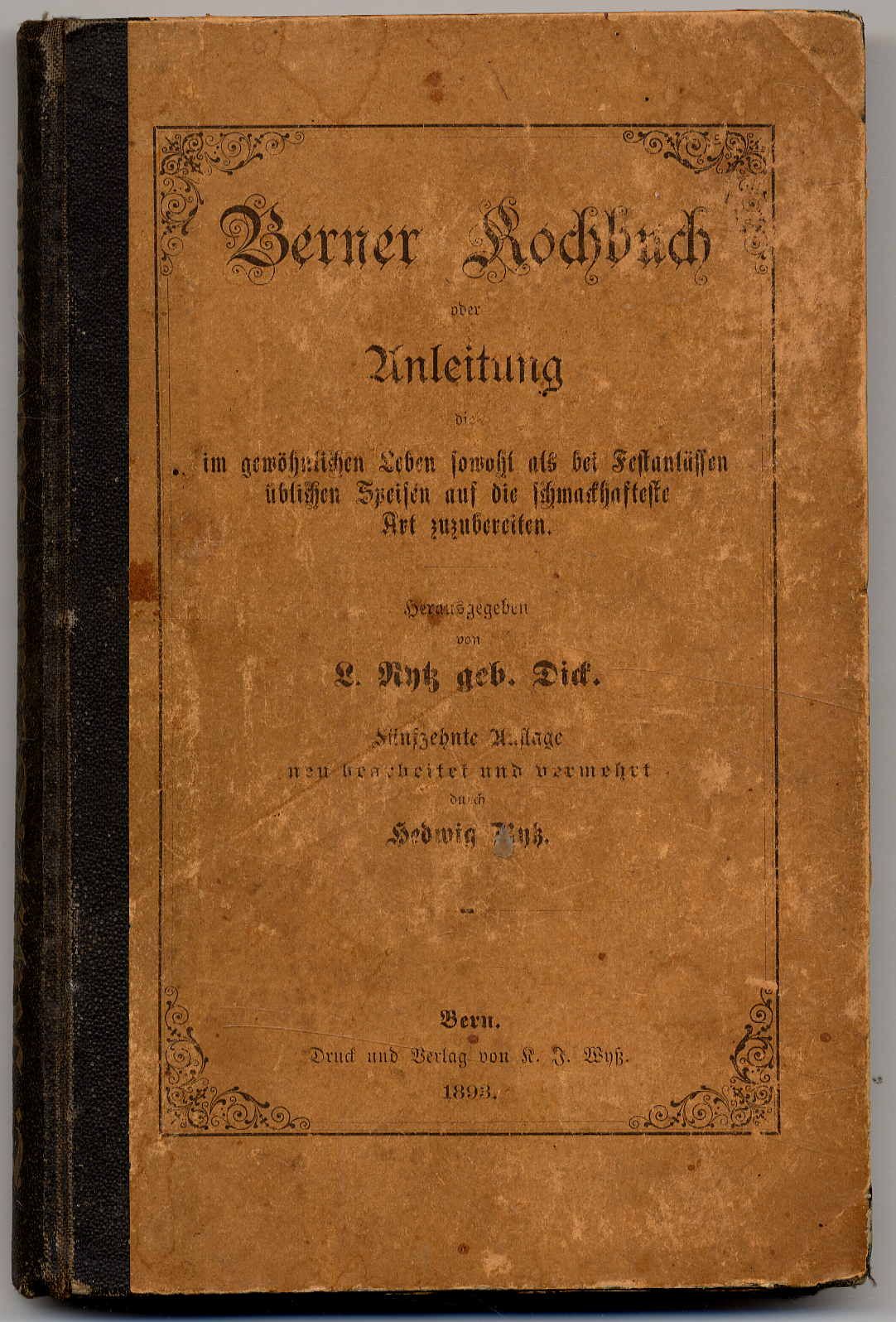 Rytz, L[isette] (Hrsg.): Berner Kochbuch oder Anleitung im gewöhnlichen Leben sowohl als bei Festanlässen üblichen Speisen auf die schmackhaftese Art zuzubereiten. 15. Auflage, neu bearbeitet und vermehrt von Hedwig Rytz. Bern, K.J. Wyß, 1893. Ca. 20 x 13 cm. XXIV S., 415 S., (3) Seiten. Orig.-Halbleinenband. Weiss 3303; Methler 4945. Hedwig Rytz (1834-1896), Enkelin von Lisette Rytz (1771-1848). Einband berieben und gebräunt. Vorsätze etwas fleckig. Rezepte u.a.: Eier-Gersten-Suppe; Rübli-Suppe; Gefüllter Lattich; Dänischer Salat; Kalbfleisch-Köpfli; Spießli von Kalbfleisch; Schafrücken glacirt; Hähneli am Blumkohl gefüllt; Auerhahn; Gebackene Frösche; Grümpelwürste; Tauben-Pasteten; Kürbis-Brei; Reiskrügeli; Haselnuß-Köpfli; Quitten-Läckerli.