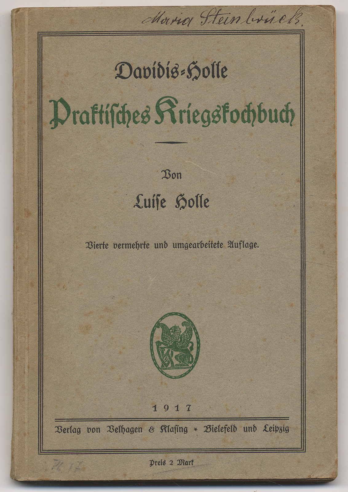 Davidis-Holle – Holle, Luise: Davidis-Holle Praktisches Kriegskochbuch. 4. vermehrte und umgearbeitete Auflage. Bielefeld und Leipzig, Velhagen & Klasing Vlg., 1917. Ca. 19 x 13 cm. X S., 165 Seiten. Originalkartonierter Einband. Alicke 3096; Methler 119. ‚Nach kaum einem Jahr kommt das Buch nun in vierter Auflage; manches mußte aus ihm verschwinden, vieles Neues, für die veränderten Lebensverhältnisse Erfundene und Bewährte fand dafür Platz. Gewachsen ist das Buch, gewachsen mit den Schwierigkeiten der jetzigen Kochkunst …‘ (Vorwort). Kleiner Namenszug auf Einband. Stempel eines Kochbuchsammlers auf Innendeckel. Gutes Exemplar dieses ausführlichen Kriegskochbuches. |Falsche Leberklöße: 125 g Haferflocken müssen in Magermilch langsam ganz dick ausquellen, so daß sie sich ablösen. Sie müssen erkalten, werden mit einer kleingeschnittenen, in Fett gargebratenen Zwiebel, Salz, 2 Teelöffeln aufgelöstem Eiersparpulver, 1 Teelöffel zerpulvertem, trockenem Thymian oder Majoran nebst 50 g gehackten Milfix-Kunstfleisch vermischt und so viel Semmelkrumen oder Mehl zugemengt, daß ein guter Kloßteig entsteht. Man kocht davon Klöße in Salzwasser und gibt Streckrübengemüse dazu.