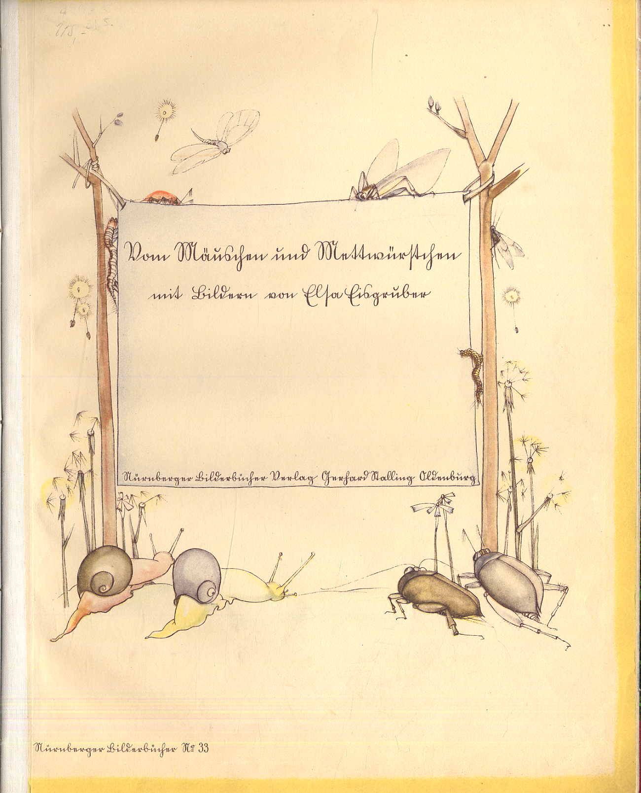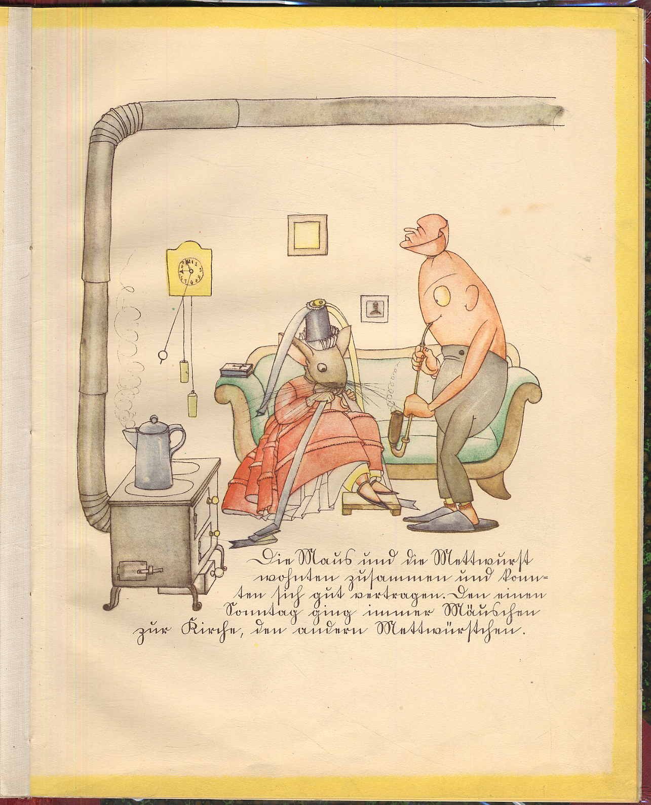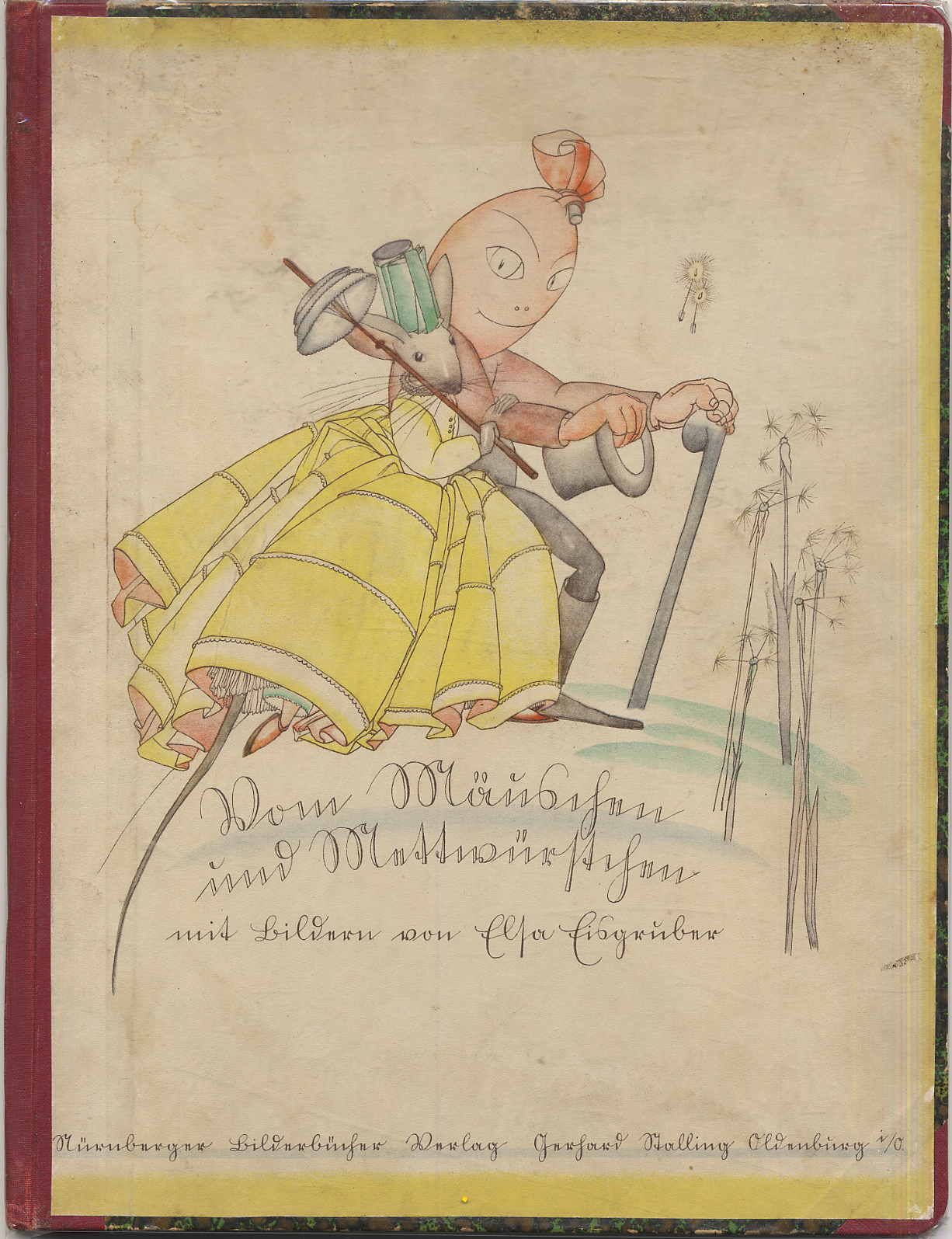 Eisgruber, Elsa: Von Mäuschen und Mettwürstchen. Oldenburg, Gerhard Stalling, 1924. Ca. 31,5 x 23,5 cm. (16) Seiten mit farbigen Illustrationen von Elsa Eisgruber. Halbleinenband der Zeit mit aufgezogener Vorder- und Hinterdeckelillustration. Aus der Reihe: Nürnberger Bilderbücher Nr. 33. Liebert, Stalling 33. Einband leicht fleckig. Blätter am Falz mit Leinenstreifen verstärkt. Bilderwelt 649: „… das durch die zarten und Pastellfarbtöne und die phantasievolle Gestaltung auffällt.“ Text in Sütterlin. „Als nun Mäuschen von der Kirche nach Hause kommt, setzen sie sich beide zu Tisch. Ei, wie schmeckt die Suppe heut schön! sagt Mäuschen. Das glaube ich, sagt Mettwürstchen, ich bin da auch dreimal duchgekrochen! Das sollst du dir merken, denkt Mäuschen, daß die Köchin durch die Suppe kriechen muß, wann sie gut schmecken soll!.