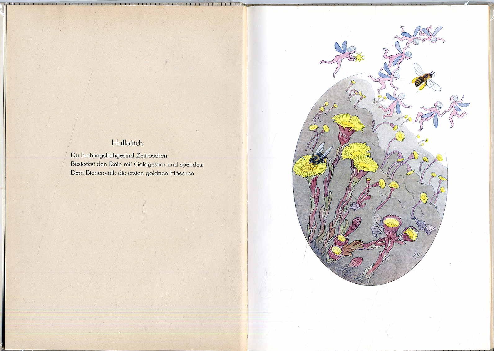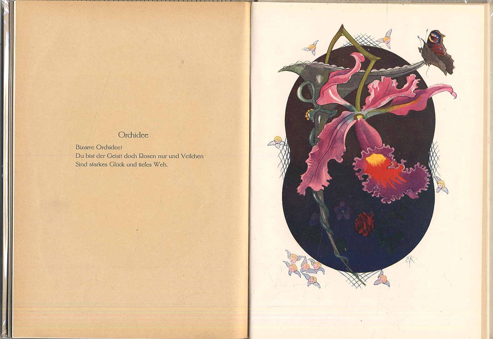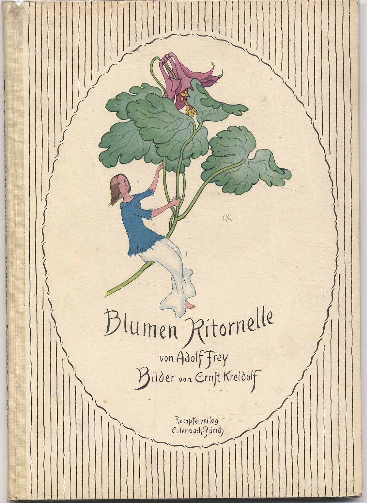 Kreidolf – Frey, Adolf: Blumen Ritornelle. Erlenbach-Zürich u. Leipzig, Rotapfel-Vlg., [1920]. Ca. 27,5 x 19,5 cm. Titelblatt, 16 Textseiten mit Reimen und 16 ganzseitige farbige Bilder in Autotypie von Ernst Kreidolf Farbig illustr. Orig.-Halbleinenband. Erste Ausgabe. Hess/Wachter B25. Exlibris und Geschenkvermerk auf Vorsatz. Mit 16 zauberhaften Blumenbildern im Jugendstil mit Elfen, Insekten und Schmetterlingen sowie 16 dreizeiligen Gedichten in Antiqua jeweils auf der gegenüberliegenden Seite.