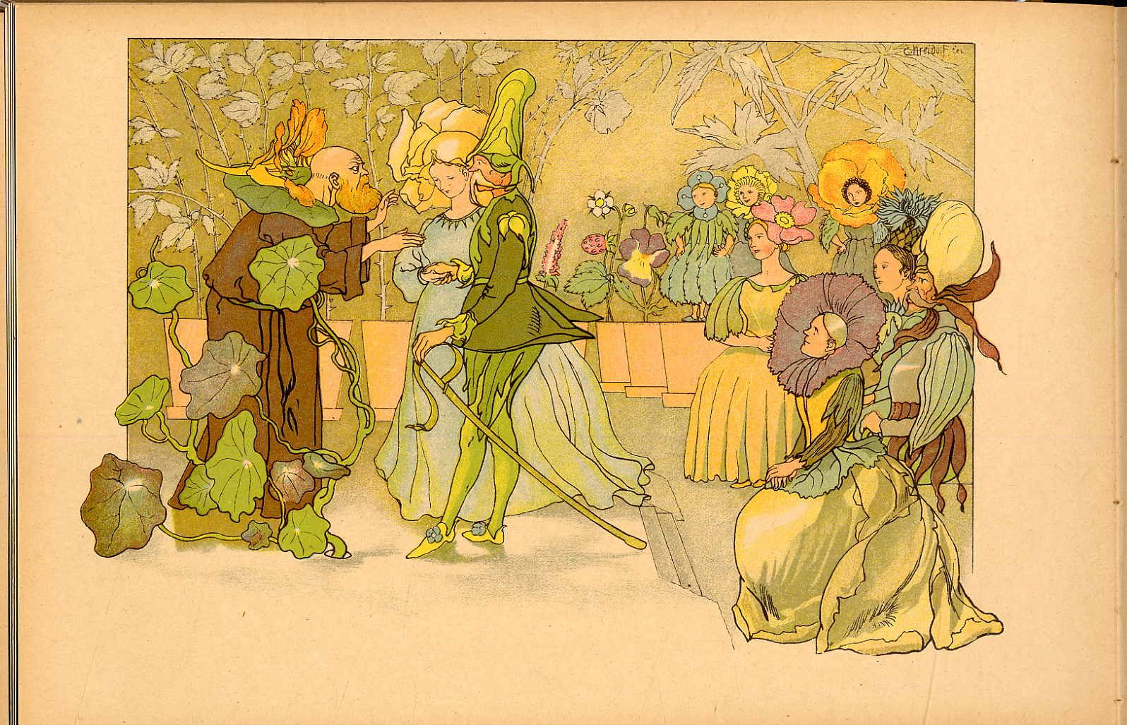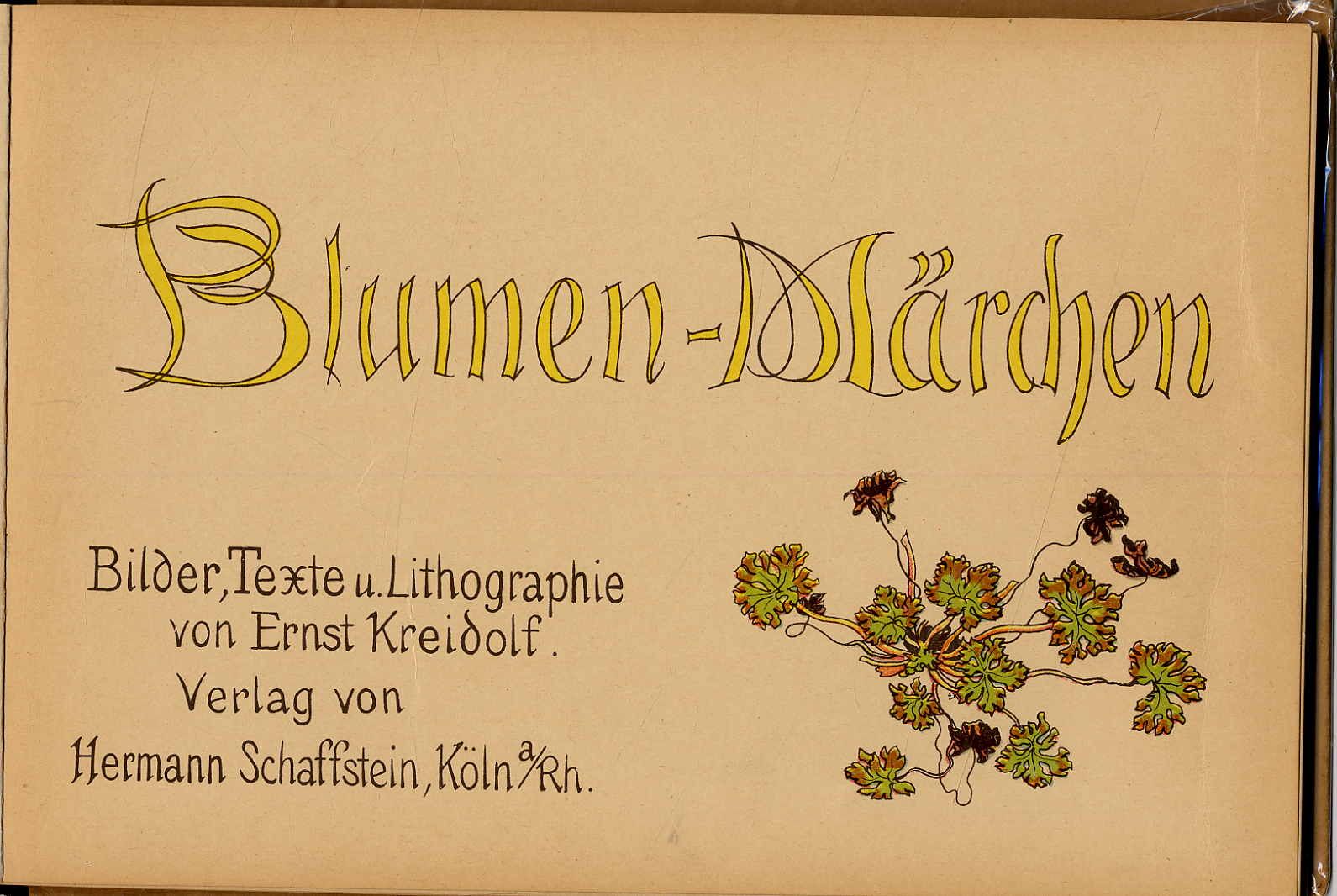 Kreidolf, Ernst: Blumen-Märchen. Bilder, Texte u. Lithographie von Ernst Kreidolf. 55. bis 65. Tausend. Köln, Hermann Schaffstein, 1922. Querformat, ca. 18,5 x 27 cm. 48 unpaginierte Seiten mit farbig illustriertem Titelblatt und 15 farbigen lithographierten Tafeln sowie 15 Tafeln mit Federzeichnungen. Farbig illustr. Orig.-Halbleinenband. Hess/Wachter A 1, S. 23. Einband und Seiten papierbedingt etwas gebräunt. Doderer/Müller S. 230: „Mit seinem ersten Bilderbuch, den 1898 … erschienene Blumen-Märchen, …. stimmte Ernst Kreidolf jenes Thema in Bild und Text an, das sein ganzes weiteres Bilderbuchschaffen prägte und auch die Bilderbuchliteratur der nachfolgenden Jahrzehnte maßgeblich beeinflußte: die personifizierten Pflanzen und Tiere.