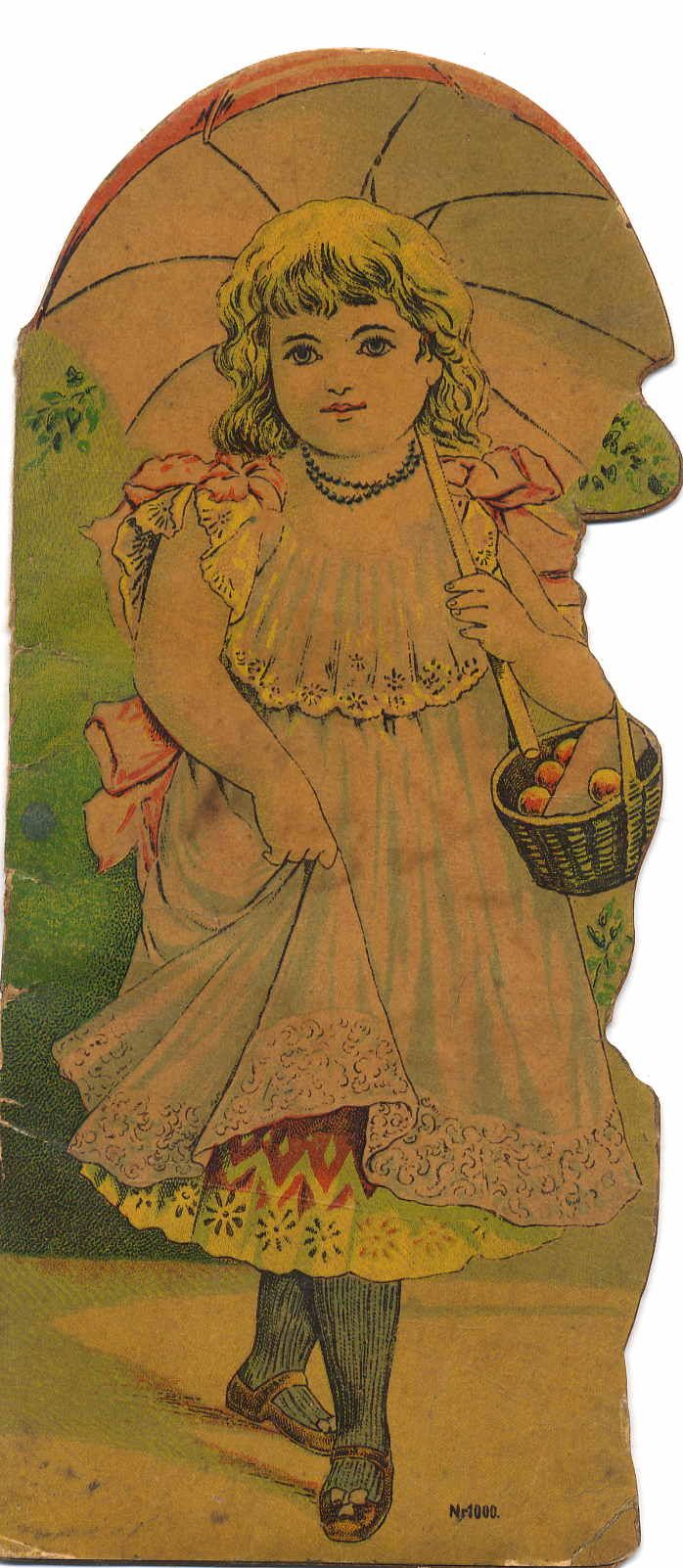 Umrissbilderbuch ohne Titel. Ohne Ort und ohne Verlag, um 1900. Ca. 22 x 9,5 cm. (12) Seiten. Mit colorierten Illustrationen. Farbig illustrierter, lithographierter Original-Karton (Umrissbilderbuch in Form eines Mädchens mit Sonnenschirm). Mit Reimen. Die Bilder zeigen Kinder beim Holzsammeln, vor der Wanduhr, den Weihnachtsmann, Christkind mit Christbaum, den Osterhasen, ein Kind auf einem Esel. etc. Hinterdeckel mit kleiner Fehlstelle. Durchgehend gebrunt. Auf dem Einband gedruckt „Nr. 1000“ und „L.&t. L.“.