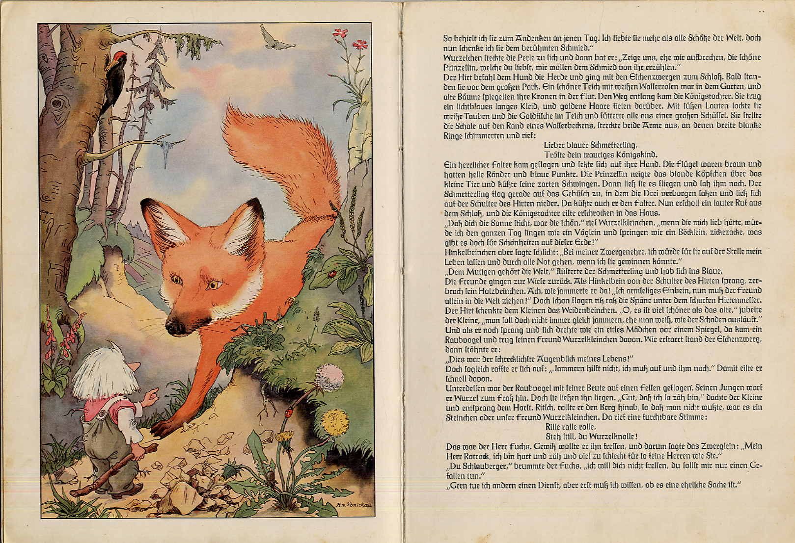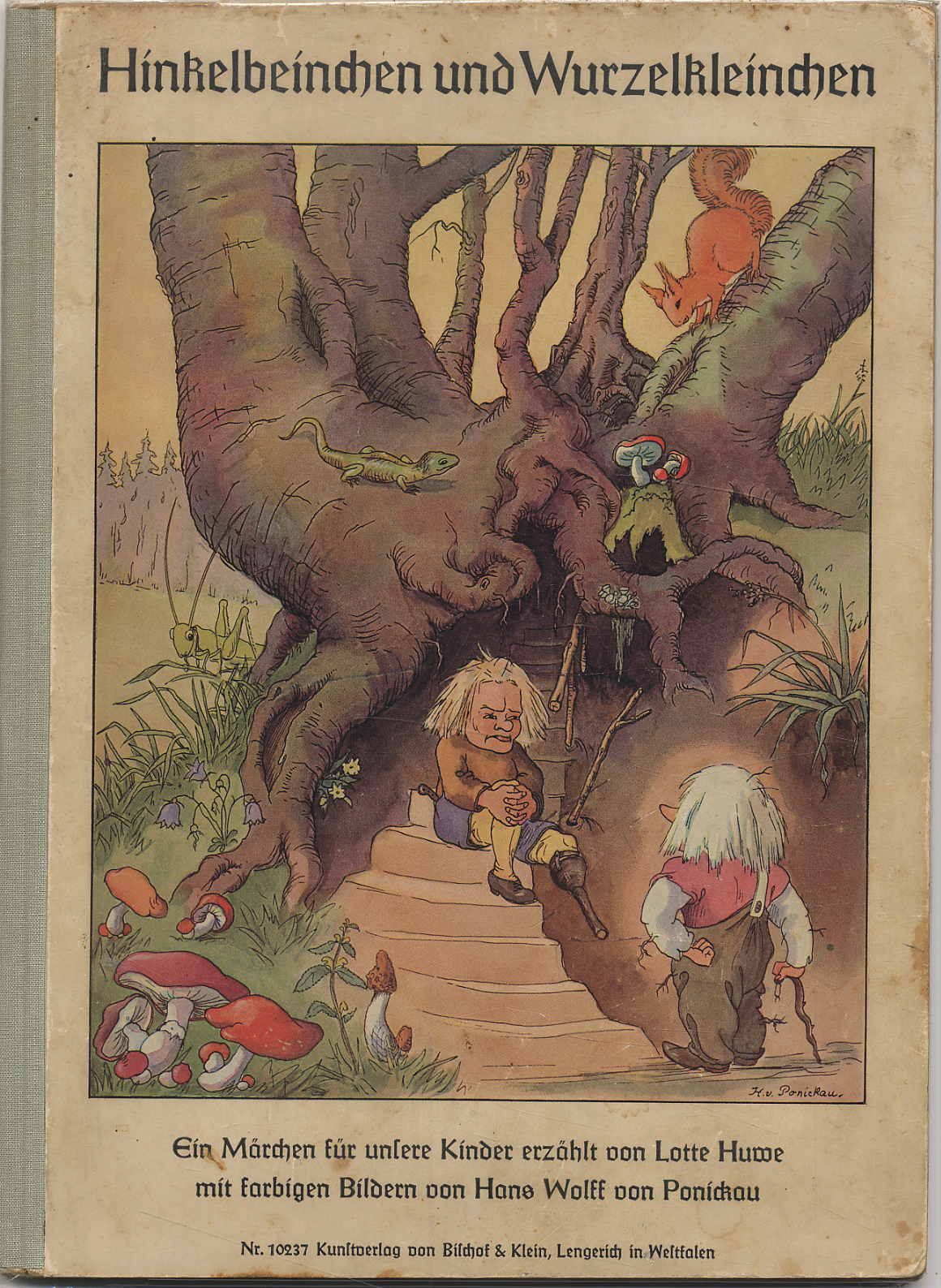 Huwe, Lotte: Hinkelbeinchen und Wurzelkleinchen. Ein Märchen für die Jugend erzählt. Lengerich, Kunstverlag von Bischof und Klein, [1934]. Ca. 29,5 x 21 cm. (16) Seiten. Mit 5 ganzseitigen farbigen Illustrationen von Hans Wolff von Ponickau. Farbig illustr. Orig.-Halbleinenband. Klotz 2991/8. Rücken erneuert und Innendeckel neu bezogen. Etwas fingerfleckig. Ein Märchen von den beiden Zwergen Hinkelbeinchen und Wurzelkleinchen