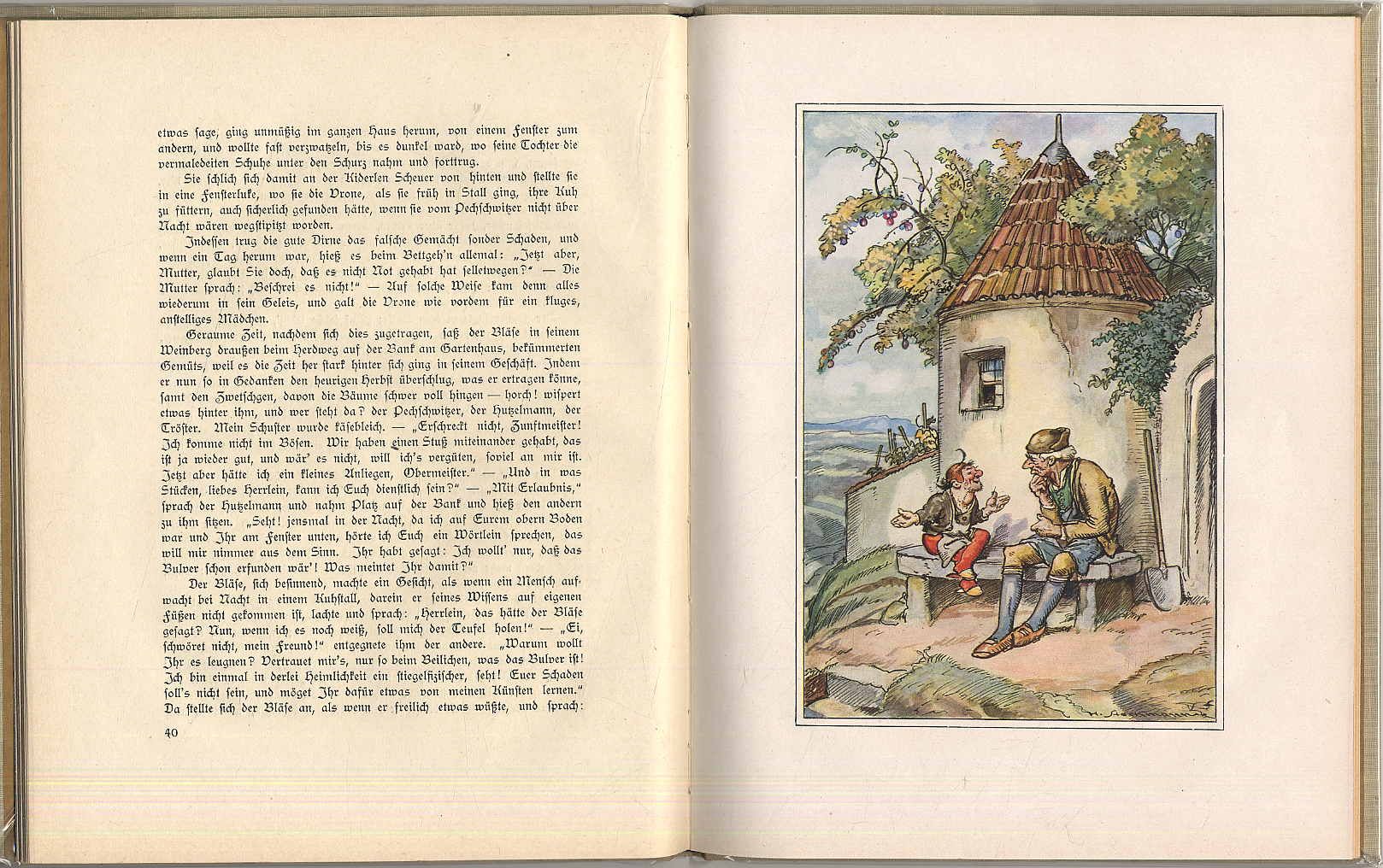 Mörike, Eduard: Das Stuttgarter Hutzelmännlein. München, G. W. Dietrich, 1919. Ca. 25 x 20 cm. (6) S., 79 Seiten. Mit Textillustrationen und 6 farbigen Tafeln von Hans Stockmann. Farbig illustr. Orig.-Leinenband. Aus der Reihe: Kleinodien der Weltliteratur, Buch 20. Klotz 4729/44. Widmung auf Vortitel. Gutes Exemplar.