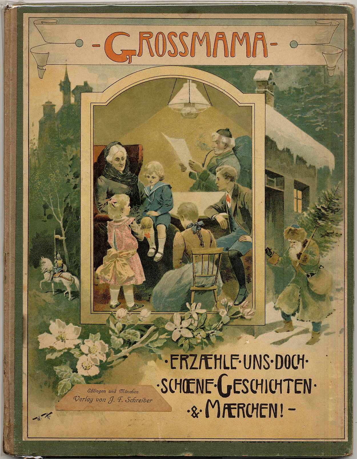 Kronoff, Frida v. (d.i. Frida Hummel): Großmama erzähle! Eine Sammlung der besten Ammenscherze, Spielverse, Kinderlieder, Erzählungen, Märchen und Fabeln. Ausgewählt, ergänzt und herausgegeben. Eßlingen und München, J. F. Schreiber, [1895]. Ca. 32,5 x 25 cm. (50) Seiten. Mit 24 Chromobilder. Farbig illustr. Orig.-Halbleinenband. Klotz 3740/35 (Verlag W. Nitzschke). Zum Falz hin teils etwas fleckig, Buchblock leicht gelockert. Aus dem Inhalt u.a.: Das Goldfingerlein; Thunichtgut; Hans Krittelmeyer; Das kranke Kind und das Engelein; Trotzköpfchen; Prinzessn Zuckerbrot; Die Wohung der Maus; Bettelspatz; Sankt Niklas; Der Englein Weihnachtspost. Mit dekorativen farbigen Lithographien. Seltenes Bilderbuch.