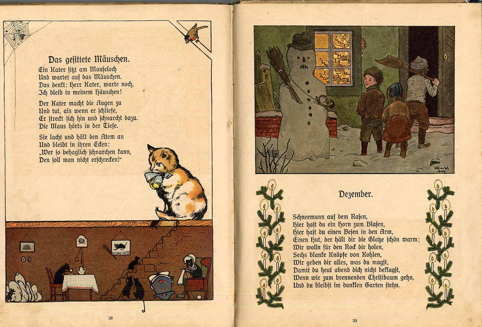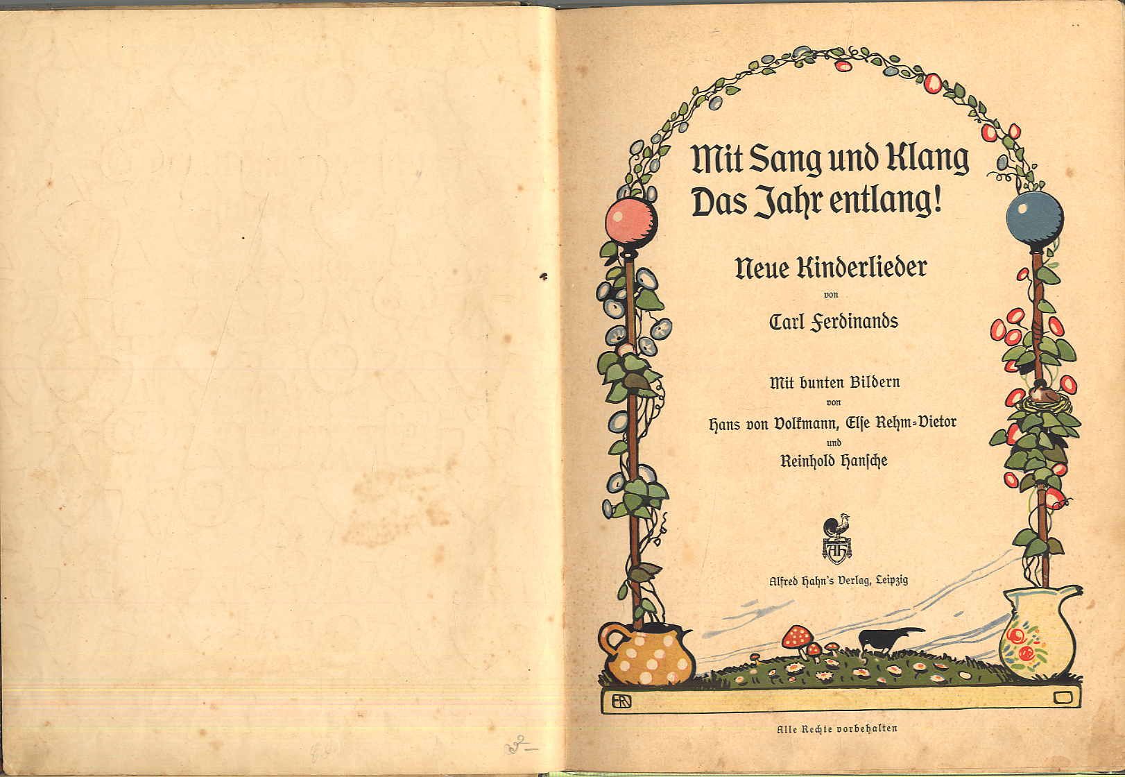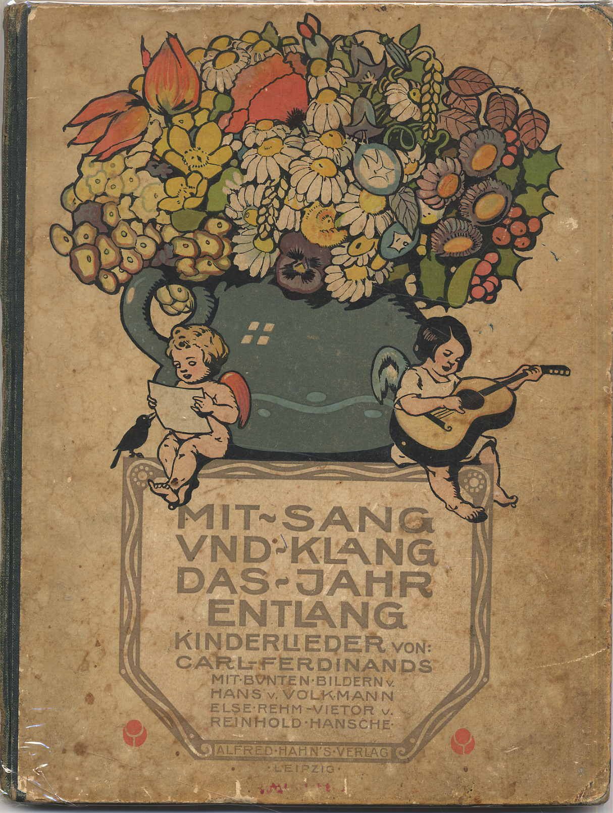 Ferdinands, Carl (d.i. Karl Ferdinand v. Vleuten): Mit Sang und Klang Das Jahr entlang! Neue Kinderlieder. Leipzig, Alfred Hahn’s Verlag, (1909). Ca. 29,5 x 22 cm. 39 Seiten. Mit (auch einigen ganzseitigen) farbigen Bildern von Hans von Volkmann, Else Rehm-Vietor und Reinhold Hansche. Farbig illustr. Orig.-Halbleinenband. Einbandkanten besetoßen, Einband fleckig. Vorsatz leicht gelockert. Seitenränder fingerfleckig. Zu jedem Monat mehrere hübsch illustrierte Kinderliedtexte. Es beginnt mit einem Neujahrswunsch und endet mit einem Dezembergedicht zu Schneemann und Christbaum. U.a. Das heiße Süppchen, Das Schwarzbrot, Lustiges A B C; Aprilscherz, Der unschlüssige Maikäfer, Badeliedchen, Septembermanöver, Morgenlied, Schlafliedchen, Der große Besen, Puppenlappen, Das gesittete Mäuschen.