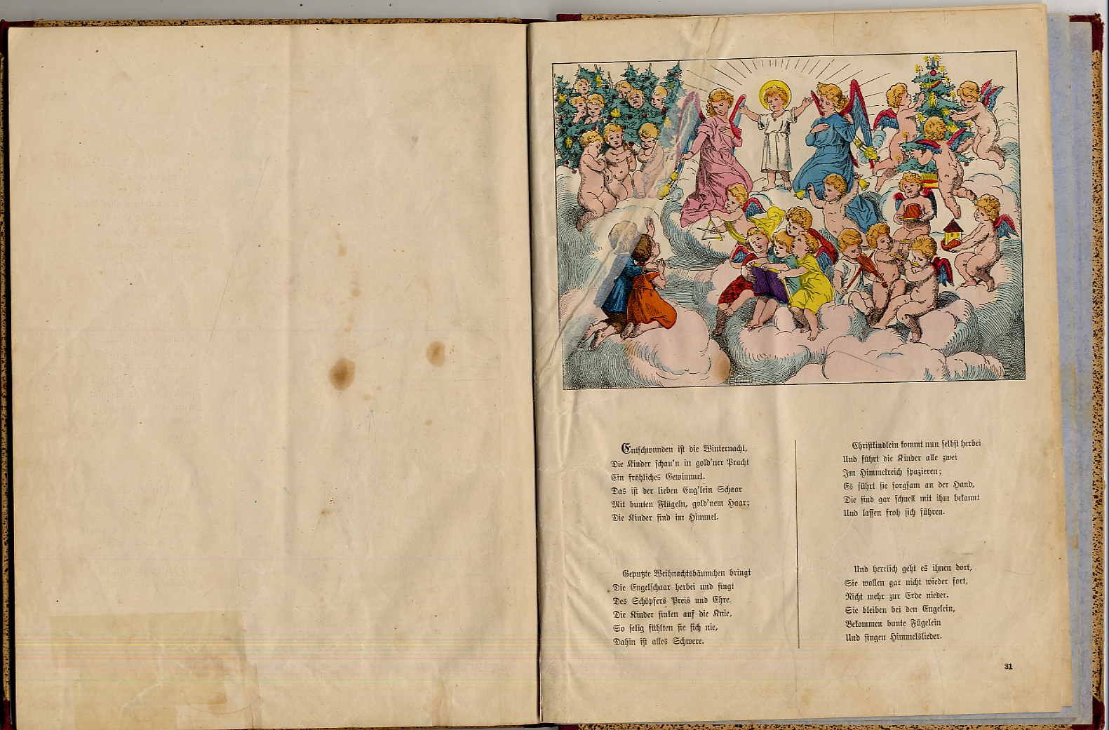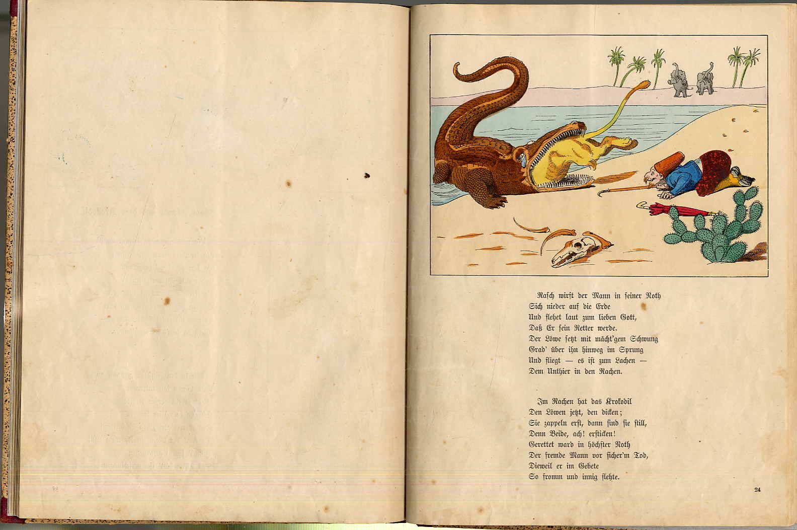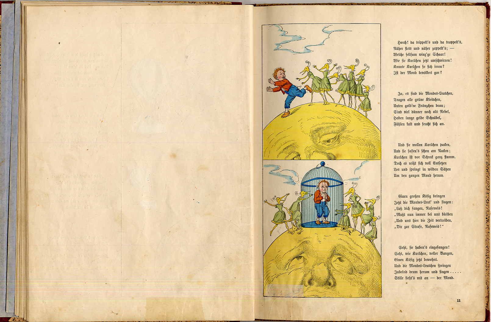 Oswalt, H[einrich]: Unter’m Märchenbaum. Allerlei Märchen, Geschichten und Fabeln in Reimen und Bildern. Nach der Originalfassung des Verfassers illustrirt. Frankfurt, Literarische Anstalt Rütten & Loening, [1877]. Ca. 28 x 22 cm. 32 einseitig nummerierte und bedruckte Blatt. Mit handcololrierten Illustrationen von Eugen Klimsch. Späterer einfacher Halbleinenband. Ries 641,15; Bilderwelt 419. Seiten teils stock- und am Rand fingerfleckig, einige Blätter Einrisse sauber hinterlegt. Rühle 307: „Da annähernd die Hälfte der 19 Märchen und Geschichten eindeutig Struwwelpetriaden-Charakter aufweist, wird er hier mit aufgeführt“. Aus dem Inhalt u.a.: Mamsell Pimpernell; Der Riese und die Zwerge; Karlchen Naseweis oder Die Mond-Reise wider Willen; Des Birkenmännleins Zauber-Ruthe; Das Mohrenkind; Vom Zucker-Hugo; Vom Oster-Haas; Weihnachtsmärchen; Sandmännchen. Seltene, frühe handcolorierte Ausgabe.
