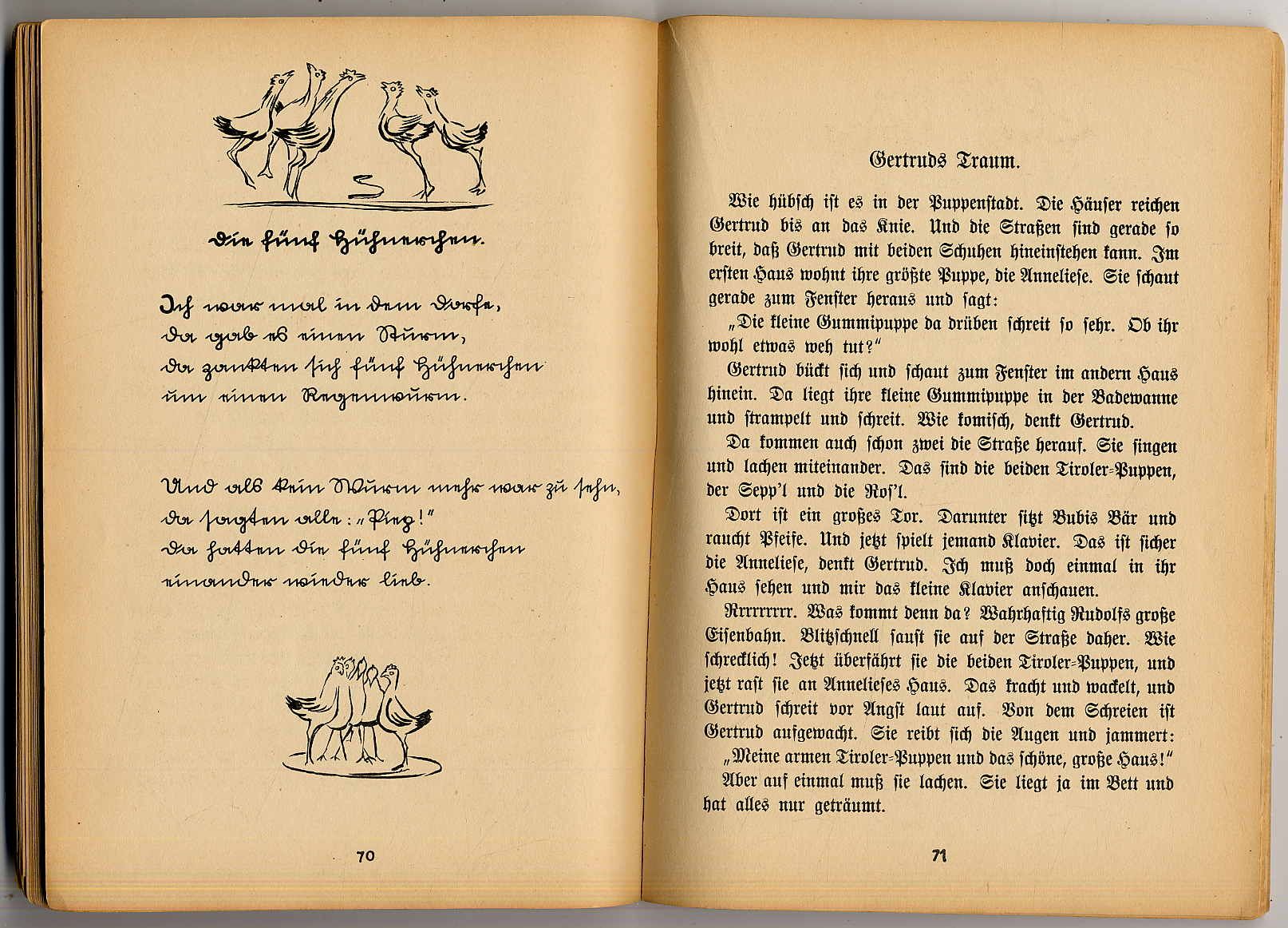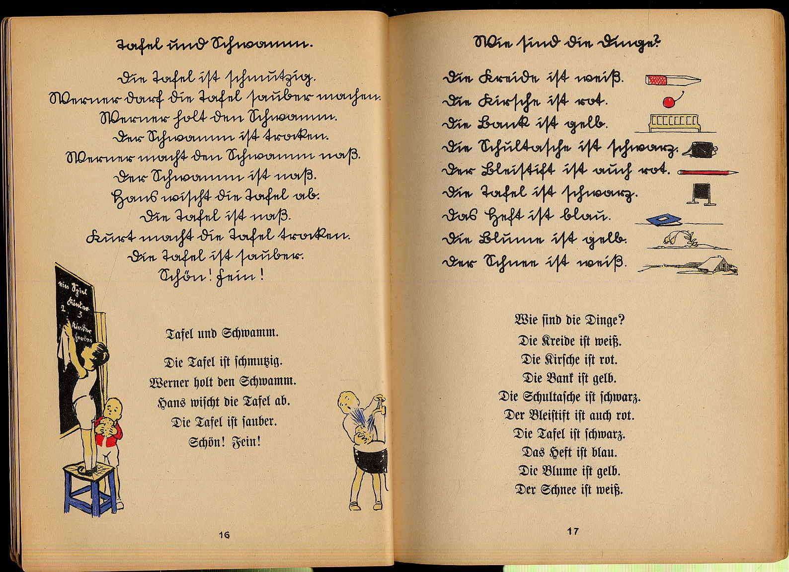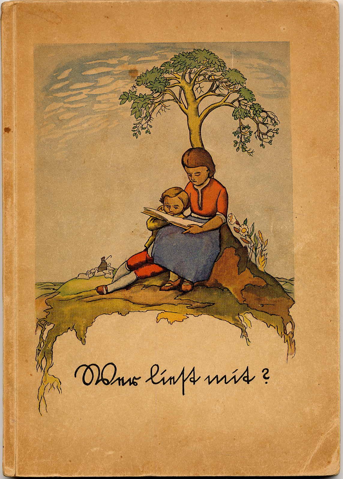 Kern, Artur: Wer liest mit? Ein Lesebuch für die Kleinen. Unter besonderer Mitwirkung von Stadt-Oberschulrat Dr. Egon Wintermantel und der Freiburger Lehrerbildungsanstalt. Freiburg, Herder & Co., [1931]. Ca. 24,5 x 17,5 cm. 95 Seiten. Mit vielen, teils farbigen Bildern von Johannes Thiel. Geschrieben von Elfriede Weber. Farbig illustrierter Orig.-Karton. Teistler 2645 (etwas abgewandelter Untertitel „Eine Lesebuch für unsere Kleinen“; Bilderwelt 1965. Einband etwas gebräunt und bestoßen. Namenszug auf Vorsatz. Seiten papierbedingt etwas gebräunt. May/Schweitzer 102: „Mit der Erstausgabe der ersten echten ganzheitlichen Fibel für allgemeinbildende Schulen in Deutschland begann der vorläufig letzte, bis in die 60er Jahre reichende Aufschwung der „reinen“ Methode. Im ganzen Buch findet man nicht einen isolierten Buchstaben, sondern ganze Sätze, die den Kindern zunächst Lesen als Sinnerfassung verdeutlichen sollen.“ Bei den Texten werden anfangs Sütterlin- und Frakturschrift gegenüber gestellt, im weiteren Verlauf sind die Texte anfangs in Sütterlin, später in Fraktur gedruckt.