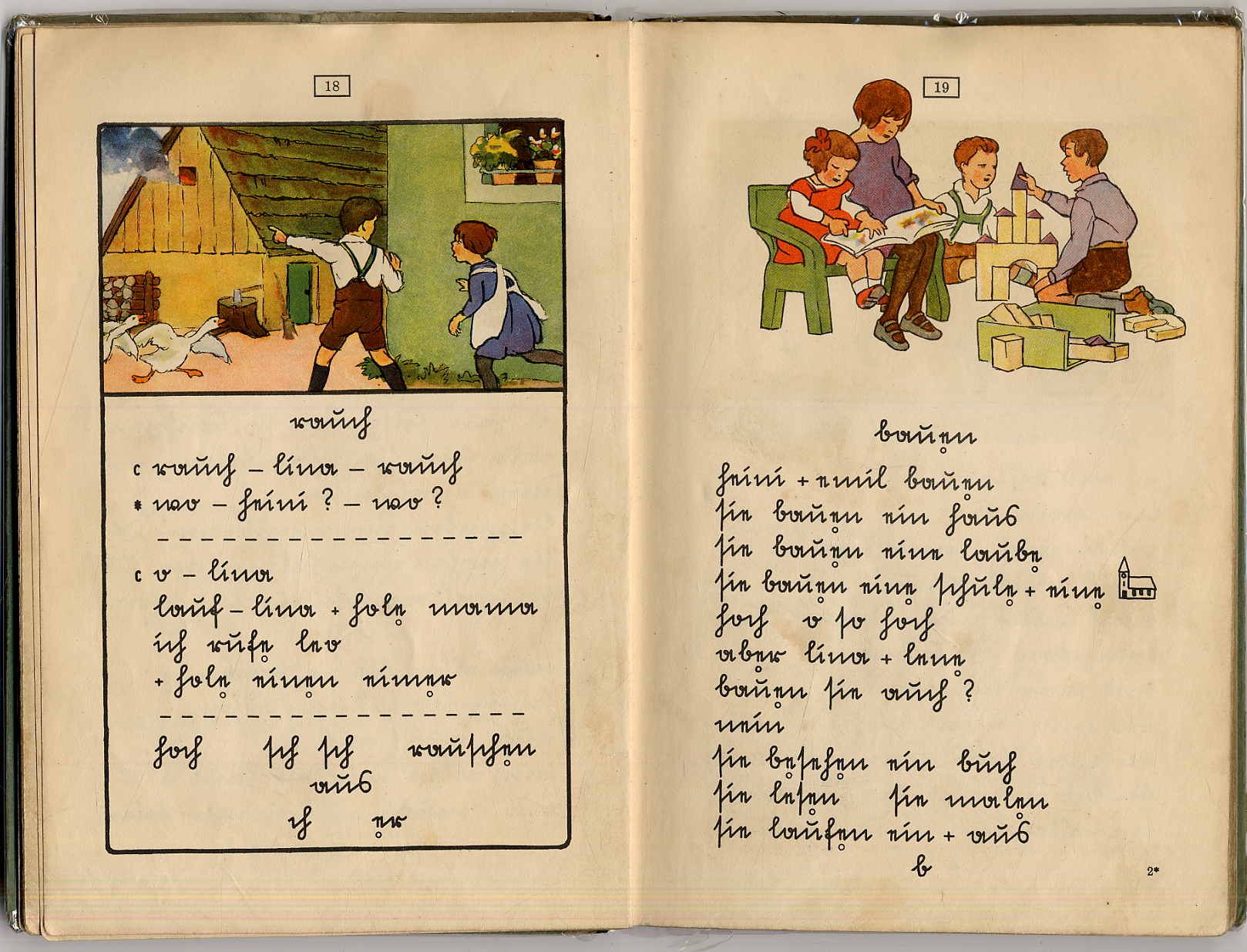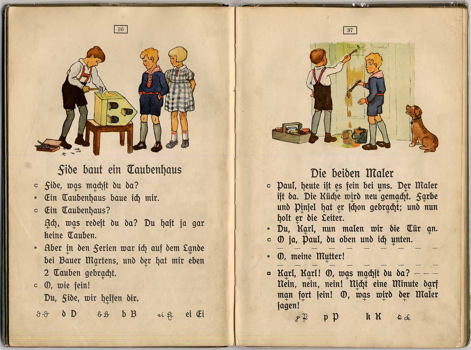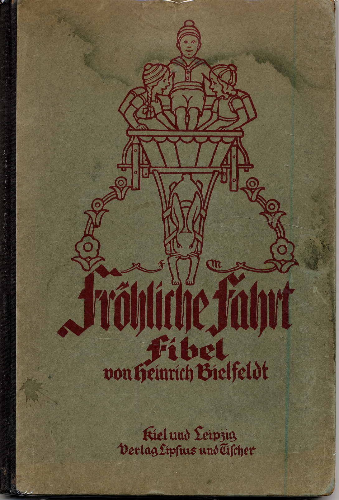 Bielfeldt, Heinrich: Fröhliche Fahrt. 32. Tsd., 2. Auflage der Neubearbeitung. Kiel und Leipzig, Lipsius und Tischer, o.J., ca. 1937. Ca. 23 x 15,5 cm. 96 S., VIII S. Mit (teils farbigen) Bildern von Gertrud Caspari und Friedrich Mißfeldt. Orig.-Halbleinenband. Neubert 421.2.2; Teistler 2571.6. Einband und Vorsätze fleckig. Vorsatz mit Besitzstempel. Seitenränder etwas fingerfleckig. Neubearbeitung der ‚Nordmarkfibel‘. Die ersten 30 Seiten dieser stark nationalsoz. geprägten Fibel in Sütterlinschrift. Die Hakenkreuzfahne erscheint auf dem Titelblatt, aber auch bei einer Szene am Bahnhof, beim Neubau und sogar beim Sandspielen am Meer.