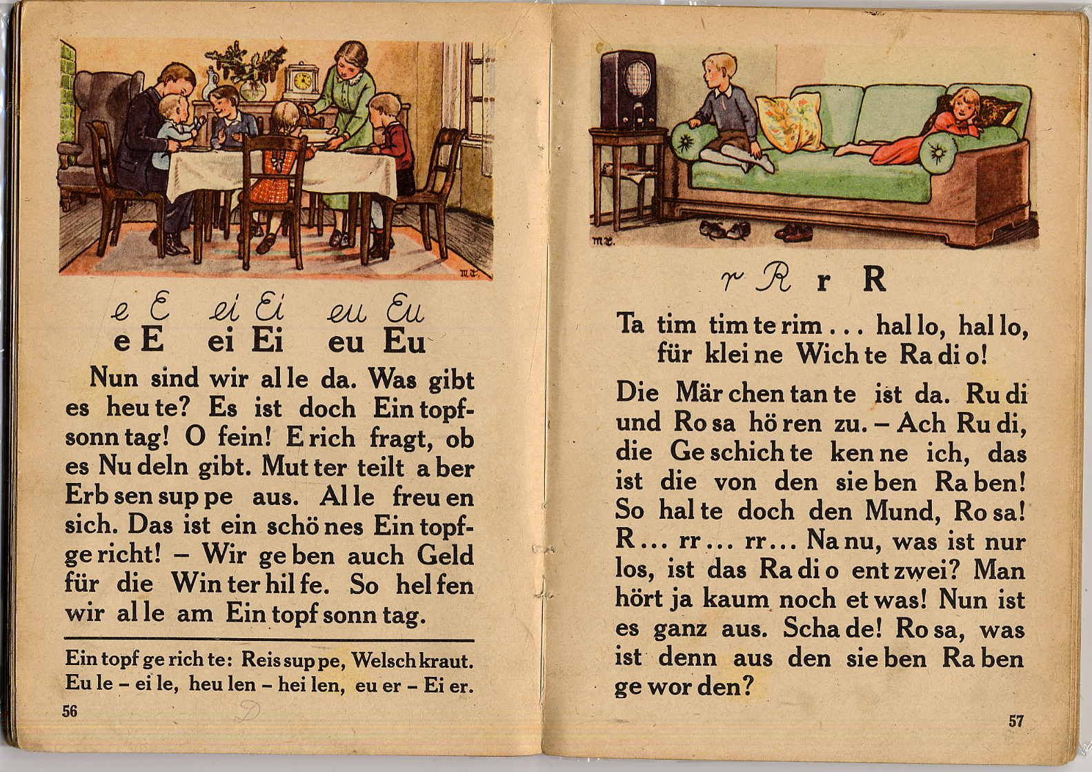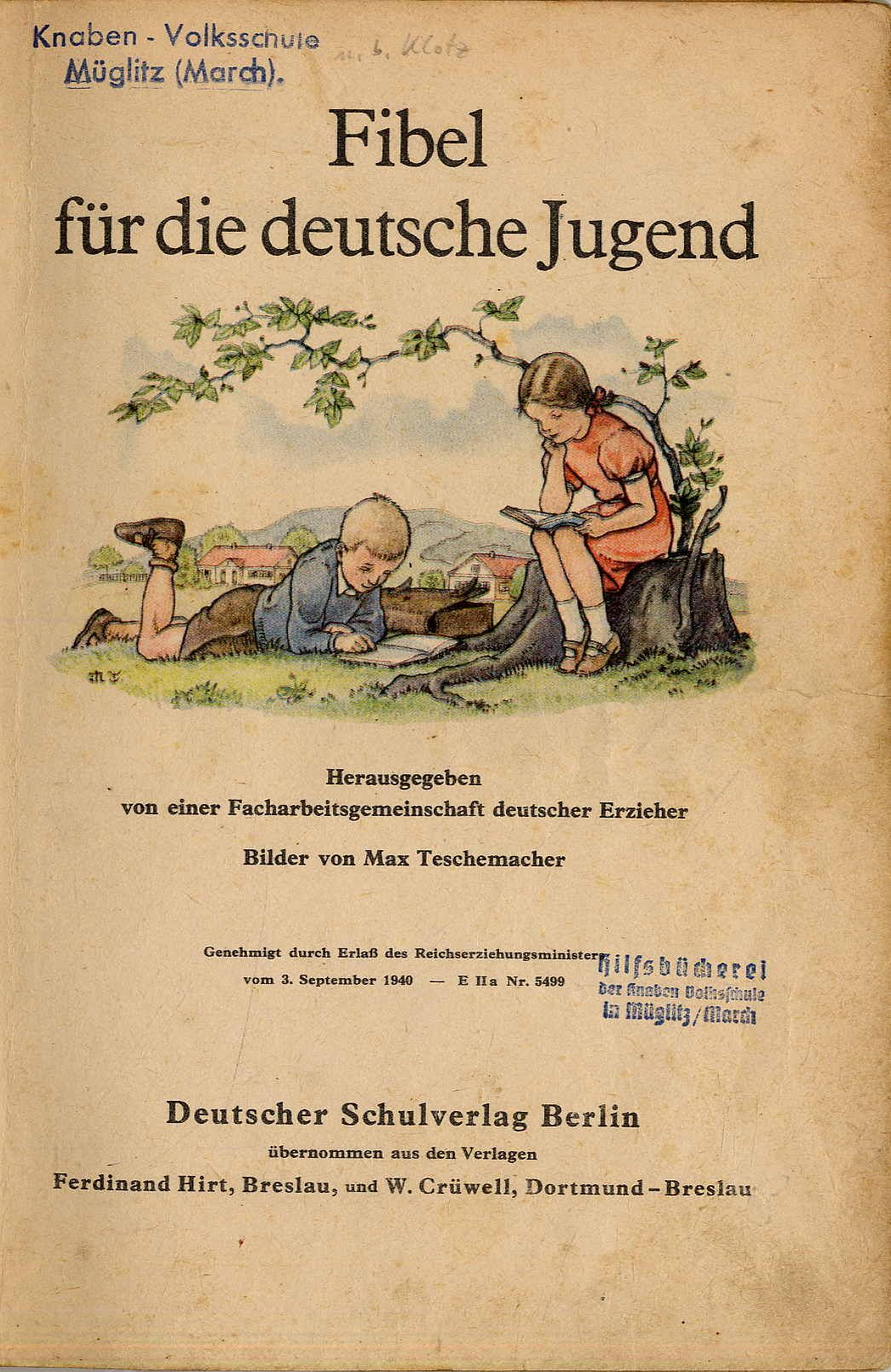 Fibel für die deutsche Jugend. Hrsgg. von einer Facharbeitsgemeinschaft deutscher Erzieher. Berlin, Deutscher Schulverlag, [1941]. Gr.8°. 96 S. Mit zahlreichen farbigen Bildern von Max Teschemacher. Illustr. Original-Halbleinenband. Waldschmidt 112; Doderer/Müller 841. Kleiner Stempel auf Einband und Titelblatt, Rückenleinen erneuert. Seiten teils etwas finger- und braunfleckig. Lesen Lernen S. 60, E-6: „In dieser Schreiblesefibel wird wieder mit der lateinischen Schreibschrift begonnen, und zwar nicht in der Form der lateinischen Sütterlinschrift, sondern einer neuen Ausgangsschrift. Die Sympathie für den Nationalsozialismus wird … über den Wunsch nach der Uniform, dem Mitmachen bei Aufmärschen und der „Liebe“ zur Flagge (geweckt). Aber auch Antisemitisches fehlt nicht.“