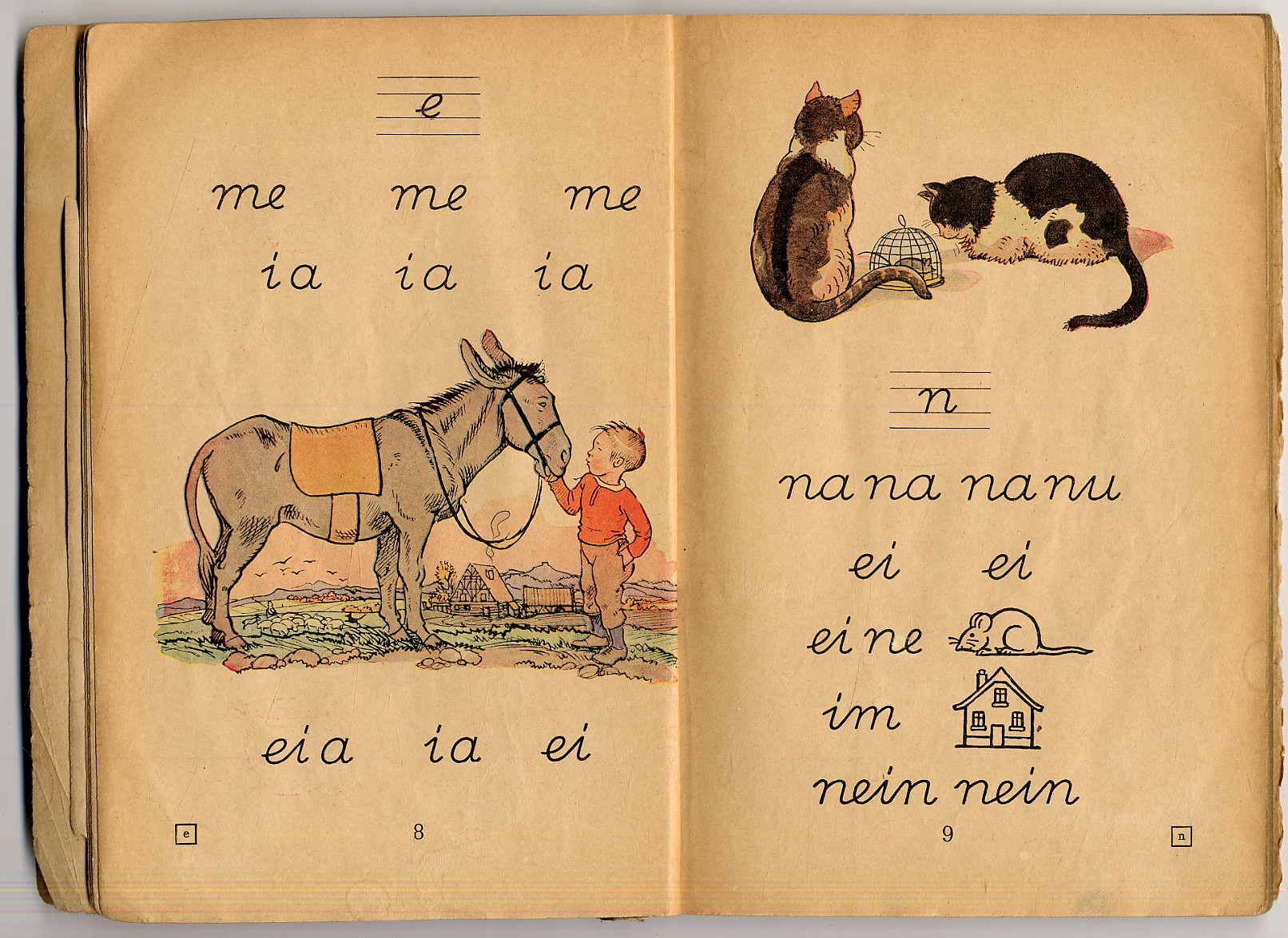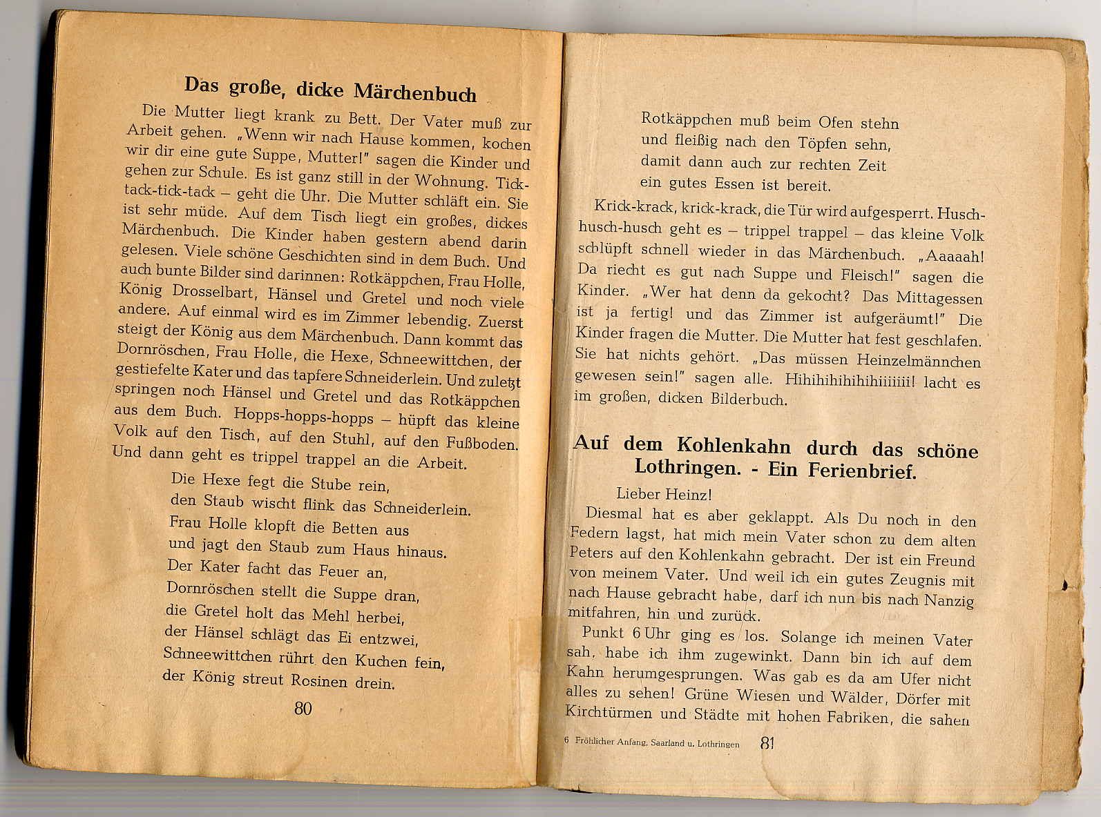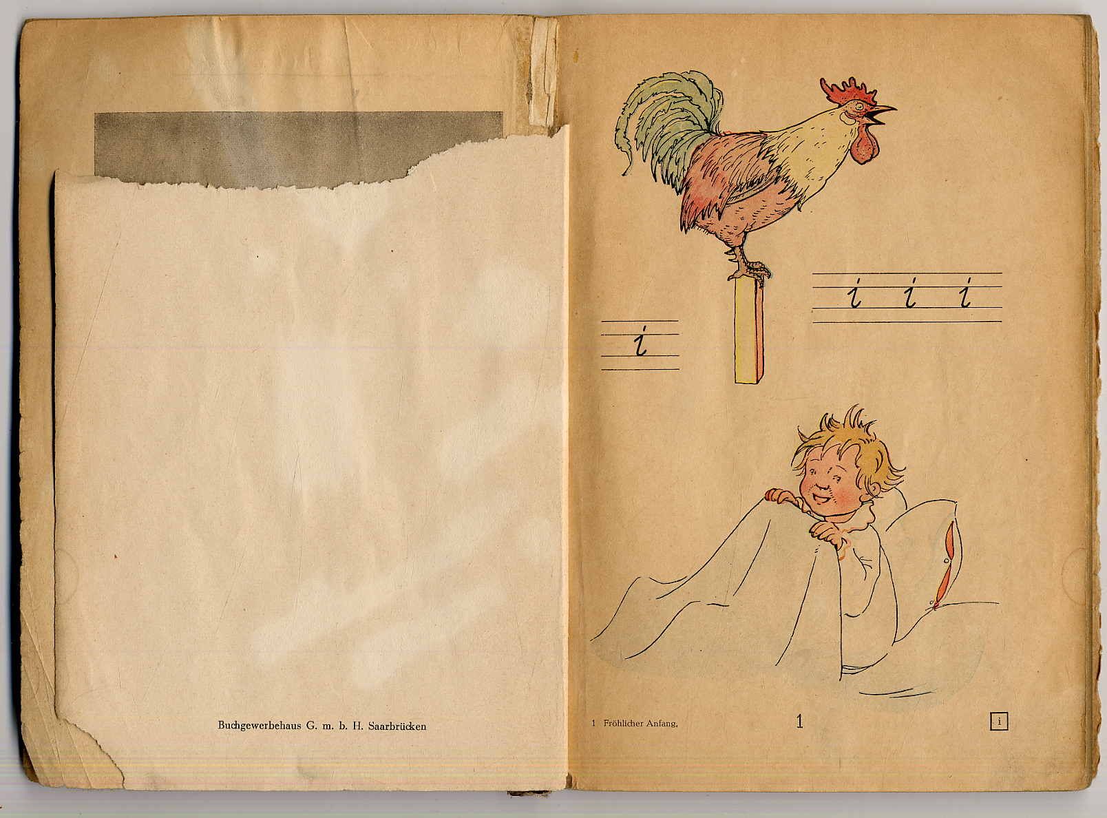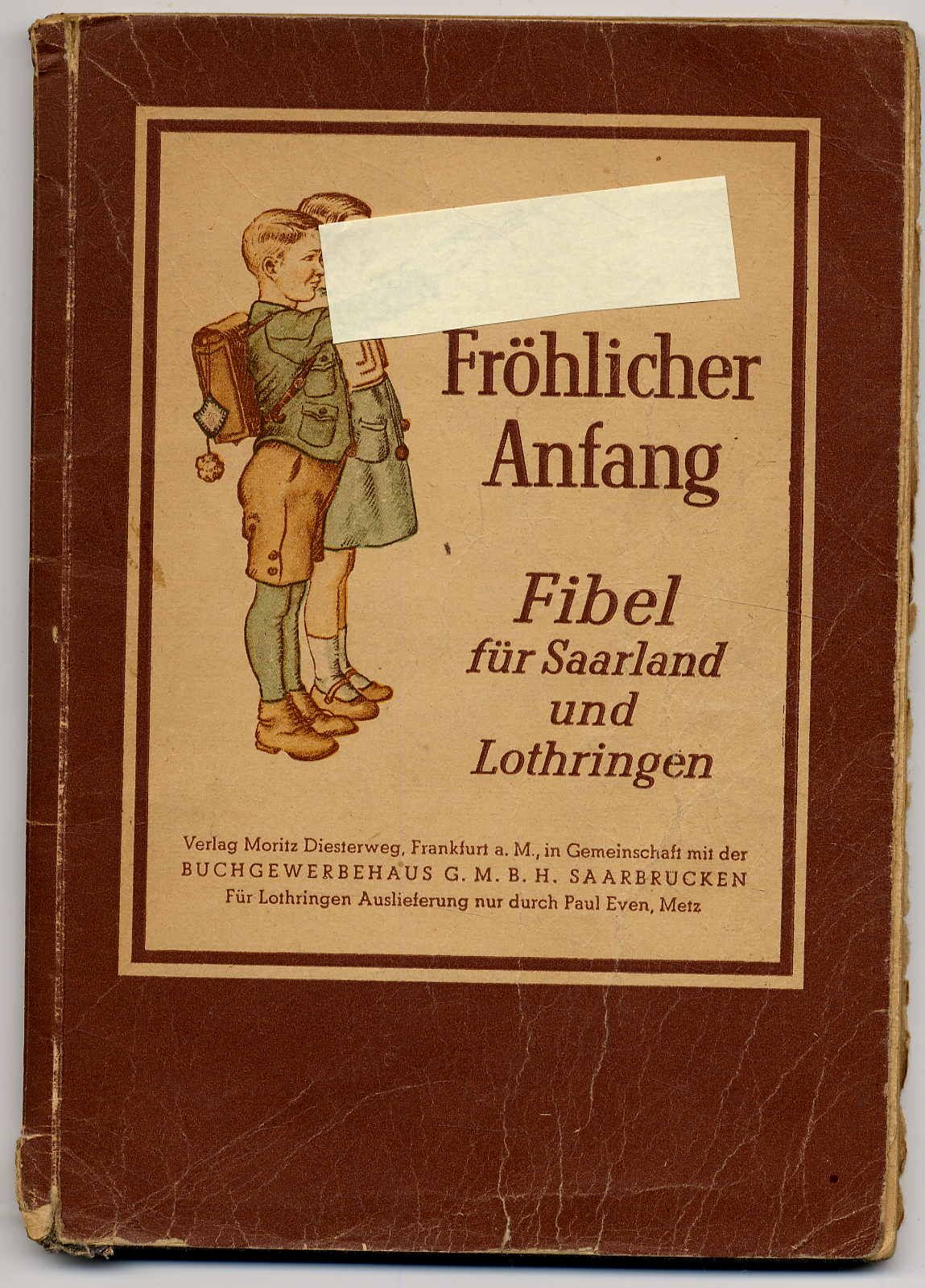 Eckhardt, Karl und Adolf Lüllwitz: Fröhlicher Anfang. Ein erstes Lesebuch. Ausgabe für Saarland und Lothringen. Frankfurt, Moritz Diesterweg, 1942. Ca. 23 x 15,5 cm. 84 Seiten. Mit zahlreichen, teils farbigen Bildern von Else Wenz-Vietor u.a. Farbig illustrierter Orig.-Karton. Sehr seltene regionale Variante für das Saarland und Lothringen der bekannten Fibel mit den Illustrationen von Wenz-Vietor. Einband bestoßen, Rücken mit kleineren Fehlstellen. Vorsätze am Falz mit Leinenstreifen verstärkt. Beim Titelblatt fehlt das obere Drittel (Textverlust der Titelzeile „Fröhlicher Anfang“). Einige Blätter mit Eckabriss (hier jedoch ohne Textverlust). Seiten gebräunt, teils fingerfleckig, Schnitt und die letzten Blätter fleckig, das letzte Blatt auch angerändert. Mit den für die Zeit typischen nationalsozialistischen Beiträgen. Das Titelbild zeigt eine fotografische Abbildung, bei der ein Mädchen dem „Führer“ einen Blumenstrauß überreicht. „Im Text „Horst hilft dem Führer“ wird gesondert erwähnt, dass das Sammeln von Altwaren durch Kinder dem Wunsch des Führers entspricht.“ (Thiele: Beitrag der Fibeln des Dritten Reiches, Fibel Nr. 21) und in einem Gedicht marschiert der „Hanselmann“ als Soldat. Wenn die Soldaten durch die Stadt marschieren, „öffnen die Mädchen die Fenster und die Türen! Und alle winken den Soldaten zu … Viele haben das Eiserne Kreuz. Sie waren im Krieg in Rußland.“ Zum Schluss hin Erzählungen mit regionalem Bezug, z.B. „In der Bergmannsiedlung“ oder „Auf dem Kohlenkahn durch das schöne Lothringen – Ein Ferienbrief“. Für jede Fibelsammlung – trotz der Mängel – ein wichtiges zeitgeschichtliches Dokument mit regionalem Bezug.
