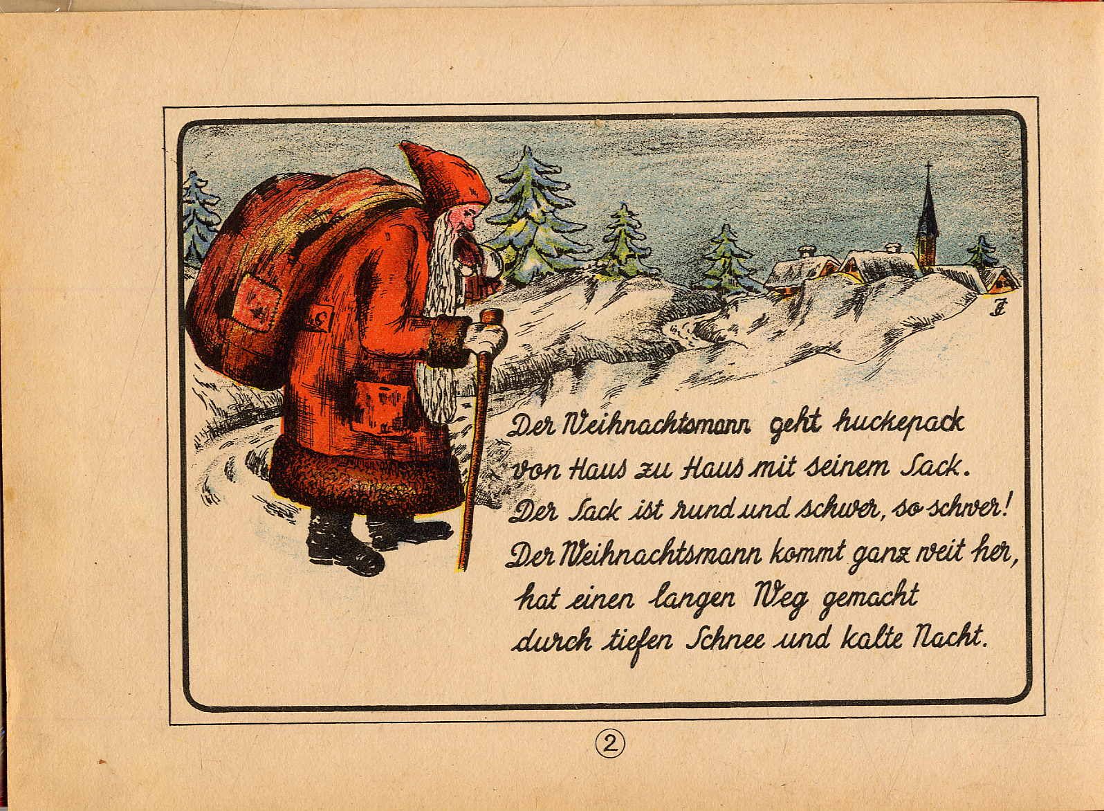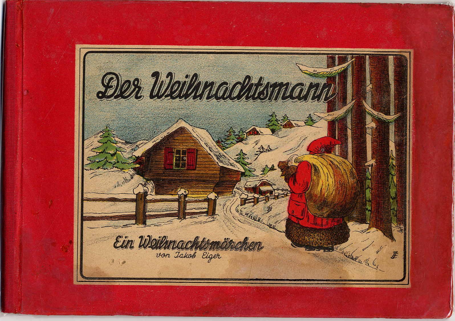 Eiger, Jakob: Ein Weihnachtsmärchen. Bingen, Rhein-Nahe-Verlag, 1946. Querformat, ca. 17 x 24,5 cm. 19 Seiten. Mit zahlreichen farbigen Illustrationen. Farbig illustr. Orig.-Halbleinenband. Muck II, 7038. Klammerung leicht angerostet. „Der Weihnachtsmann geht huckepack – von Haus zu Haus mit seinem Sack. … Der Weihnachtsmann, der an alle gedacht, hat auch den Tieren was mitgebracht – und füttert nun draußen im hohen Schnee – den Fuchs und die Hasen, den Bär und das Reh.“ Gutes Exemplar.