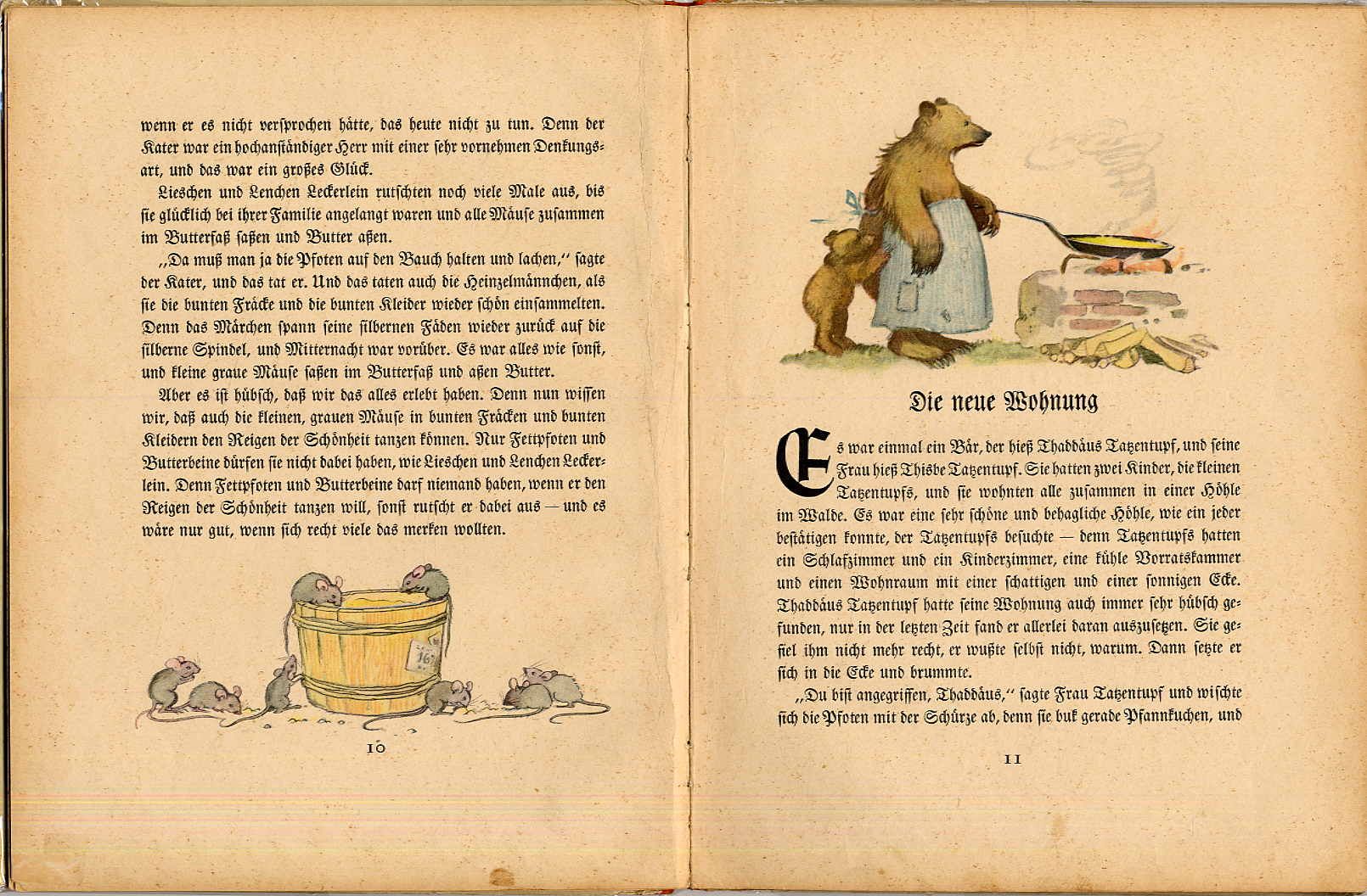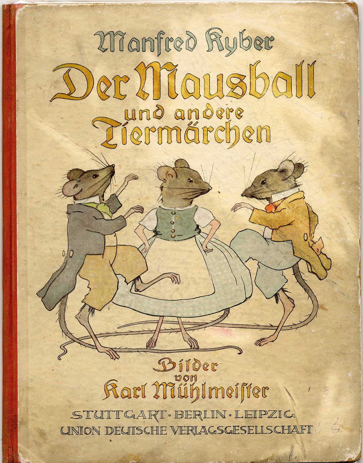 Kyber, Manfred: Der Mausball und andere Tiermärchen. Stuttgart u.a., Union Deutsche Verlagsgesellschaft, Ca. 27 x 20,5 cm. 28 Seiten. Mit farbigen, teils ganzseitigen Bildern von Karl Mühlmeister. Farbig illustr. Orig.-Halbleinenband. Klotz 3860/19. Erste Auflage. Eimband angestaubt und fleckig. Seitenränder etwas fingerfleckig. Mit hübschen Vorsatzpapieren (Katzen und Mäuse). Mit drei Märchen: Der Mausball; Die neue Wohnung; die geborgte Krone.