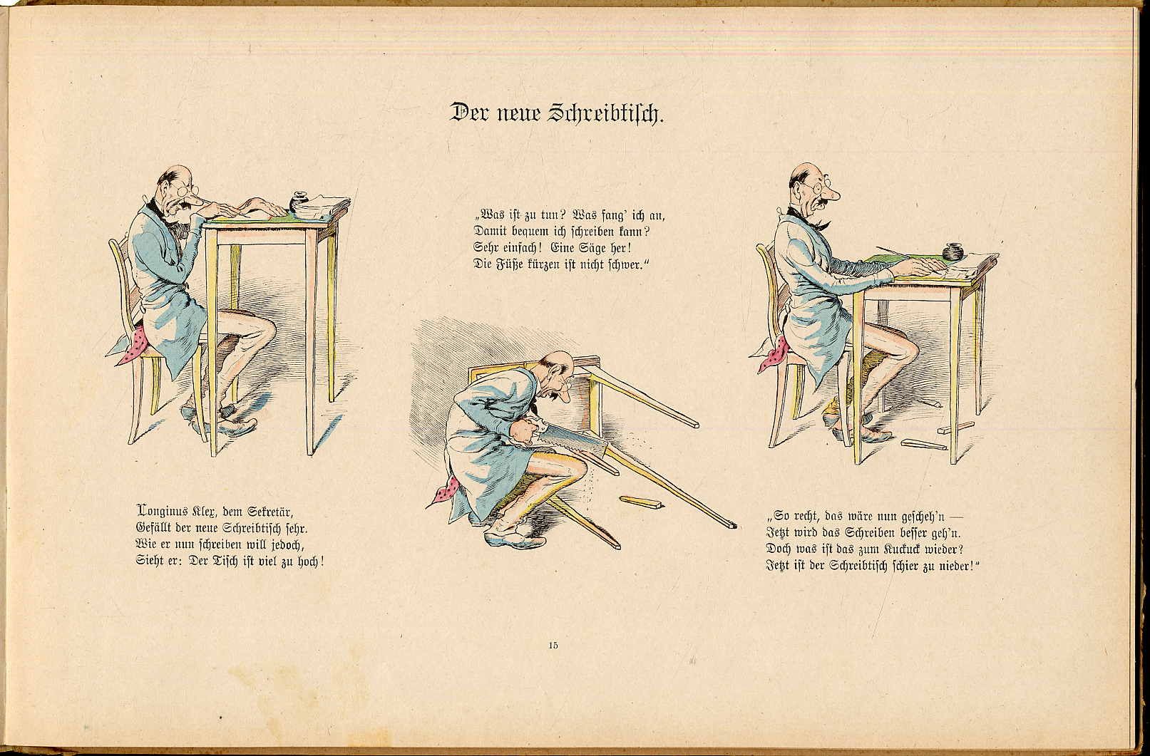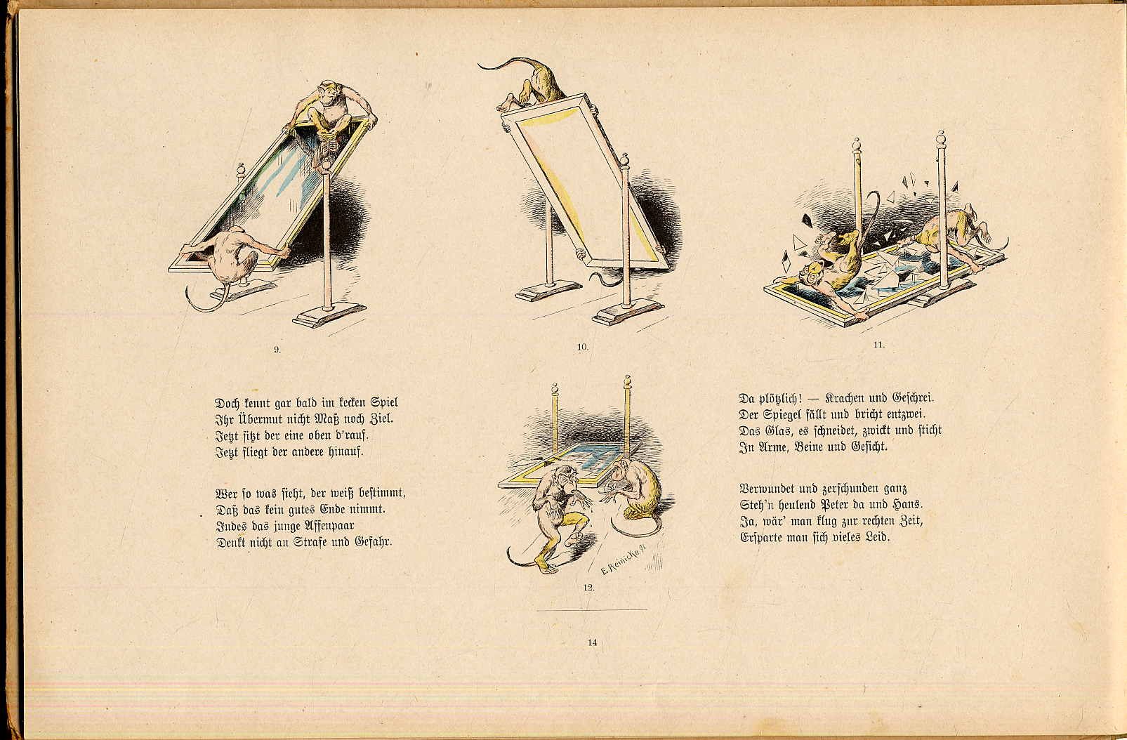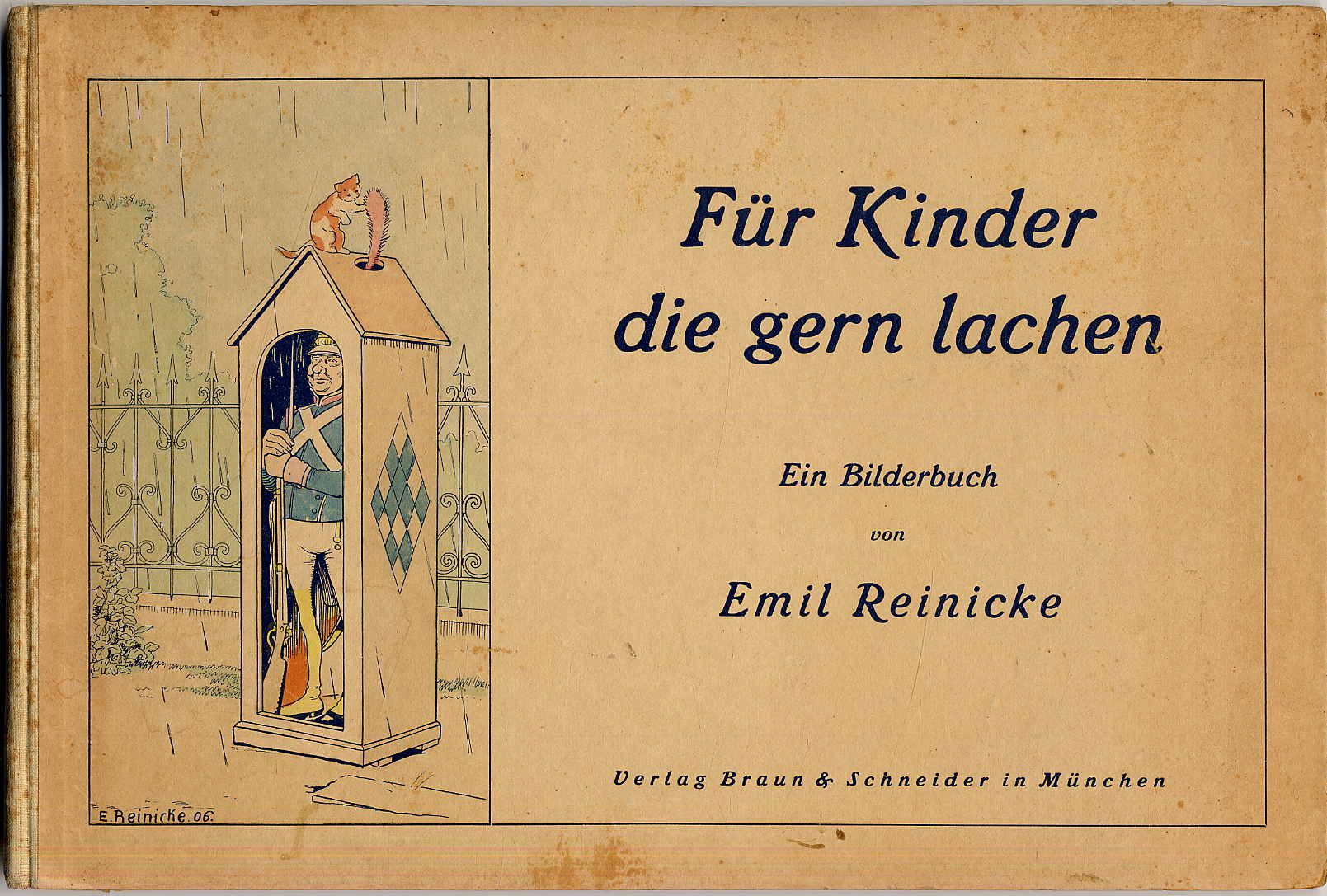 Reinicke, E[mil]: Für Kinder, die gern lachen. Ein Bilderbuch. München, Braun & Schneider Vlg., um 1910. 40 Seiten. Mit farbigen Illustrationen von Emil Reinicke. Farbig illustr. Orig.-Pappband. Ries 800,5. Einband und Rücken etwas stockfleckig. Enthält 19 Bildergeschichten, sie waren größtenteils vorher in den Münchener Bilderbogen erschienen.