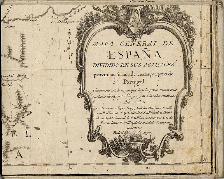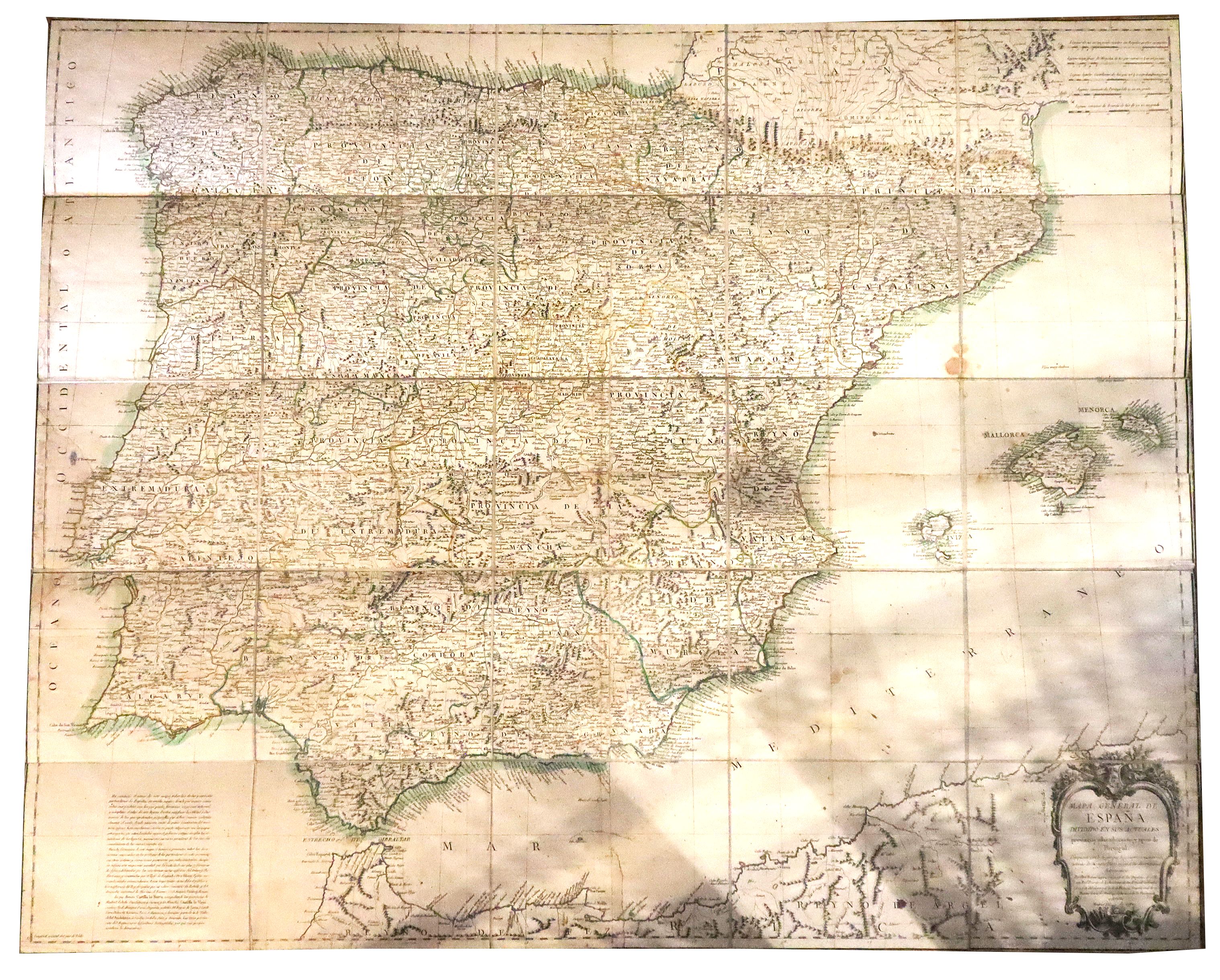 Lopez, Tomás: Mapa General de Espana, dividido en sus actuales provincias, islas adacentes y reyno de Portugal. Compuesto con lo mejor que hay impreso, manuscrito, noticias de sus naturales, y sujeto á las observaciones Astronomicas. Por Tomas Lopez, Geógrafo de los Dominios de S.M. con Real Decreto de la Academia de San Fernando individuo de merito, del número de la de la Historia, honorario de la de Buenas letras de Sevilla, y de las sociedades Vascongadas y Asturias. Madrid, 1792. Ca. 83 x 101 cm Teilcolorierte Kupferstichkarte, 25 Segmente auf Leinen aufgezogen. Gefaltet in kartoniertem Umschlag der Zeit und in einem kartonierten Schuber (dieser am Rand mit Leinenstreifen verstärkt). Etwas braunfleckig, ein kleiner Einriss hinterlegt. Umfasst die Iberische Halbinsel, die Balearen und die nordafrikanische Küste. Mit einer Fülle von Ortsnamen. Die Karte entstand während der Regierungszeit Karl IV (1788-1808). López (1730-1802) war ein bedeutender spanischer Kartograf des späten 18. Jahrhunderts. Karl III. betraute ihn mit der Leitung des neu geschaffenen Cabinete de Geografia. Er erstellte bedeutende regionale Karten. Seltene Karte. – Bitte beachten Sie: Aufgrund der EU-Verpackungsverordnung ist ein Versand an eine Privatanschrift in Spanien oder Portugal leider nicht möglich.