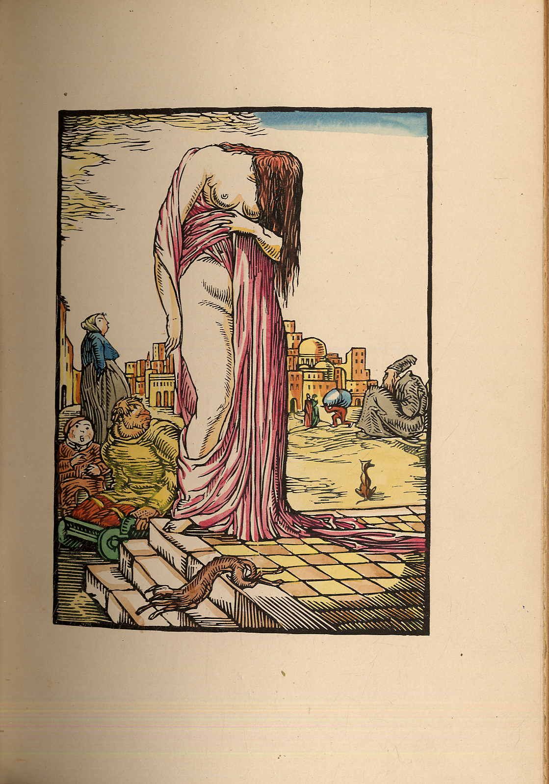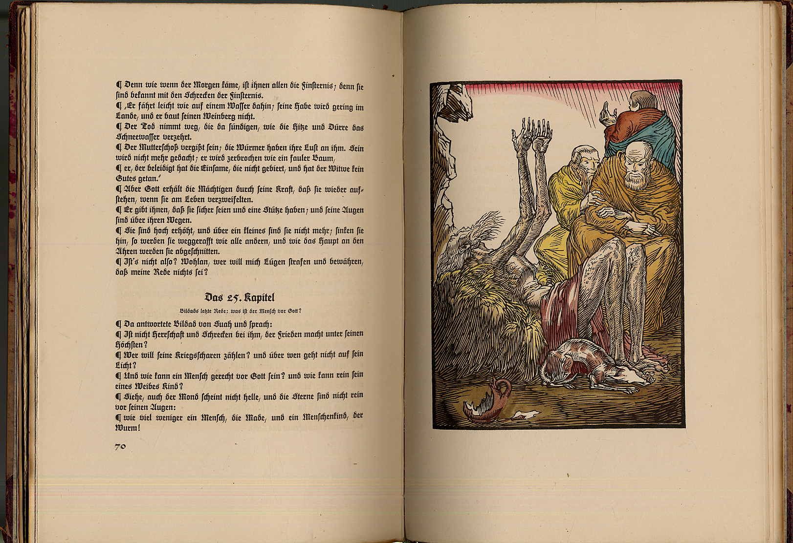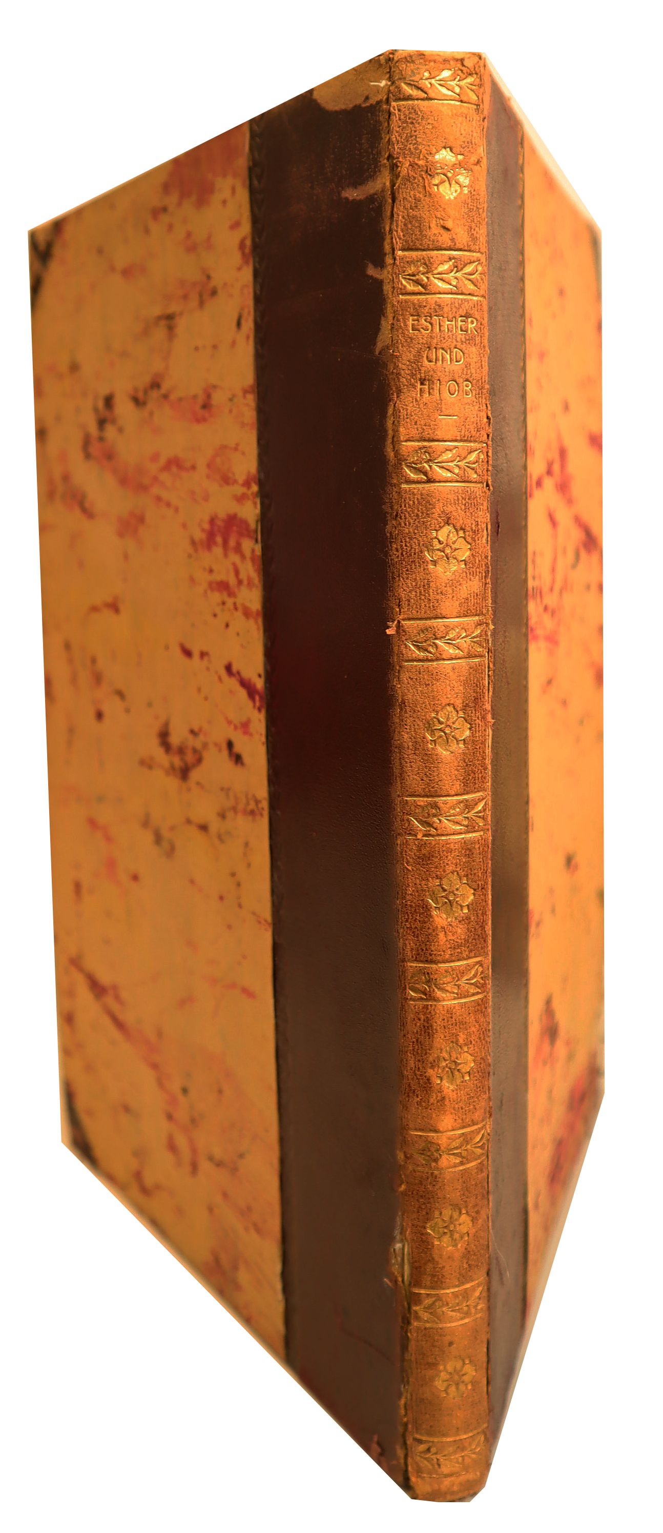 Goldschmitt – Das Buch Esther und das Buch Hiob. München, Hans von Weber, 1918. Ca. 28 x 19 cm. 102 S., (1) Seite. Mit 8 ganzseitigen colorierten Urholzschnitten von Bruno Goldschmitt. Halblederband der Zeit mit Rückengoldprägung. Aus der Reihe: Die erzählenden Bücher des Alten Testaments, erster Band. Zehnter Dreiangeldruck. Exemplar L/LXXV. Rodenberg 417,10. Einbandkanten und Rücken bestoßen, Einband mit kleiner Fehlstelle im Überzugspapier. Rückenleder geklebt, innen sauber und gut. „Höchstens 75 von I bis höchstens LXXV numerierte Stücke der Vorzugs-Ausgabe wurden auf Van Gelder Velin abgezogen, einige davon hat der Künstler mit Wasserfarben ausgemacht.“ Breitrandiges, unbeschnittenes Exemplar. Im Impressum von Goldschmitt eigenhändig signiert.