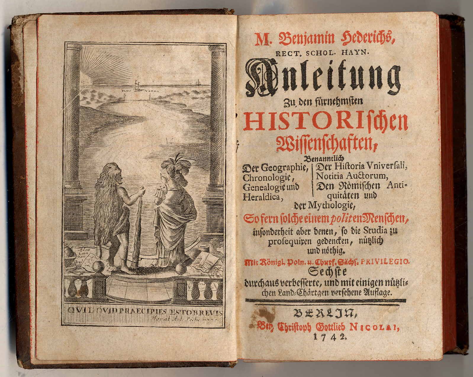 Hederich, Benjamin: Anleitung Zu den fürnehmsten Historischen Wissenschaften, Benanntlich Der Geographie, Der Historia Universali, Chronologie, Notitia Auctorum, Genealogie und Heraldik, Den Römischen Antiquitäten und der Mythologie. So fern solche einem politen Menschen, insonderheit aber denen, so die Studia zu prosequiren gedencken, nützlich und nöthig. Sechste, durchaus verbesserte, und mit einigen nützlichen Land-Chärten versehene Auflage. Berlin, Christoph Gottlieb Nicolai, 1742. Ca. 17,5 x 10,5 cm. (16) S., 512 S., (16) Seiten. Mit gestochenem Frontispiz, 3 appentafeln und 6 gefalteten Karten. Ledereinband der Zeit mit geprägtem Rückenschild. Rücken und Hinterdeckel mit Abrieb. Seiten teils etwas gebräunt bzw. stockfleckig.
