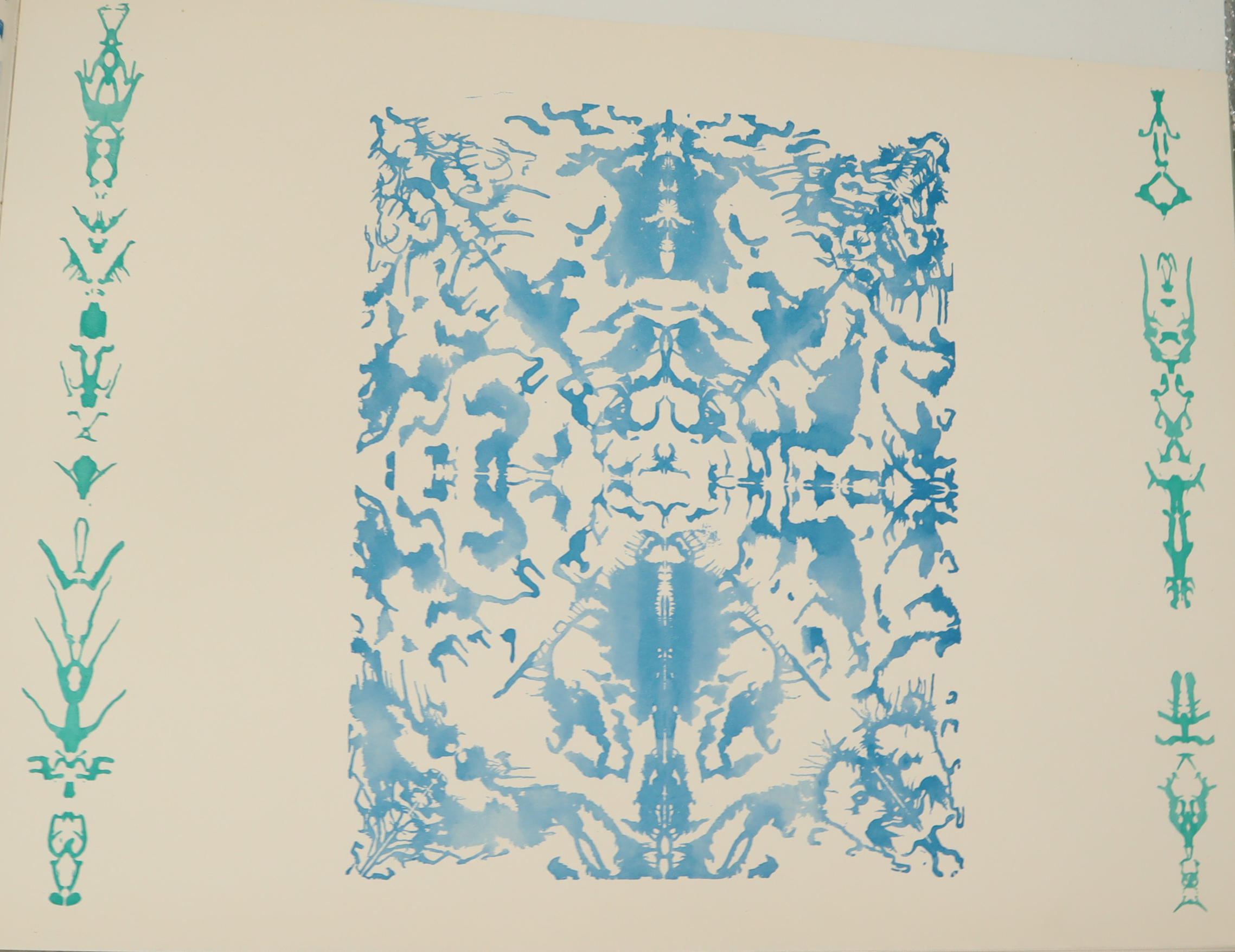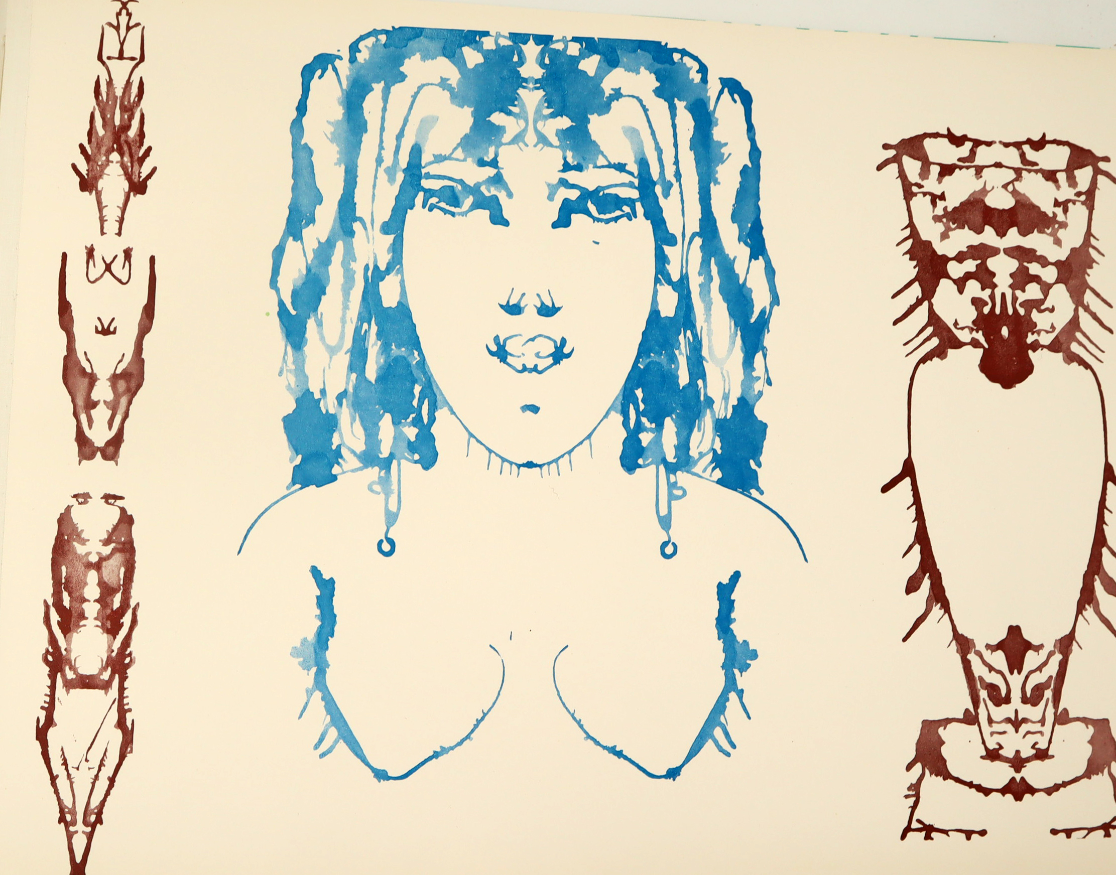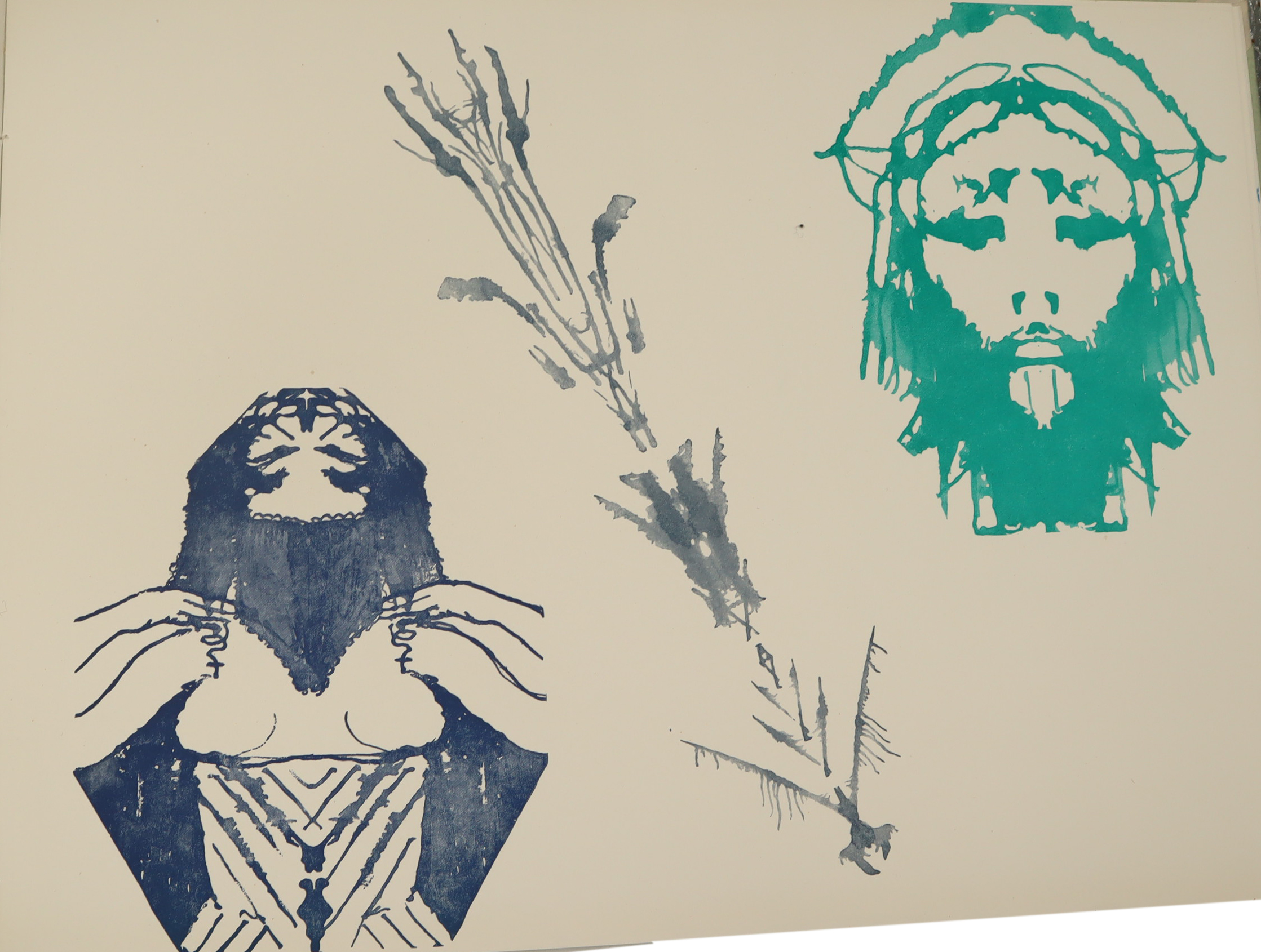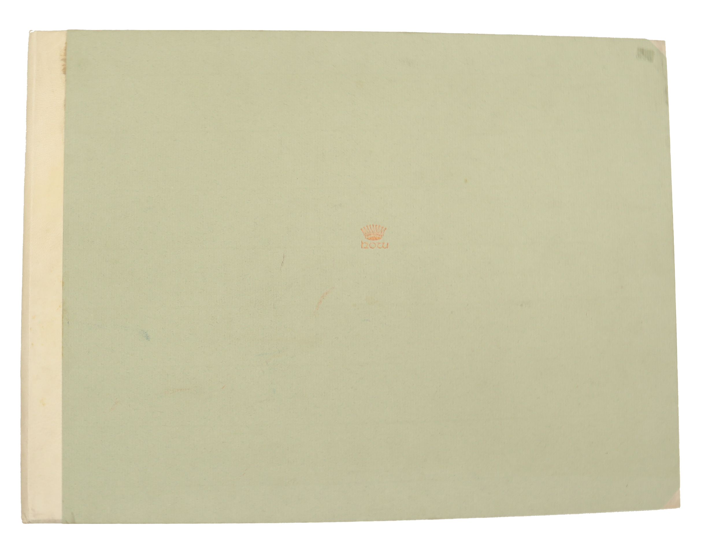 Ottolenghi, Astolfo (Hrsg.): Ranken und Masken (Rückentitel). Ein Bilderbuch in Handdrucktechnik von Hertha Ottolenghi-Wedekind. Davos, Druck in der Graphischen Werkstätte Buchel, 1957. Querformat, ca. 30 x 41 cm. (58) Seiten mit farbigen Illustrationen sowie einer montierten fotografischen Abbildung. Orig.-Halbpergamentband. „Dem Gedächtnis meiner lieben Mutter gesammelt und herausgegeben“. Exemplar Nr. 20 einer wohl sehr kleinen Auflage. Auf dem Vorsatz mit handschriftlicher Widmung, signiert „Astolfo“, datiert 15. Juni 1969. Einband minimal fleckig, sonst gutes Exemplar. Zeigt Figürliches und „leicht hingeworfene“ Ornamente der Künstlerin Herta Ottolenghi-Wedekind (1885-1953). Herta Ottolenghi Wedekind, eine gebürtige Berlinerin, zählt zu den wichtigsten Kunstgewerblerinnen der 1920er und 1930er Jahre. Um 1920 verfeinerte sie ein Verfahren zur Übertragung abstrakter, spiegelsymmetrischer Motive auf Textilien, das ihr große Bekanntheit einbrachte.