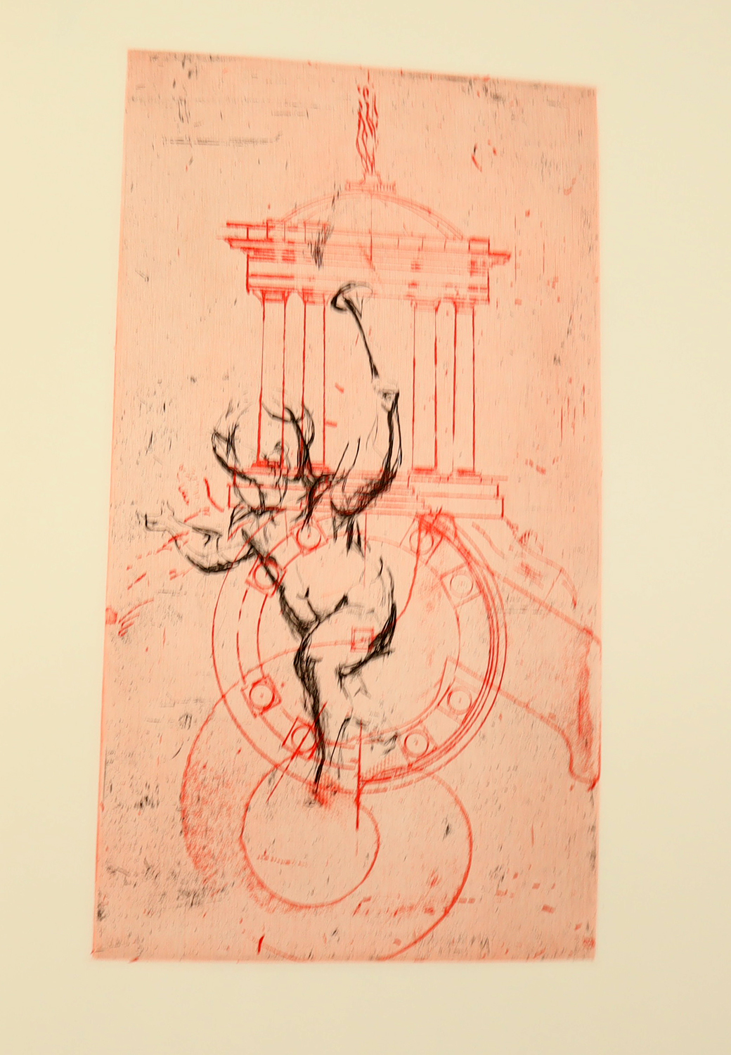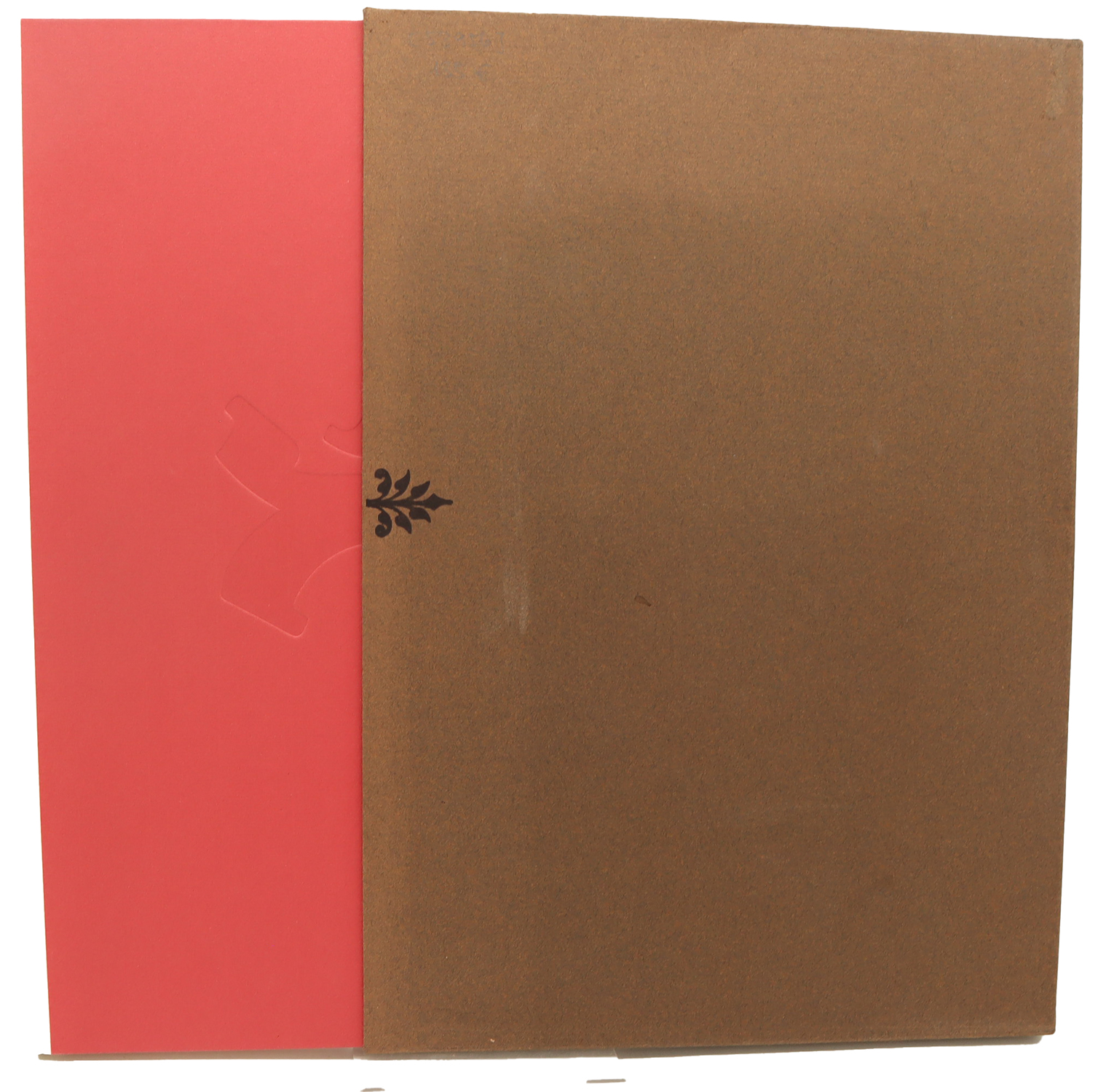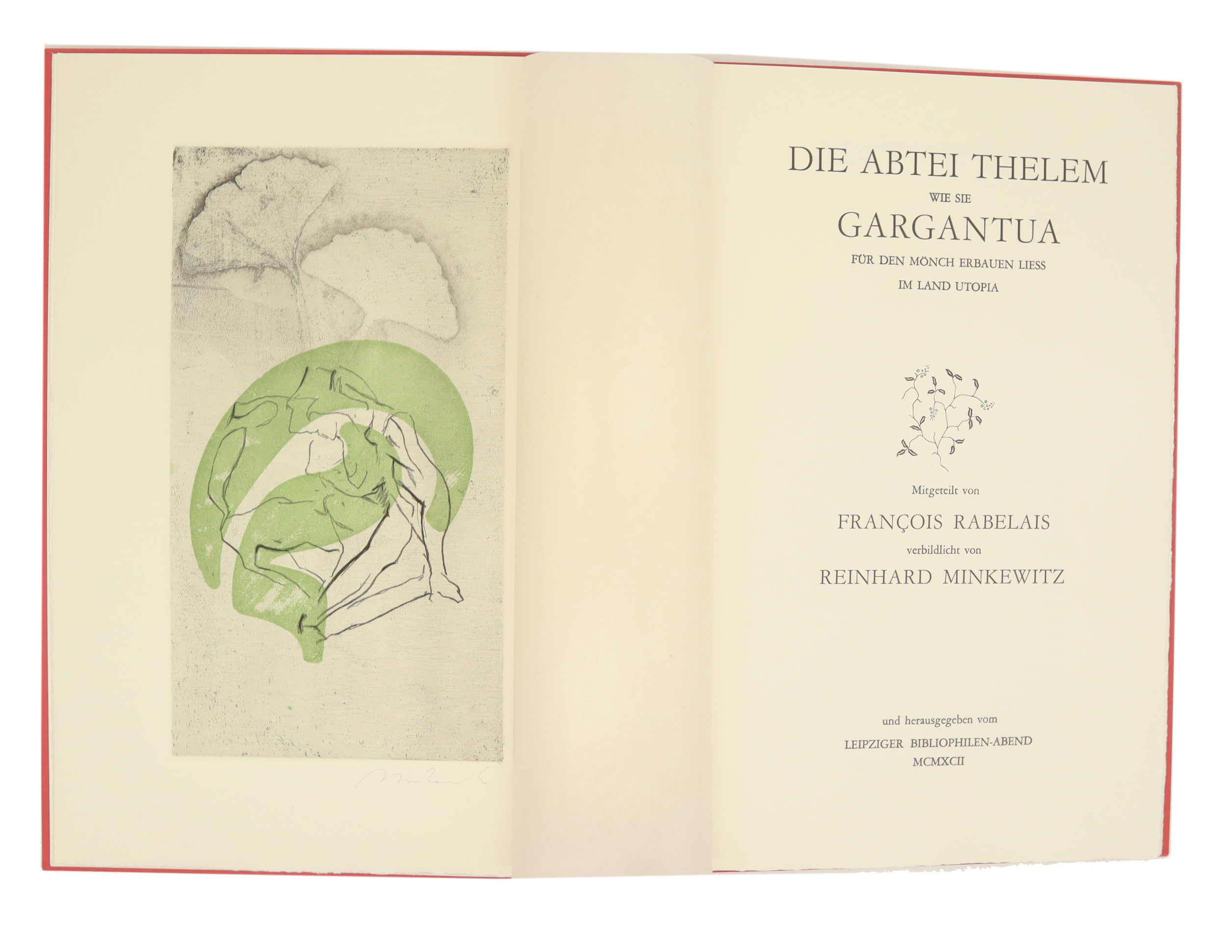 Rabelais, François: Die Abtei Thelem wie sie Gargantua für den Mönch erbauen liess im Land Utopia. Verbildlicht von Reinhard Minkewitz. Hrsgg. vom Leipziger Bibliophilen-Abend. Leipzig, 1992. Ca. 39 x 28 cm. 46 Seiten. Mit drei Farbradierungen, sechs Typographiken aus einer Holz-Frakturschrift und einer Nachbemerkung von Reinhard Minkewitz. Roter Orig.-Halbpergamentband, mit braunem Original-Schuber. Exemplar 57/150, im Druckvermerk von Minkewitz signiert. Herausgegeben im Auftrag des Leipziger Bibliophilen-Abends von Herbert Kästner. Der Satz erfolgte im Bleisatz in der Garamond-Antiqua sowie einer fetten Fraktur. Gedruckt auf Hahnemühle-Büttenpapier Alt Montjoie. Handeinband von Katrin Adler, Leipzig.