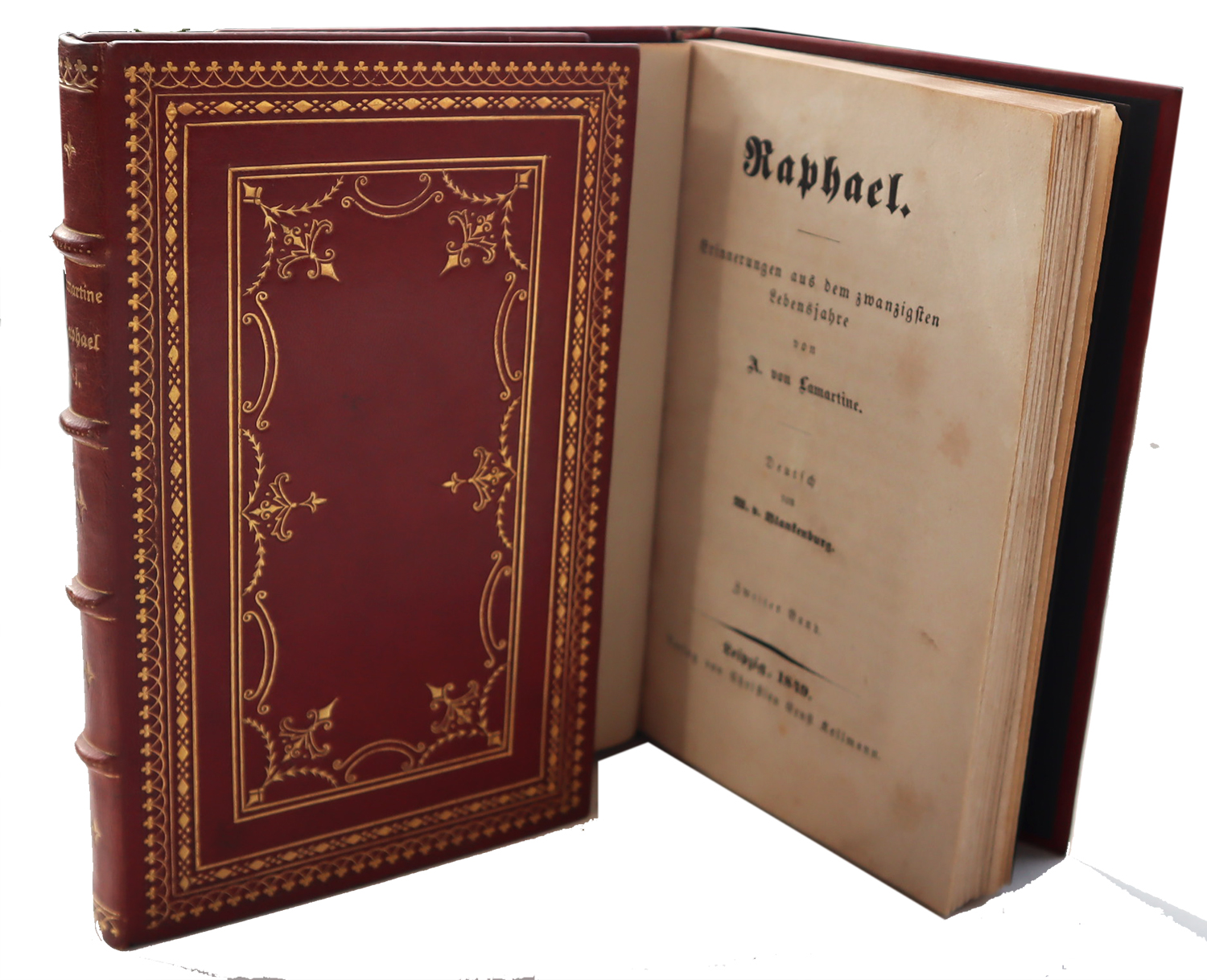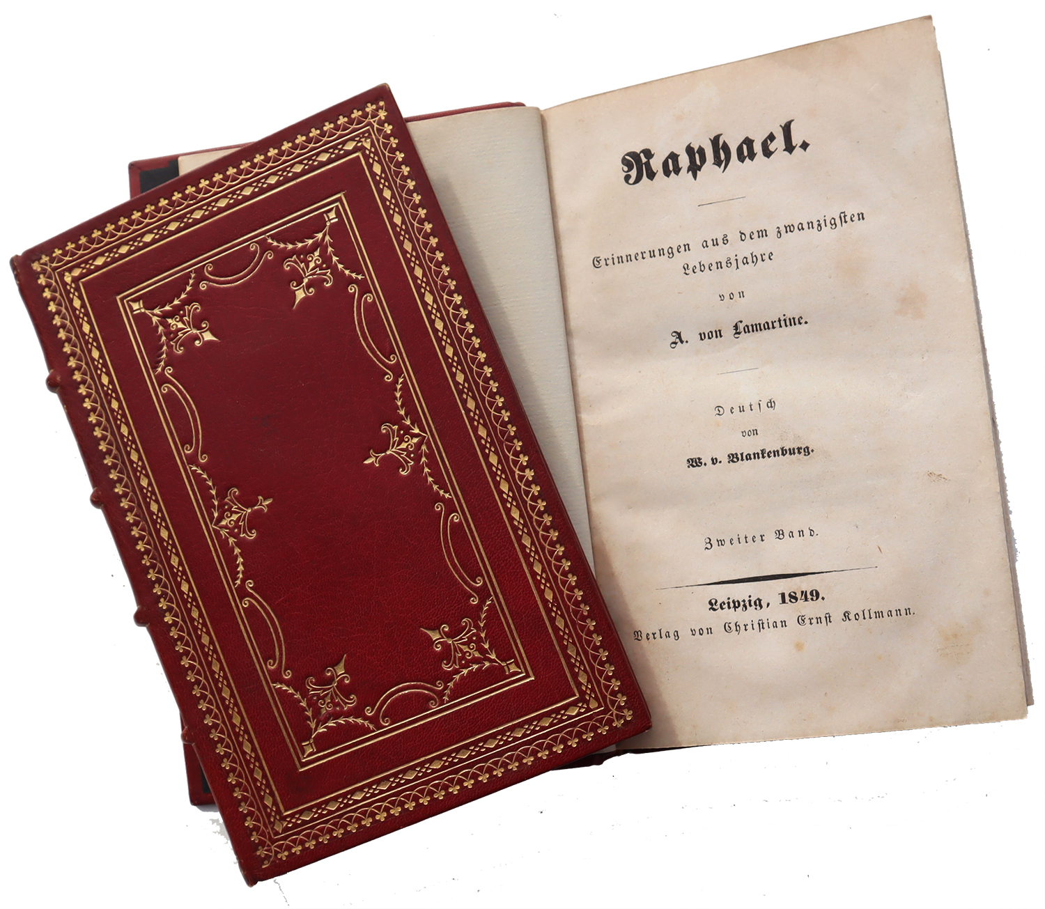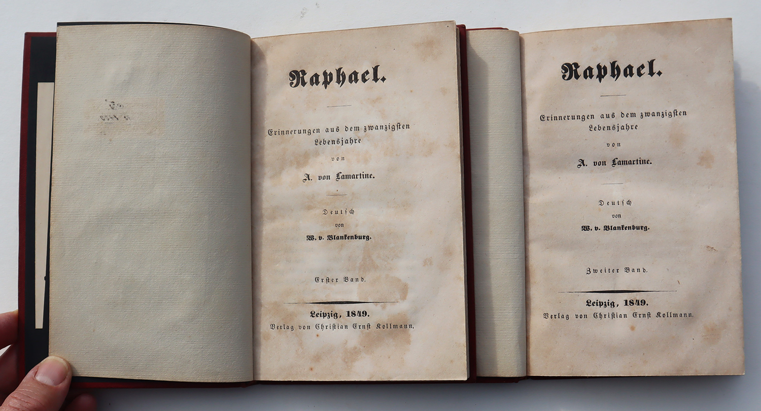Lamartine, A[lphone] de: Raphael. Erinnerungen aus dem zwanzigsten Lebensjahr. Deutsch von W. v. Blankenburg. 2 Bände. Leipzig, Christian Ernst Kollmann, 1849. Ca. 16,5 x 11 cm. 190 S., (4) Seiten; 206 S., (2) Seiten. Rote Maroquineinbände der Zeit mit reicher Goldprägung. Kopfgoldschnitt. Mit Exlibris und kleiner Besitzmarke (diese auf Vorsatz). Seiten gebräunt bzw. teils braunfleckig. Erste deutsche Ausgabe, im Jahr der französischen Originalausgabe erschienen. Sehr dekorative Einbände.