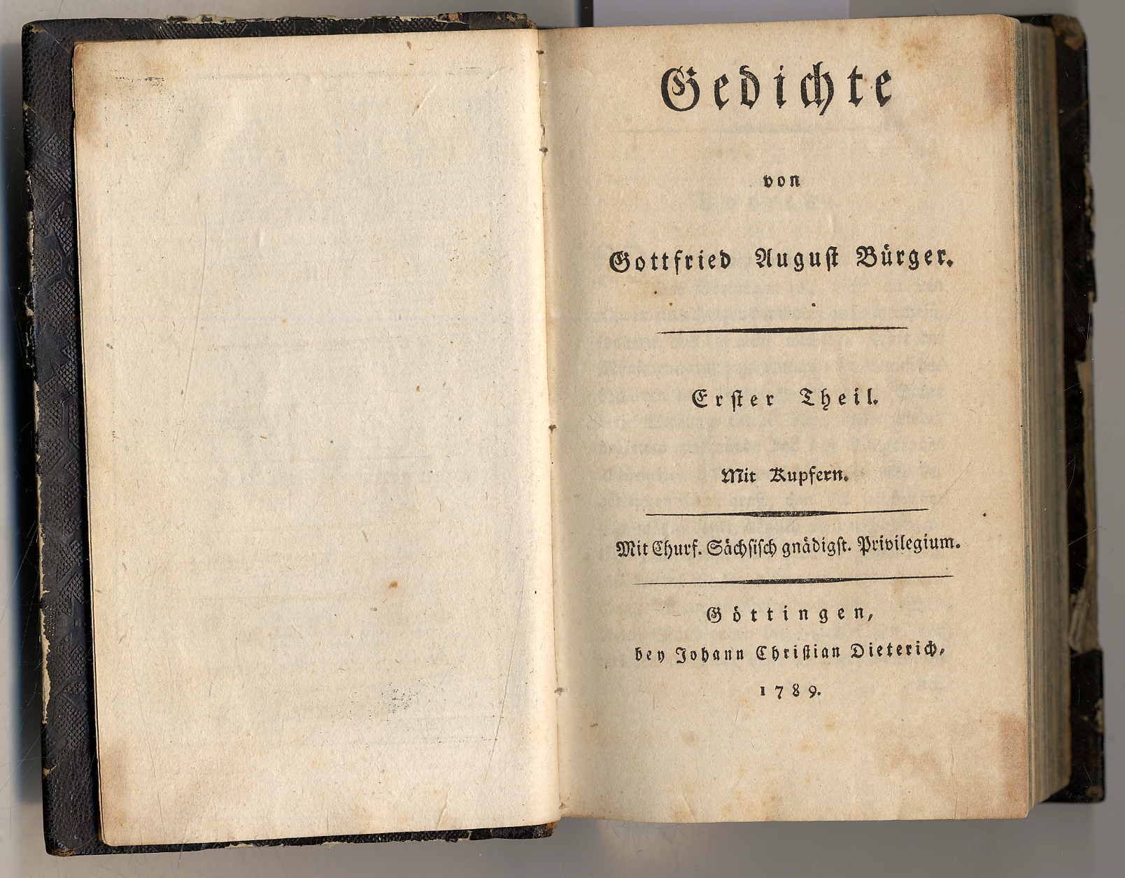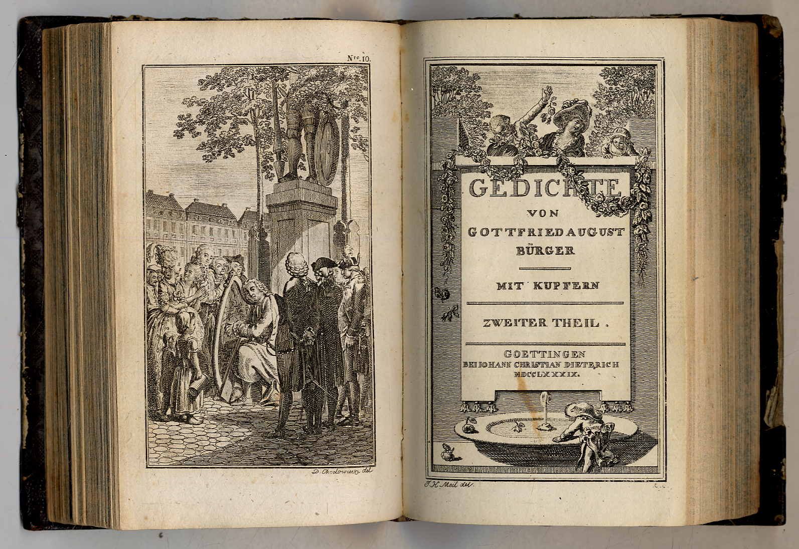 Bürger, Gottfried August: Gedichte. Erster und Zweiter Theil in einem Band. Göttingen, Johann Christian Dieterich, 1789. Ca. 14,5 x 9,5 cm. Porträt-Frontispiz, illustrierter Titel, 46 S., 272 Seiten, mit 2 ganzseitigen Kupferstichen und 2 Vignetten; Frontispiz, illustrierter Titel, 30 S., (14) Seiten Subskribenten-Verzeichnis, 296 Seiten, mit 7 ganzseitigen Kupferstichen und 2 Vignetten. Illustrationen nach Daniel Chodowiecki und Johann Heinrich Meil. VD18: 80000924 und VD18: 80000916; Goedeke IV/1, 1011, 54; WG 15. Einbandkanten bestoßen, Einband berieben. Seiten teils gebräunt bzw. stockfleckig. Erste Auflage dieser Ausgabe. Ein Teil der Gedichte erschien zuvor in Zeitschriften und Almanachen sowie in Bürgers erster Sammlung: Gedichte, Göttingen (Dieterich) 1778. Unter den Subskribenten finden sich auch Gleim und Klopstock.
