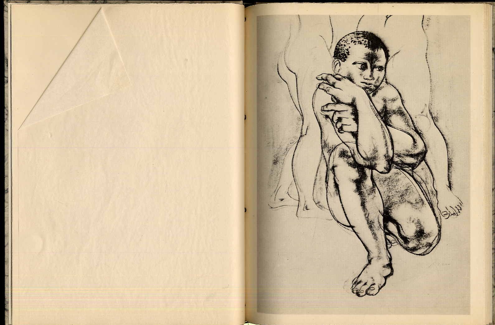 Erni, Hans und André Bonnard: Verheißung des Menschen. Deutsch von Stephan Hermlin. Berlin, Verlag Volk und Welt, 1957. Ca. 27,5 x 22,5 cm. (36) Blatt. Mit zahlreichen Illustrationen in Lichtdruck nach Kohlezeichnungen von Hans Erni. Orig.-Halbpergamentband, Blockbuchbindung. Mit dem Original-Halbpergamentschuber mit Stäbchenverschluss. Eins von 400 handnummerierten Exemplaren auf Büttenpapier (GA 2400). Erste Ausgabe der Übertragung von Hermlin, EA WG 34. Gutes Exemplar.