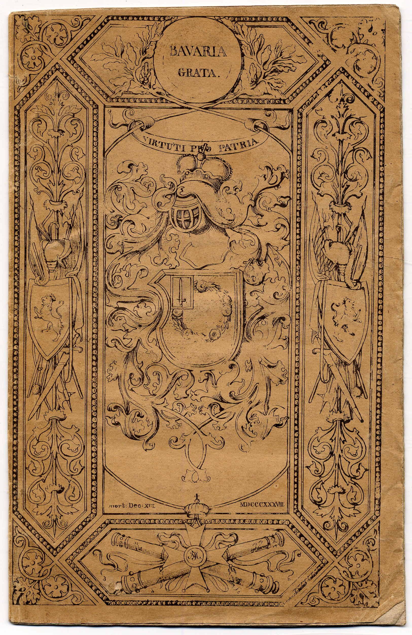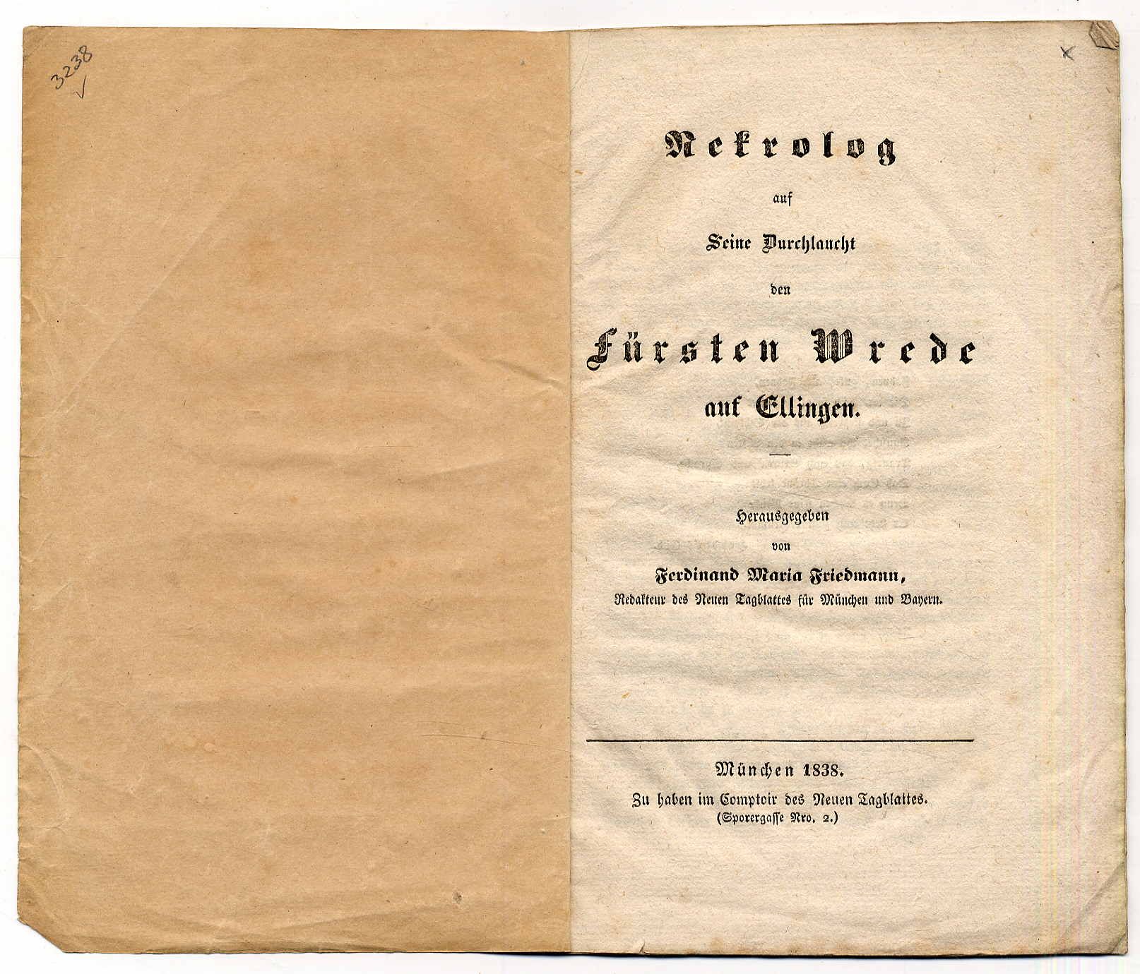 Friedmann, Ferdinand Maria (Hrsg.): Nekrolog auf Seine Durchlaucht Fürsten Wrede auf Elllingen. München, zu haben im Comptoir des Neuen Tagblattes, 1838. Ca. 20,5 x 13,5 cm. 16 Seiten. Illustrierte Originalbroschur. Seitenränder etwas knittrig. Dekorative Originalbroschur. Carl Philipp Fürst von Wrede (1767-1838) war ein bayerischer Generalfeldmarschall, Diplomat und Politiker, der maßgeblich daran beteiligt war, Bayern 1813 durch den Vertrag von Ried in das Lager der Alliierten gegen Napoleon zu führen. Er hatte eine bedeutende militärische Laufbahn und wurde für seine Verdienste unter anderem mit dem Fürstentitel und Besitztümer, darunter das Schloss Ellingen ausgzeichnet. Nach dem Krieg engagierte er sich politisch in Bayern und war erster Präsident der Kammer der Reichsräte.